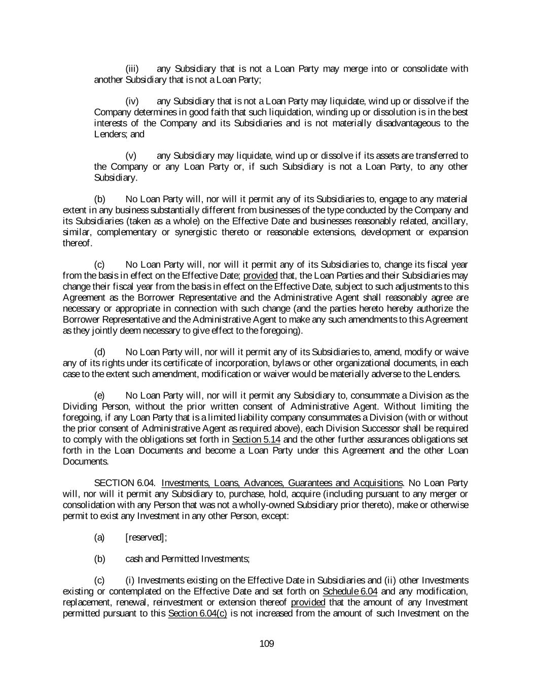 (iii) any Subsidiary that is not a Loan Party may merge into or consolidate with another Subsidiary that is not a Loan Party; (iv) any Subsidiary that is not a Loan Party may liquidate, wind up or dissolve if the Company determines in good faith that such liquidation, winding up or dissolution is in the best interests of the Company and its Subsidiaries and is not materially disadvantageous to the Lenders; and (v) any Subsidiary may liquidate, wind up or dissolve if its assets are transferred to the Company or any Loan Party or, if such Subsidiary is not a Loan Party, to any other Subsidiary. (b) No Loan Party will, nor will it permit any of its Subsidiaries to, engage to any material extent in any business substantially different from businesses of the type conducted by the Company and its Subsidiaries (taken as a whole) on the Effective Date and businesses reasonably related, ancillary, similar, complementary or synergistic thereto or reasonable extensions, development or expansion thereof. (c) No Loan Party will, nor will it permit any of its Subsidiaries to, change its fiscal year from the basis in effect on the Effective Date; provided that, the Loan Parties and their Subsidiaries may change their fiscal year from the basis in effect on the Effective Date, subject to such adjustments to this Agreement as the Borrower Representative and the Administrative Agent shall reasonably agree are necessary or appropriate in connection with such change (and the parties hereto hereby authorize the Borrower Representative and the Administrative Agent to make any such amendments to this Agreement as they jointly deem necessary to give effect to the foregoing). (d) No Loan Party will, nor will it permit any of its Subsidiaries to, amend, modify or waive any of its rights under its certificate of incorporation, bylaws or other organizational documents, in each case to the extent such amendment, modification or waiver would be materially adverse to the Lenders. (e) No Loan Party will, nor will it permit any Subsidiary to, consummate a Division as the Dividing Person, without the prior written consent of Administrative Agent. Without limiting the foregoing, if any Loan Party that is a limited liability company consummates a Division (with or without the prior consent of Administrative Agent as required above), each Division Successor shall be required to comply with the obligations set forth in Section 5.14 and the other further assurances obligations set forth in the Loan Documents and become a Loan Party under this Agreement and the other Loan Documents. SECTION 6.04. Investments, Loans, Advances, Guarantees and Acquisitions. No Loan Party will, nor will it permit any Subsidiary to, purchase, hold, acquire (including pursuant to any merger or consolidation with any Person that was not a wholly-owned Subsidiary prior thereto), make or otherwise permit to exist any Investment in any other Person, except: (a) [reserved]; (b) cash and Permitted Investments; (c) (i) Investments existing on the Effective Date in Subsidiaries and (ii) other Investments existing or contemplated on the Effective Date and set forth on Schedule 6.04 and any modification, replacement, renewal, reinvestment or extension thereof provided that the amount of any Investment permitted pursuant to this Section 6.04(c) is not increased from the amount of such Investment on the 109