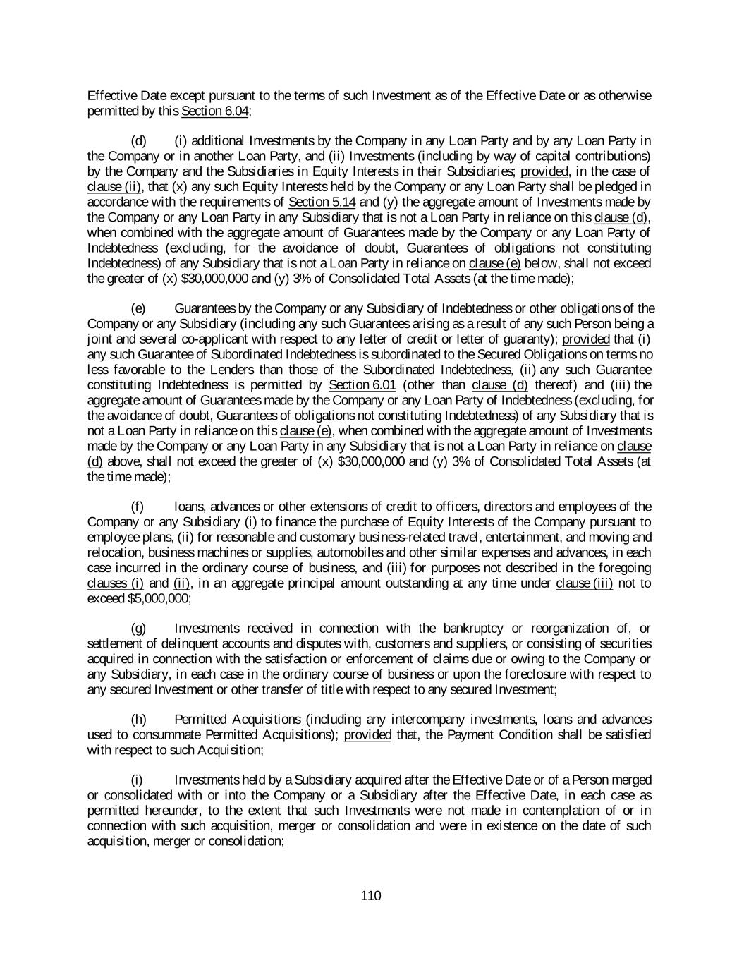 Effective Date except pursuant to the terms of such Investment as of the Effective Date or as otherwise permitted by this Section 6.04; (d) (i) additional Investments by the Company in any Loan Party and by any Loan Party in the Company or in another Loan Party, and (ii) Investments (including by way of capital contributions) by the Company and the Subsidiaries in Equity Interests in their Subsidiaries; provided, in the case of clause (ii), that (x) any such Equity Interests held by the Company or any Loan Party shall be pledged in accordance with the requirements of Section 5.14 and (y) the aggregate amount of Investments made by the Company or any Loan Party in any Subsidiary that is not a Loan Party in reliance on this clause (d), when combined with the aggregate amount of Guarantees made by the Company or any Loan Party of Indebtedness (excluding, for the avoidance of doubt, Guarantees of obligations not constituting Indebtedness) of any Subsidiary that is not a Loan Party in reliance on clause (e) below, shall not exceed the greater of (x) $30,000,000 and (y) 3% of Consolidated Total Assets (at the time made); (e) Guarantees by the Company or any Subsidiary of Indebtedness or other obligations of the Company or any Subsidiary (including any such Guarantees arising as a result of any such Person being a joint and several co-applicant with respect to any letter of credit or letter of guaranty); provided that (i) any such Guarantee of Subordinated Indebtedness is subordinated to the Secured Obligations on terms no less favorable to the Lenders than those of the Subordinated Indebtedness, (ii) any such Guarantee constituting Indebtedness is permitted by Section 6.01 (other than clause (d) thereof) and (iii) the aggregate amount of Guarantees made by the Company or any Loan Party of Indebtedness (excluding, for the avoidance of doubt, Guarantees of obligations not constituting Indebtedness) of any Subsidiary that is not a Loan Party in reliance on this clause (e), when combined with the aggregate amount of Investments made by the Company or any Loan Party in any Subsidiary that is not a Loan Party in reliance on clause (d) above, shall not exceed the greater of (x) $30,000,000 and (y) 3% of Consolidated Total Assets (at the time made); (f) loans, advances or other extensions of credit to officers, directors and employees of the Company or any Subsidiary (i) to finance the purchase of Equity Interests of the Company pursuant to employee plans, (ii) for reasonable and customary business-related travel, entertainment, and moving and relocation, business machines or supplies, automobiles and other similar expenses and advances, in each case incurred in the ordinary course of business, and (iii) for purposes not described in the foregoing clauses (i) and (ii), in an aggregate principal amount outstanding at any time under clause (iii) not to exceed $5,000,000; (g) Investments received in connection with the bankruptcy or reorganization of, or settlement of delinquent accounts and disputes with, customers and suppliers, or consisting of securities acquired in connection with the satisfaction or enforcement of claims due or owing to the Company or any Subsidiary, in each case in the ordinary course of business or upon the foreclosure with respect to any secured Investment or other transfer of title with respect to any secured Investment; (h) Permitted Acquisitions (including any intercompany investments, loans and advances used to consummate Permitted Acquisitions); provided that, the Payment Condition shall be satisfied with respect to such Acquisition; (i) Investments held by a Subsidiary acquired after the Effective Date or of a Person merged or consolidated with or into the Company or a Subsidiary after the Effective Date, in each case as permitted hereunder, to the extent that such Investments were not made in contemplation of or in connection with such acquisition, merger or consolidation and were in existence on the date of such acquisition, merger or consolidation; 110