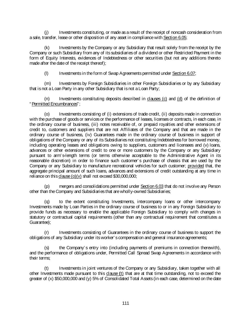 (j) Investments constituting, or made as a result of the receipt of noncash consideration from a sale, transfer, lease or other disposition of any asset in compliance with Section 6.05; (k) Investments by the Company or any Subsidiary that result solely from the receipt by the Company or such Subsidiary from any of its subsidiaries of a dividend or other Restricted Payment in the form of Equity Interests, evidences of Indebtedness or other securities (but not any additions thereto made after the date of the receipt thereof); (l) Investments in the form of Swap Agreements permitted under Section 6.07; (m) Investments by Foreign Subsidiaries in other Foreign Subsidiaries or by any Subsidiary that is not a Loan Party in any other Subsidiary that is not a Loan Party; (n) Investments constituting deposits described in clauses (c) and (d) of the definition of “Permitted Encumbrances”; (o) Investments consisting of (i) extensions of trade credit, (ii) deposits made in connection with the purchase of goods or services or the performance of leases, licenses or contracts, in each case, in the ordinary course of business, (iii) notes receivable of, or prepaid royalties and other extensions of credit to, customers and suppliers that are not Affiliates of the Company and that are made in the ordinary course of business, (iv) Guarantees made in the ordinary course of business in support of obligations of the Company or any of its Subsidiaries not constituting Indebtedness for borrowed money, including operating leases and obligations owing to suppliers, customers and licensees and (v) loans, advances or other extensions of credit to one or more customers by the Company or any Subsidiary pursuant to arm’s-length terms (or terms otherwise acceptable to the Administrative Agent in its reasonable discretion) in order to finance such customer’s purchase of chassis that are used by the Company or any Subsidiary to manufacture recreational vehicles for such customer; provided that, the aggregate principal amount of such loans, advances and extensions of credit outstanding at any time in reliance on this clause (o)(v) shall not exceed $30,000,000; (p) mergers and consolidations permitted under Section 6.03 that do not involve any Person other than the Company and Subsidiaries that are wholly-owned Subsidiaries; (q) to the extent constituting Investments, intercompany loans or other intercompany Investments made by Loan Parties in the ordinary course of business to or in any Foreign Subsidiary to provide funds as necessary to enable the applicable Foreign Subsidiary to comply with changes in statutory or contractual capital requirements (other than any contractual requirement that constitutes a Guarantee); (r) Investments consisting of Guarantees in the ordinary course of business to support the obligations of any Subsidiary under its worker’s compensation and general insurance agreements; (s) the Company’s entry into (including payments of premiums in connection therewith), and the performance of obligations under, Permitted Call Spread Swap Agreements in accordance with their terms; (t) Investments in joint ventures of the Company or any Subsidiary, taken together with all other Investments made pursuant to this clause (t) that are at that time outstanding, not to exceed the greater of (x) $50,000,000 and (y) 5% of Consolidated Total Assets (in each case, determined on the date 111