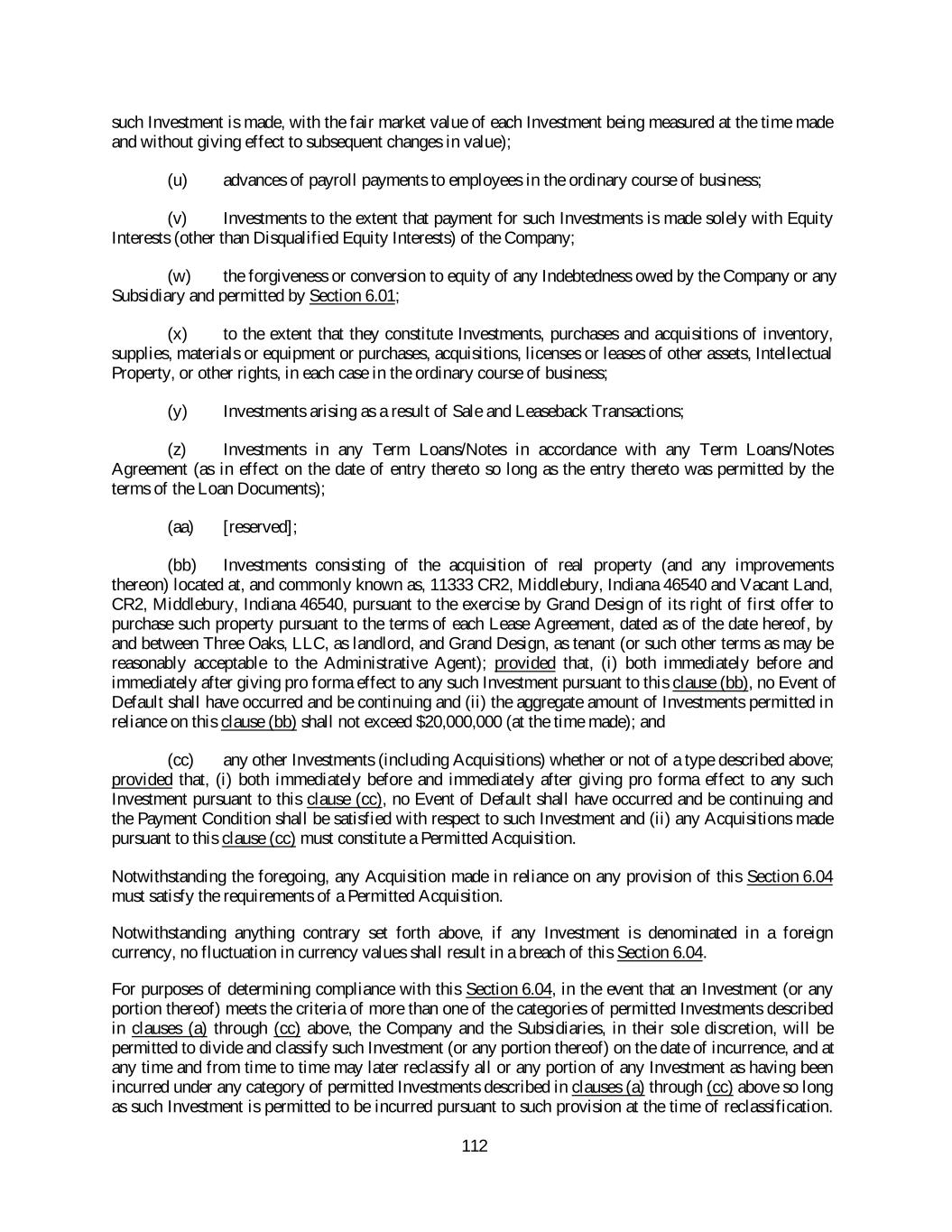 such Investment is made, with the fair market value of each Investment being measured at the time made and without giving effect to subsequent changes in value); (u) advances of payroll payments to employees in the ordinary course of business; (v) Investments to the extent that payment for such Investments is made solely with Equity Interests (other than Disqualified Equity Interests) of the Company; (w) the forgiveness or conversion to equity of any Indebtedness owed by the Company or any Subsidiary and permitted by Section 6.01; (x) to the extent that they constitute Investments, purchases and acquisitions of inventory, supplies, materials or equipment or purchases, acquisitions, licenses or leases of other assets, Intellectual Property, or other rights, in each case in the ordinary course of business; (y) Investments arising as a result of Sale and Leaseback Transactions; (z) Investments in any Term Loans/Notes in accordance with any Term Loans/Notes Agreement (as in effect on the date of entry thereto so long as the entry thereto was permitted by the terms of the Loan Documents); (aa) [reserved]; (bb) Investments consisting of the acquisition of real property (and any improvements thereon) located at, and commonly known as, 11333 CR2, Middlebury, Indiana 46540 and Vacant Land, CR2, Middlebury, Indiana 46540, pursuant to the exercise by Grand Design of its right of first offer to purchase such property pursuant to the terms of each Lease Agreement, dated as of the date hereof, by and between Three Oaks, LLC, as landlord, and Grand Design, as tenant (or such other terms as may be reasonably acceptable to the Administrative Agent); provided that, (i) both immediately before and immediately after giving pro forma effect to any such Investment pursuant to this clause (bb), no Event of Default shall have occurred and be continuing and (ii) the aggregate amount of Investments permitted in reliance on this clause (bb) shall not exceed $20,000,000 (at the time made); and (cc) any other Investments (including Acquisitions) whether or not of a type described above; provided that, (i) both immediately before and immediately after giving pro forma effect to any such Investment pursuant to this clause (cc), no Event of Default shall have occurred and be continuing and the Payment Condition shall be satisfied with respect to such Investment and (ii) any Acquisitions made pursuant to this clause (cc) must constitute a Permitted Acquisition. Notwithstanding the foregoing, any Acquisition made in reliance on any provision of this Section 6.04 must satisfy the requirements of a Permitted Acquisition. Notwithstanding anything contrary set forth above, if any Investment is denominated in a foreign currency, no fluctuation in currency values shall result in a breach of this Section 6.04. For purposes of determining compliance with this Section 6.04, in the event that an Investment (or any portion thereof) meets the criteria of more than one of the categories of permitted Investments described in clauses (a) through (cc) above, the Company and the Subsidiaries, in their sole discretion, will be permitted to divide and classify such Investment (or any portion thereof) on the date of incurrence, and at any time and from time to time may later reclassify all or any portion of any Investment as having been incurred under any category of permitted Investments described in clauses (a) through (cc) above so long as such Investment is permitted to be incurred pursuant to such provision at the time of reclassification. 112