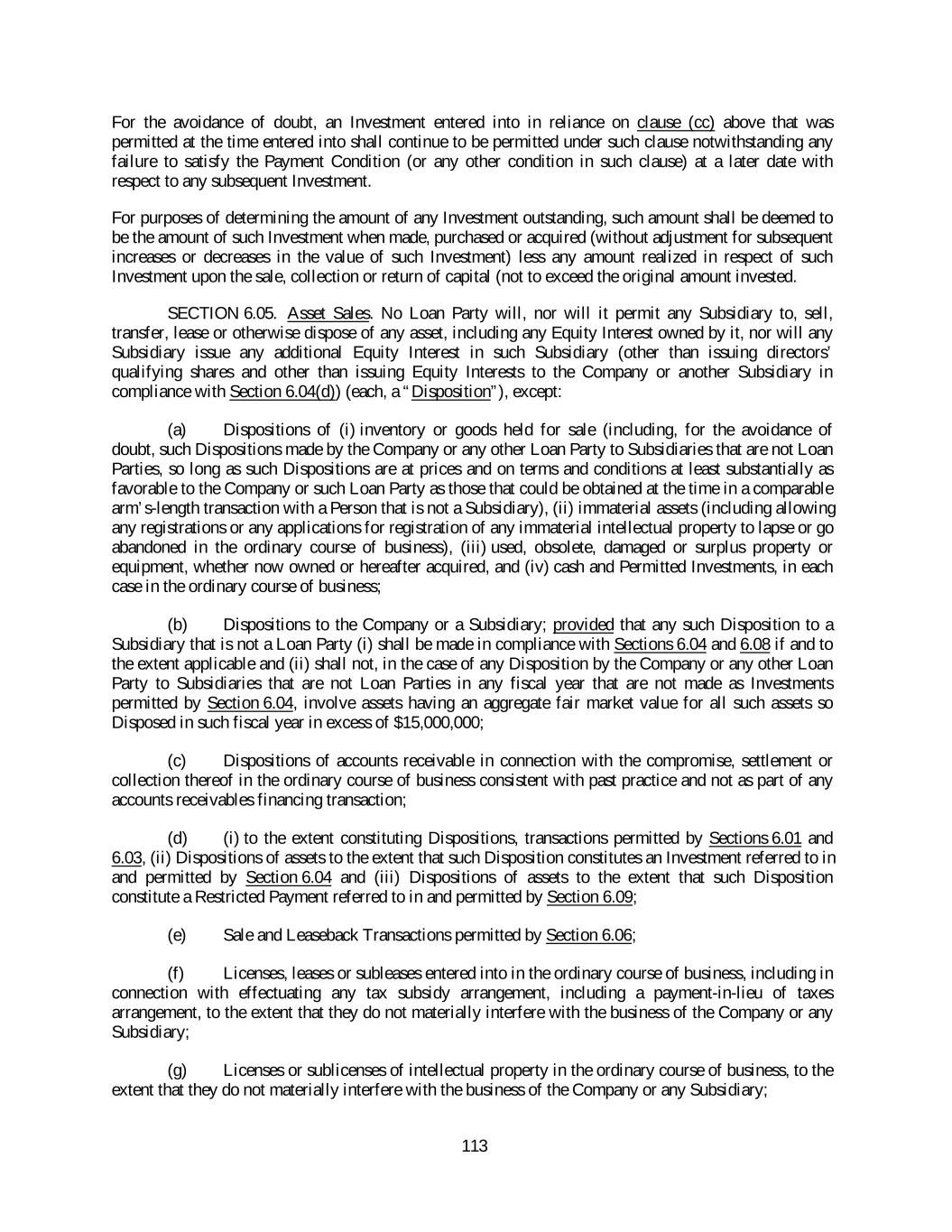 For the avoidance of doubt, an Investment entered into in reliance on clause (cc) above that was permitted at the time entered into shall continue to be permitted under such clause notwithstanding any failure to satisfy the Payment Condition (or any other condition in such clause) at a later date with respect to any subsequent Investment. For purposes of determining the amount of any Investment outstanding, such amount shall be deemed to be the amount of such Investment when made, purchased or acquired (without adjustment for subsequent increases or decreases in the value of such Investment) less any amount realized in respect of such Investment upon the sale, collection or return of capital (not to exceed the original amount invested. SECTION 6.05. Asset Sales. No Loan Party will, nor will it permit any Subsidiary to, sell, transfer, lease or otherwise dispose of any asset, including any Equity Interest owned by it, nor will any Subsidiary issue any additional Equity Interest in such Subsidiary (other than issuing directors’ qualifying shares and other than issuing Equity Interests to the Company or another Subsidiary in compliance with Section 6.04(d)) (each, a “Disposition”), except: (a) Dispositions of (i) inventory or goods held for sale (including, for the avoidance of doubt, such Dispositions made by the Company or any other Loan Party to Subsidiaries that are not Loan Parties, so long as such Dispositions are at prices and on terms and conditions at least substantially as favorable to the Company or such Loan Party as those that could be obtained at the time in a comparable arm’s-length transaction with a Person that is not a Subsidiary), (ii) immaterial assets (including allowing any registrations or any applications for registration of any immaterial intellectual property to lapse or go abandoned in the ordinary course of business), (iii) used, obsolete, damaged or surplus property or equipment, whether now owned or hereafter acquired, and (iv) cash and Permitted Investments, in each case in the ordinary course of business; (b) Dispositions to the Company or a Subsidiary; provided that any such Disposition to a Subsidiary that is not a Loan Party (i) shall be made in compliance with Sections 6.04 and 6.08 if and to the extent applicable and (ii) shall not, in the case of any Disposition by the Company or any other Loan Party to Subsidiaries that are not Loan Parties in any fiscal year that are not made as Investments permitted by Section 6.04, involve assets having an aggregate fair market value for all such assets so Disposed in such fiscal year in excess of $15,000,000; (c) Dispositions of accounts receivable in connection with the compromise, settlement or collection thereof in the ordinary course of business consistent with past practice and not as part of any accounts receivables financing transaction; (d) (i) to the extent constituting Dispositions, transactions permitted by Sections 6.01 and 6.03, (ii) Dispositions of assets to the extent that such Disposition constitutes an Investment referred to in and permitted by Section 6.04 and (iii) Dispositions of assets to the extent that such Disposition constitute a Restricted Payment referred to in and permitted by Section 6.09; (e) Sale and Leaseback Transactions permitted by Section 6.06; (f) Licenses, leases or subleases entered into in the ordinary course of business, including in connection with effectuating any tax subsidy arrangement, including a payment-in-lieu of taxes arrangement, to the extent that they do not materially interfere with the business of the Company or any Subsidiary; (g) Licenses or sublicenses of intellectual property in the ordinary course of business, to the extent that they do not materially interfere with the business of the Company or any Subsidiary; 113
