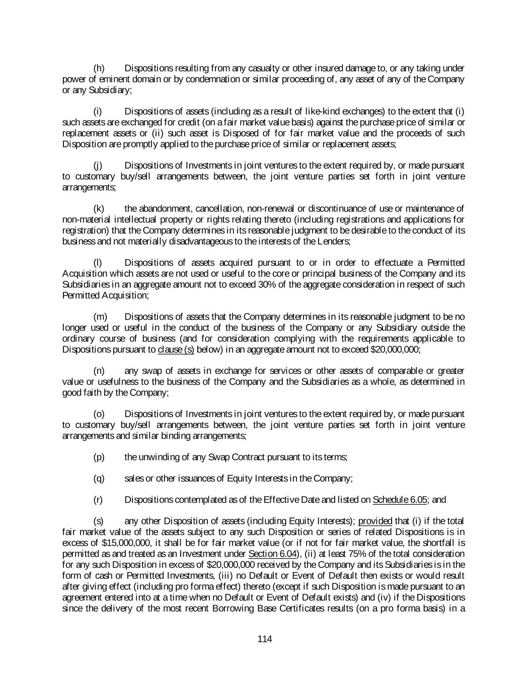 (h) Dispositions resulting from any casualty or other insured damage to, or any taking under power of eminent domain or by condemnation or similar proceeding of, any asset of any of the Company or any Subsidiary; (i) Dispositions of assets (including as a result of like-kind exchanges) to the extent that (i) such assets are exchanged for credit (on a fair market value basis) against the purchase price of similar or replacement assets or (ii) such asset is Disposed of for fair market value and the proceeds of such Disposition are promptly applied to the purchase price of similar or replacement assets; (j) Dispositions of Investments in joint ventures to the extent required by, or made pursuant to customary buy/sell arrangements between, the joint venture parties set forth in joint venture arrangements; (k) the abandonment, cancellation, non-renewal or discontinuance of use or maintenance of non-material intellectual property or rights relating thereto (including registrations and applications for registration) that the Company determines in its reasonable judgment to be desirable to the conduct of its business and not materially disadvantageous to the interests of the Lenders; (l) Dispositions of assets acquired pursuant to or in order to effectuate a Permitted Acquisition which assets are not used or useful to the core or principal business of the Company and its Subsidiaries in an aggregate amount not to exceed 30% of the aggregate consideration in respect of such Permitted Acquisition; (m) Dispositions of assets that the Company determines in its reasonable judgment to be no longer used or useful in the conduct of the business of the Company or any Subsidiary outside the ordinary course of business (and for consideration complying with the requirements applicable to Dispositions pursuant to clause (s) below) in an aggregate amount not to exceed $20,000,000; (n) any swap of assets in exchange for services or other assets of comparable or greater value or usefulness to the business of the Company and the Subsidiaries as a whole, as determined in good faith by the Company; (o) Dispositions of Investments in joint ventures to the extent required by, or made pursuant to customary buy/sell arrangements between, the joint venture parties set forth in joint venture arrangements and similar binding arrangements; (p) the unwinding of any Swap Contract pursuant to its terms; (q) sales or other issuances of Equity Interests in the Company; (r) Dispositions contemplated as of the Effective Date and listed on Schedule 6.05; and (s) any other Disposition of assets (including Equity Interests); provided that (i) if the total fair market value of the assets subject to any such Disposition or series of related Dispositions is in excess of $15,000,000, it shall be for fair market value (or if not for fair market value, the shortfall is permitted as and treated as an Investment under Section 6.04), (ii) at least 75% of the total consideration for any such Disposition in excess of $20,000,000 received by the Company and its Subsidiaries is in the form of cash or Permitted Investments, (iii) no Default or Event of Default then exists or would result after giving effect (including pro forma effect) thereto (except if such Disposition is made pursuant to an agreement entered into at a time when no Default or Event of Default exists) and (iv) if the Dispositions since the delivery of the most recent Borrowing Base Certificates results (on a pro forma basis) in a 114