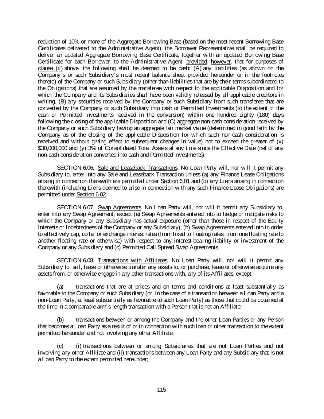 reduction of 10% or more of the Aggregate Borrowing Base (based on the most recent Borrowing Base Certificates delivered to the Administrative Agent), the Borrower Representative shall be required to deliver an updated Aggregate Borrowing Base Certificate, together with an updated Borrowing Base Certificate for each Borrower, to the Administrative Agent; provided, however, that for purposes of clause (ii) above, the following shall be deemed to be cash: (A) any liabilities (as shown on the Company’s or such Subsidiary’s most recent balance sheet provided hereunder or in the footnotes thereto) of the Company or such Subsidiary (other than liabilities that are by their terms subordinated to the Obligations) that are assumed by the transferee with respect to the applicable Disposition and for which the Company and its Subsidiaries shall have been validly released by all applicable creditors in writing, (B) any securities received by the Company or such Subsidiary from such transferee that are converted by the Company or such Subsidiary into cash or Permitted Investments (to the extent of the cash or Permitted Investments received in the conversion) within one hundred eighty (180) days following the closing of the applicable Disposition and (C) aggregate non-cash consideration received by the Company or such Subsidiary having an aggregate fair market value (determined in good faith by the Company as of the closing of the applicable Disposition for which such non-cash consideration is received and without giving effect to subsequent changes in value) not to exceed the greater of (x) $30,000,000 and (y) 3% of Consolidated Total Assets at any time since the Effective Date (net of any non-cash consideration converted into cash and Permitted Investments). SECTION 6.06. Sale and Leaseback Transactions. No Loan Party will, nor will it permit any Subsidiary to, enter into any Sale and Leaseback Transaction unless (a) any Finance Lease Obligations arising in connection therewith are permitted under Section 6.01 and (b) any Liens arising in connection therewith (including Liens deemed to arise in connection with any such Finance Lease Obligations) are permitted under Section 6.02. SECTION 6.07. Swap Agreements. No Loan Party will, nor will it permit any Subsidiary to, enter into any Swap Agreement, except (a) Swap Agreements entered into to hedge or mitigate risks to which the Company or any Subsidiary has actual exposure (other than those in respect of the Equity Interests or Indebtedness of the Company or any Subsidiary), (b) Swap Agreements entered into in order to effectively cap, collar or exchange interest rates (from fixed to floating rates, from one floating rate to another floating rate or otherwise) with respect to any interest-bearing liability or investment of the Company or any Subsidiary and (c) Permitted Call Spread Swap Agreements. SECTION 6.08. Transactions with Affiliates. No Loan Party will, nor will it permit any Subsidiary to, sell, lease or otherwise transfer any assets to, or purchase, lease or otherwise acquire any assets from, or otherwise engage in any other transactions with, any of its Affiliates, except: (a) transactions that are at prices and on terms and conditions at least substantially as favorable to the Company or such Subsidiary (or, in the case of a transaction between a Loan Party and a non-Loan Party, at least substantially as favorable to such Loan Party) as those that could be obtained at the time in a comparable arm’s-length transaction with a Person that is not an Affiliate; (b) transactions between or among the Company and the other Loan Parties or any Person that becomes a Loan Party as a result of or in connection with such loan or other transaction to the extent permitted hereunder and not involving any other Affiliate; (c) (i) transactions between or among Subsidiaries that are not Loan Parties and not involving any other Affiliate and (ii) transactions between any Loan Party and any Subsidiary that is not a Loan Party to the extent permitted hereunder; 115