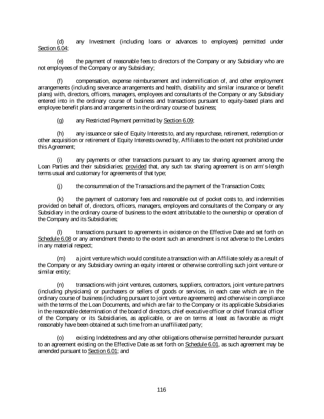 (d) any Investment (including loans or advances to employees) permitted under Section 6.04; (e) the payment of reasonable fees to directors of the Company or any Subsidiary who are not employees of the Company or any Subsidiary; (f) compensation, expense reimbursement and indemnification of, and other employment arrangements (including severance arrangements and health, disability and similar insurance or benefit plans) with, directors, officers, managers, employees and consultants of the Company or any Subsidiary entered into in the ordinary course of business and transactions pursuant to equity-based plans and employee benefit plans and arrangements in the ordinary course of business; (g) any Restricted Payment permitted by Section 6.09; (h) any issuance or sale of Equity Interests to, and any repurchase, retirement, redemption or other acquisition or retirement of Equity Interests owned by, Affiliates to the extent not prohibited under this Agreement; (i) any payments or other transactions pursuant to any tax sharing agreement among the Loan Parties and their subsidiaries; provided that, any such tax sharing agreement is on arm’s-length terms usual and customary for agreements of that type; (j) the consummation of the Transactions and the payment of the Transaction Costs; (k) the payment of customary fees and reasonable out of pocket costs to, and indemnities provided on behalf of, directors, officers, managers, employees and consultants of the Company or any Subsidiary in the ordinary course of business to the extent attributable to the ownership or operation of the Company and its Subsidiaries; (l) transactions pursuant to agreements in existence on the Effective Date and set forth on Schedule 6.08 or any amendment thereto to the extent such an amendment is not adverse to the Lenders in any material respect; (m) a joint venture which would constitute a transaction with an Affiliate solely as a result of the Company or any Subsidiary owning an equity interest or otherwise controlling such joint venture or similar entity; (n) transactions with joint ventures, customers, suppliers, contractors, joint venture partners (including physicians) or purchasers or sellers of goods or services, in each case which are in the ordinary course of business (including pursuant to joint venture agreements) and otherwise in compliance with the terms of the Loan Documents, and which are fair to the Company or its applicable Subsidiaries in the reasonable determination of the board of directors, chief executive officer or chief financial officer of the Company or its Subsidiaries, as applicable, or are on terms at least as favorable as might reasonably have been obtained at such time from an unaffiliated party; (o) existing Indebtedness and any other obligations otherwise permitted hereunder pursuant to an agreement existing on the Effective Date as set forth on Schedule 6.01, as such agreement may be amended pursuant to Section 6.01; and 116