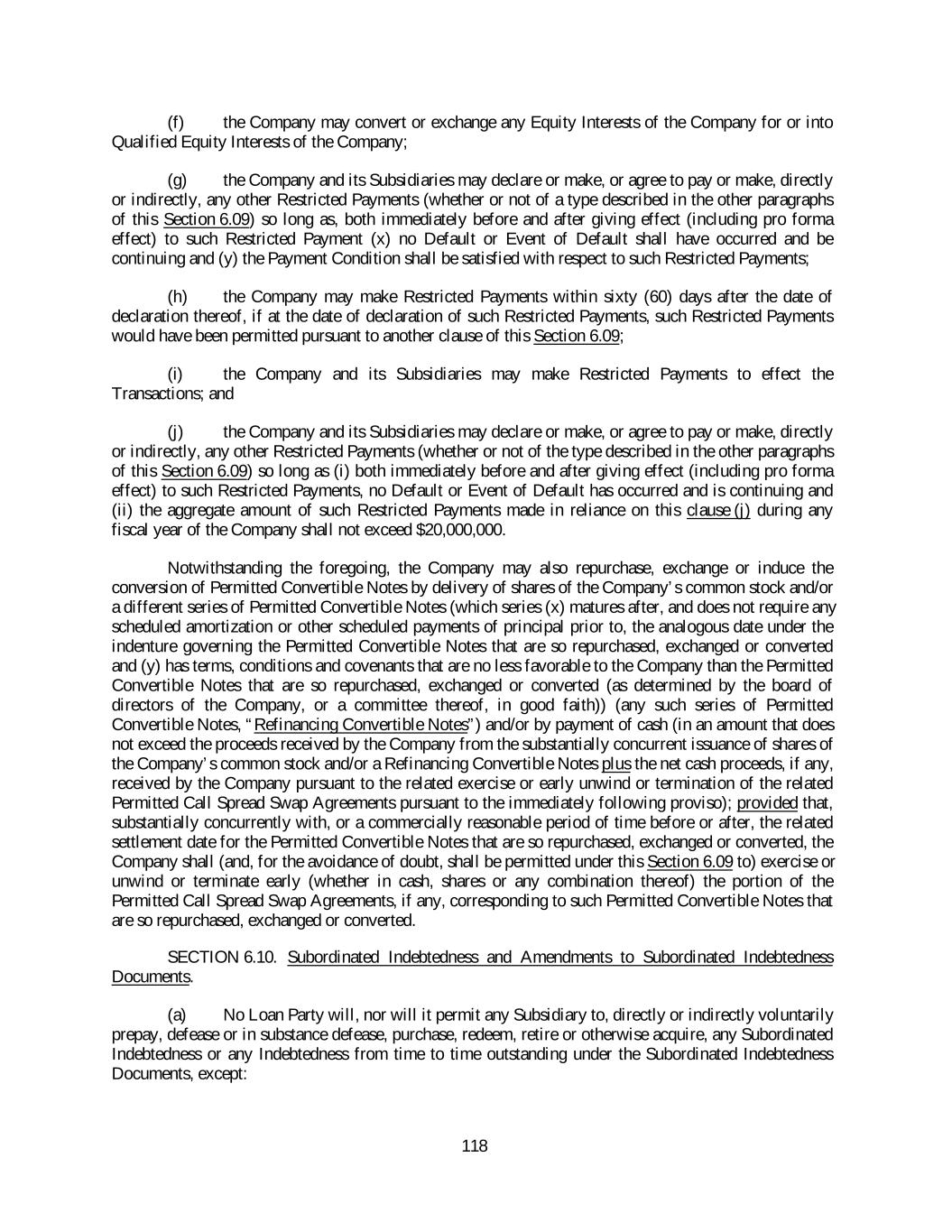 (f) the Company may convert or exchange any Equity Interests of the Company for or into Qualified Equity Interests of the Company; (g) the Company and its Subsidiaries may declare or make, or agree to pay or make, directly or indirectly, any other Restricted Payments (whether or not of a type described in the other paragraphs of this Section 6.09) so long as, both immediately before and after giving effect (including pro forma effect) to such Restricted Payment (x) no Default or Event of Default shall have occurred and be continuing and (y) the Payment Condition shall be satisfied with respect to such Restricted Payments; (h) the Company may make Restricted Payments within sixty (60) days after the date of declaration thereof, if at the date of declaration of such Restricted Payments, such Restricted Payments would have been permitted pursuant to another clause of this Section 6.09; (i) the Company and its Subsidiaries may make Restricted Payments to effect the Transactions; and (j) the Company and its Subsidiaries may declare or make, or agree to pay or make, directly or indirectly, any other Restricted Payments (whether or not of the type described in the other paragraphs of this Section 6.09) so long as (i) both immediately before and after giving effect (including pro forma effect) to such Restricted Payments, no Default or Event of Default has occurred and is continuing and (ii) the aggregate amount of such Restricted Payments made in reliance on this clause (j) during any fiscal year of the Company shall not exceed $20,000,000. Notwithstanding the foregoing, the Company may also repurchase, exchange or induce the conversion of Permitted Convertible Notes by delivery of shares of the Company’s common stock and/or a different series of Permitted Convertible Notes (which series (x) matures after, and does not require any scheduled amortization or other scheduled payments of principal prior to, the analogous date under the indenture governing the Permitted Convertible Notes that are so repurchased, exchanged or converted and (y) has terms, conditions and covenants that are no less favorable to the Company than the Permitted Convertible Notes that are so repurchased, exchanged or converted (as determined by the board of directors of the Company, or a committee thereof, in good faith)) (any such series of Permitted Convertible Notes, “Refinancing Convertible Notes”) and/or by payment of cash (in an amount that does not exceed the proceeds received by the Company from the substantially concurrent issuance of shares of the Company’s common stock and/or a Refinancing Convertible Notes plus the net cash proceeds, if any, received by the Company pursuant to the related exercise or early unwind or termination of the related Permitted Call Spread Swap Agreements pursuant to the immediately following proviso); provided that, substantially concurrently with, or a commercially reasonable period of time before or after, the related settlement date for the Permitted Convertible Notes that are so repurchased, exchanged or converted, the Company shall (and, for the avoidance of doubt, shall be permitted under this Section 6.09 to) exercise or unwind or terminate early (whether in cash, shares or any combination thereof) the portion of the Permitted Call Spread Swap Agreements, if any, corresponding to such Permitted Convertible Notes that are so repurchased, exchanged or converted. SECTION 6.10. Subordinated Indebtedness and Amendments to Subordinated Indebtedness Documents. (a) No Loan Party will, nor will it permit any Subsidiary to, directly or indirectly voluntarily prepay, defease or in substance defease, purchase, redeem, retire or otherwise acquire, any Subordinated Indebtedness or any Indebtedness from time to time outstanding under the Subordinated Indebtedness Documents, except: 118
