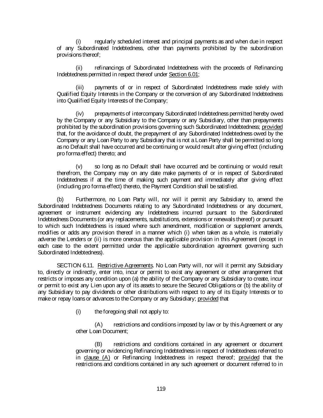 (i) regularly scheduled interest and principal payments as and when due in respect of any Subordinated Indebtedness, other than payments prohibited by the subordination provisions thereof; (ii) refinancings of Subordinated Indebtedness with the proceeds of Refinancing Indebtedness permitted in respect thereof under Section 6.01; (iii) payments of or in respect of Subordinated Indebtedness made solely with Qualified Equity Interests in the Company or the conversion of any Subordinated Indebtedness into Qualified Equity Interests of the Company; (iv) prepayments of intercompany Subordinated Indebtedness permitted hereby owed by the Company or any Subsidiary to the Company or any Subsidiary, other than prepayments prohibited by the subordination provisions governing such Subordinated Indebtedness; provided that, for the avoidance of doubt, the prepayment of any Subordinated Indebtedness owed by the Company or any Loan Party to any Subsidiary that is not a Loan Party shall be permitted so long as no Default shall have occurred and be continuing or would result after giving effect (including pro forma effect) thereto; and (v) so long as no Default shall have occurred and be continuing or would result therefrom, the Company may on any date make payments of or in respect of Subordinated Indebtedness if at the time of making such payment and immediately after giving effect (including pro forma effect) thereto, the Payment Condition shall be satisfied. (b) Furthermore, no Loan Party will, nor will it permit any Subsidiary to, amend the Subordinated Indebtedness Documents relating to any Subordinated Indebtedness or any document, agreement or instrument evidencing any Indebtedness incurred pursuant to the Subordinated Indebtedness Documents (or any replacements, substitutions, extensions or renewals thereof) or pursuant to which such Indebtedness is issued where such amendment, modification or supplement amends, modifies or adds any provision thereof in a manner which (i) when taken as a whole, is materially adverse the Lenders or (ii) is more onerous than the applicable provision in this Agreement (except in each case to the extent permitted under the applicable subordination agreement governing such Subordinated Indebtedness). SECTION 6.11. Restrictive Agreements. No Loan Party will, nor will it permit any Subsidiary to, directly or indirectly, enter into, incur or permit to exist any agreement or other arrangement that restricts or imposes any condition upon (a) the ability of the Company or any Subsidiary to create, incur or permit to exist any Lien upon any of its assets to secure the Secured Obligations or (b) the ability of any Subsidiary to pay dividends or other distributions with respect to any of its Equity Interests or to make or repay loans or advances to the Company or any Subsidiary; provided that (i) the foregoing shall not apply to: (A) restrictions and conditions imposed by law or by this Agreement or any other Loan Document; (B) restrictions and conditions contained in any agreement or document governing or evidencing Refinancing Indebtedness in respect of Indebtedness referred to in clause (A) or Refinancing Indebtedness in respect thereof; provided that the restrictions and conditions contained in any such agreement or document referred to in 119
