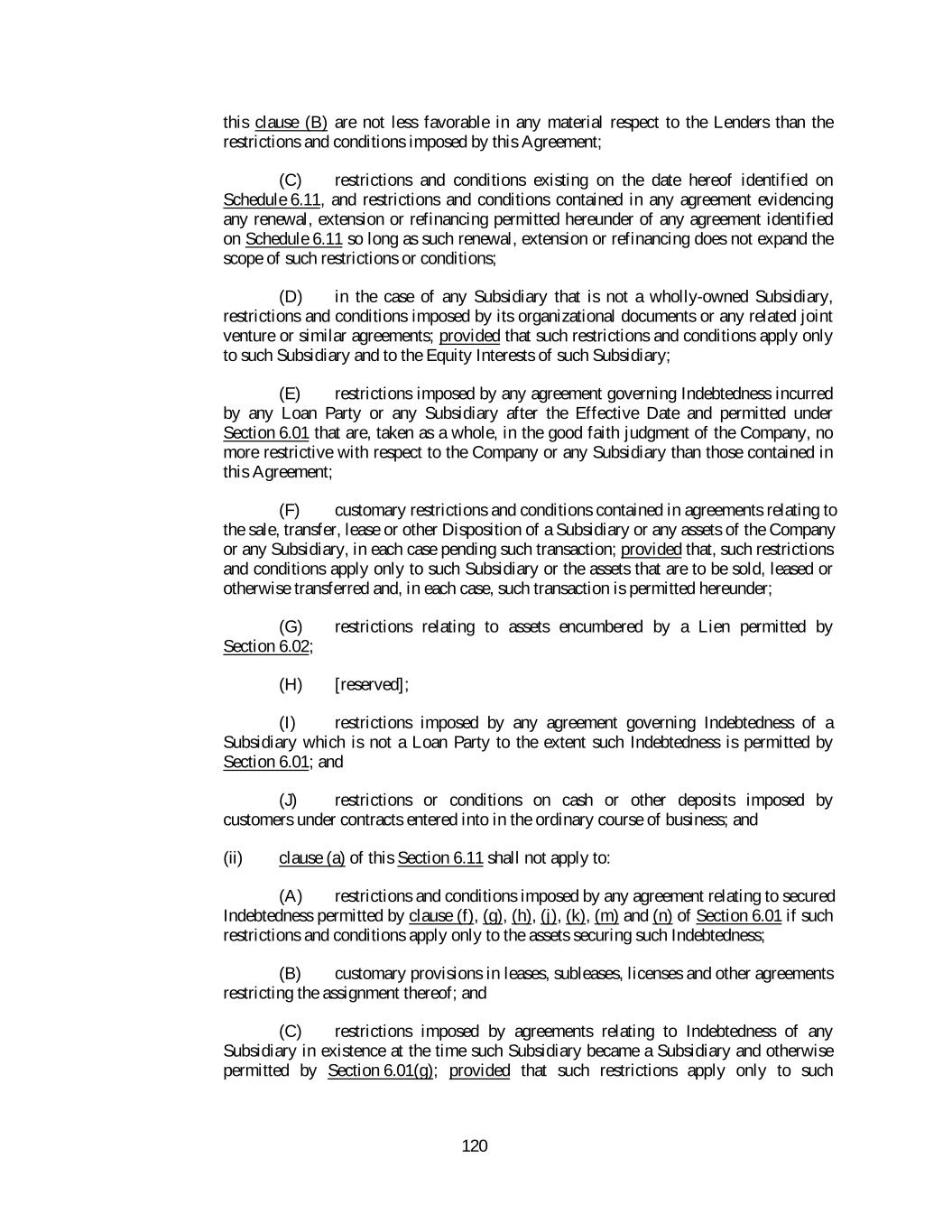 this clause (B) are not less favorable in any material respect to the Lenders than the restrictions and conditions imposed by this Agreement; (C) restrictions and conditions existing on the date hereof identified on Schedule 6.11, and restrictions and conditions contained in any agreement evidencing any renewal, extension or refinancing permitted hereunder of any agreement identified on Schedule 6.11 so long as such renewal, extension or refinancing does not expand the scope of such restrictions or conditions; (D) in the case of any Subsidiary that is not a wholly-owned Subsidiary, restrictions and conditions imposed by its organizational documents or any related joint venture or similar agreements; provided that such restrictions and conditions apply only to such Subsidiary and to the Equity Interests of such Subsidiary; (E) restrictions imposed by any agreement governing Indebtedness incurred by any Loan Party or any Subsidiary after the Effective Date and permitted under Section 6.01 that are, taken as a whole, in the good faith judgment of the Company, no more restrictive with respect to the Company or any Subsidiary than those contained in this Agreement; (F) customary restrictions and conditions contained in agreements relating to the sale, transfer, lease or other Disposition of a Subsidiary or any assets of the Company or any Subsidiary, in each case pending such transaction; provided that, such restrictions and conditions apply only to such Subsidiary or the assets that are to be sold, leased or otherwise transferred and, in each case, such transaction is permitted hereunder; (G) restrictions relating to assets encumbered by a Lien permitted by Section 6.02; (H) [reserved]; (I) restrictions imposed by any agreement governing Indebtedness of a Subsidiary which is not a Loan Party to the extent such Indebtedness is permitted by Section 6.01; and (J) restrictions or conditions on cash or other deposits imposed by customers under contracts entered into in the ordinary course of business; and (ii) clause (a) of this Section 6.11 shall not apply to: (A) restrictions and conditions imposed by any agreement relating to secured Indebtedness permitted by clause (f), (g), (h), (j), (k), (m) and (n) of Section 6.01 if such restrictions and conditions apply only to the assets securing such Indebtedness; (B) customary provisions in leases, subleases, licenses and other agreements restricting the assignment thereof; and (C) restrictions imposed by agreements relating to Indebtedness of any Subsidiary in existence at the time such Subsidiary became a Subsidiary and otherwise permitted by Section 6.01(g); provided that such restrictions apply only to such 120