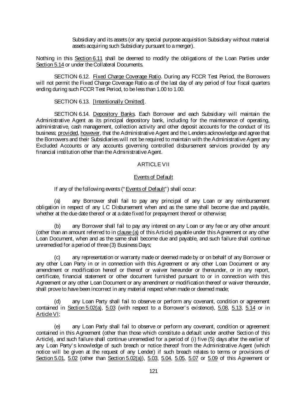 Subsidiary and its assets (or any special purpose acquisition Subsidiary without material assets acquiring such Subsidiary pursuant to a merger). Nothing in this Section 6.11 shall be deemed to modify the obligations of the Loan Parties under Section 5.14 or under the Collateral Documents. SECTION 6.12. Fixed Charge Coverage Ratio. During any FCCR Test Period, the Borrowers will not permit the Fixed Charge Coverage Ratio as of the last day of any period of four fiscal quarters ending during such FCCR Test Period, to be less than 1.00 to 1.00. SECTION 6.13. [Intentionally Omitted]. SECTION 6.14. Depository Banks. Each Borrower and each Subsidiary will maintain the Administrative Agent as its principal depository bank, including for the maintenance of operating, administrative, cash management, collection activity and other deposit accounts for the conduct of its business; provided, however, that the Administrative Agent and the Lenders acknowledge and agree that the Borrowers and their Subsidiaries will not be required to maintain with the Administrative Agent any Excluded Accounts or any accounts governing controlled disbursement services provided by any financial institution other than the Administrative Agent. ARTICLE VII Events of Default If any of the following events (“Events of Default”) shall occur: (a) any Borrower shall fail to pay any principal of any Loan or any reimbursement obligation in respect of any LC Disbursement when and as the same shall become due and payable, whether at the due date thereof or at a date fixed for prepayment thereof or otherwise; (b) any Borrower shall fail to pay any interest on any Loan or any fee or any other amount (other than an amount referred to in clause (a) of this Article) payable under this Agreement or any other Loan Document, when and as the same shall become due and payable, and such failure shall continue unremedied for a period of three (3) Business Days; (c) any representation or warranty made or deemed made by or on behalf of any Borrower or any other Loan Party in or in connection with this Agreement or any other Loan Document or any amendment or modification hereof or thereof or waiver hereunder or thereunder, or in any report, certificate, financial statement or other document furnished pursuant to or in connection with this Agreement or any other Loan Document or any amendment or modification thereof or waiver thereunder, shall prove to have been incorrect in any material respect when made or deemed made; (d) any Loan Party shall fail to observe or perform any covenant, condition or agreement contained in Section 5.02(a), 5.03 (with respect to a Borrower’s existence), 5.08, 5.13, 5.14 or in Article VI; (e) any Loan Party shall fail to observe or perform any covenant, condition or agreement contained in this Agreement (other than those which constitute a default under another Section of this Article), and such failure shall continue unremedied for a period of (i) five (5) days after the earlier of any Loan Party’s knowledge of such breach or notice thereof from the Administrative Agent (which notice will be given at the request of any Lender) if such breach relates to terms or provisions of Section 5.01, 5.02 (other than Section 5.02(a)), 5.03, 5.04, 5.05, 5.07 or 5.09 of this Agreement or 121