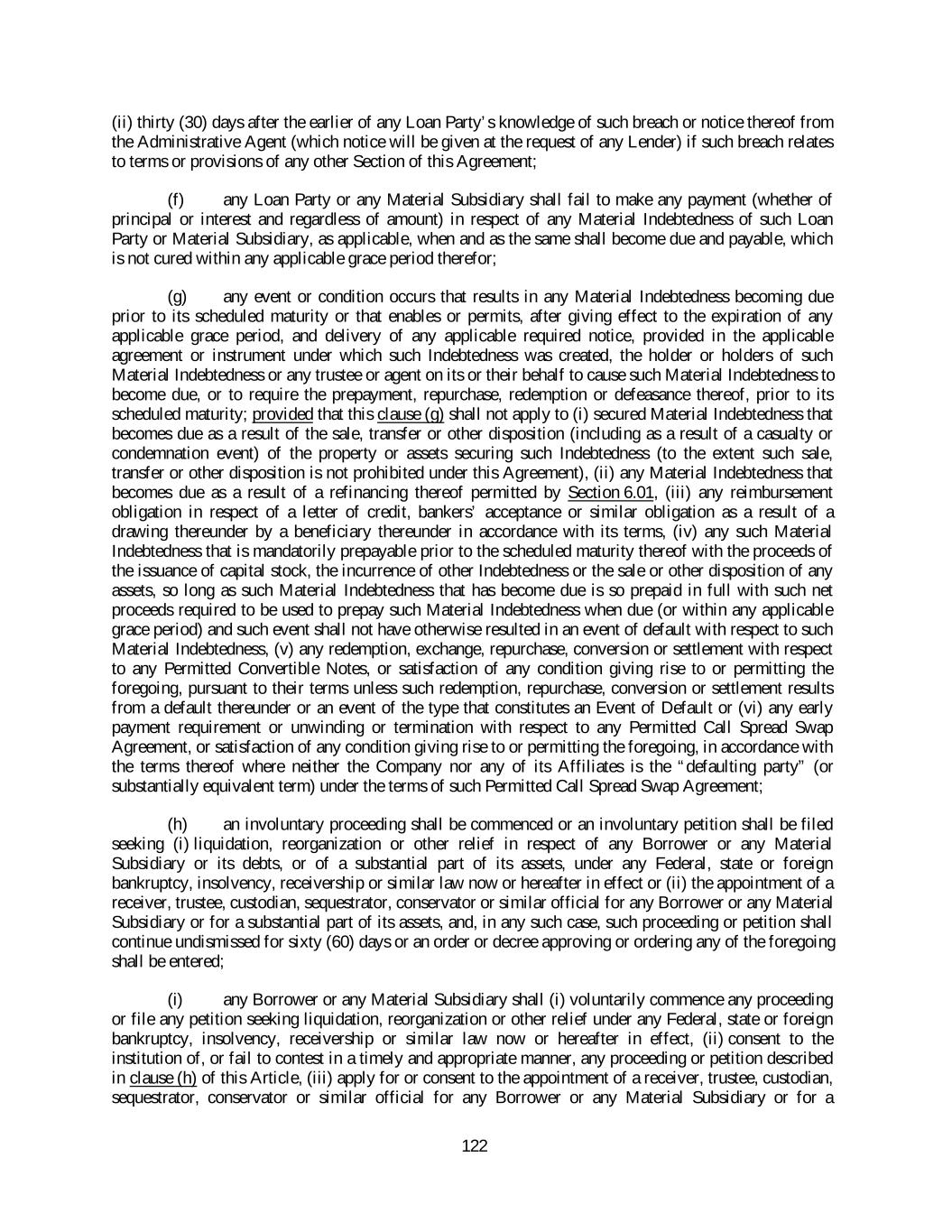 (ii) thirty (30) days after the earlier of any Loan Party’s knowledge of such breach or notice thereof from the Administrative Agent (which notice will be given at the request of any Lender) if such breach relates to terms or provisions of any other Section of this Agreement; (f) any Loan Party or any Material Subsidiary shall fail to make any payment (whether of principal or interest and regardless of amount) in respect of any Material Indebtedness of such Loan Party or Material Subsidiary, as applicable, when and as the same shall become due and payable, which is not cured within any applicable grace period therefor; (g) any event or condition occurs that results in any Material Indebtedness becoming due prior to its scheduled maturity or that enables or permits, after giving effect to the expiration of any applicable grace period, and delivery of any applicable required notice, provided in the applicable agreement or instrument under which such Indebtedness was created, the holder or holders of such Material Indebtedness or any trustee or agent on its or their behalf to cause such Material Indebtedness to become due, or to require the prepayment, repurchase, redemption or defeasance thereof, prior to its scheduled maturity; provided that this clause (g) shall not apply to (i) secured Material Indebtedness that becomes due as a result of the sale, transfer or other disposition (including as a result of a casualty or condemnation event) of the property or assets securing such Indebtedness (to the extent such sale, transfer or other disposition is not prohibited under this Agreement), (ii) any Material Indebtedness that becomes due as a result of a refinancing thereof permitted by Section 6.01, (iii) any reimbursement obligation in respect of a letter of credit, bankers’ acceptance or similar obligation as a result of a drawing thereunder by a beneficiary thereunder in accordance with its terms, (iv) any such Material Indebtedness that is mandatorily prepayable prior to the scheduled maturity thereof with the proceeds of the issuance of capital stock, the incurrence of other Indebtedness or the sale or other disposition of any assets, so long as such Material Indebtedness that has become due is so prepaid in full with such net proceeds required to be used to prepay such Material Indebtedness when due (or within any applicable grace period) and such event shall not have otherwise resulted in an event of default with respect to such Material Indebtedness, (v) any redemption, exchange, repurchase, conversion or settlement with respect to any Permitted Convertible Notes, or satisfaction of any condition giving rise to or permitting the foregoing, pursuant to their terms unless such redemption, repurchase, conversion or settlement results from a default thereunder or an event of the type that constitutes an Event of Default or (vi) any early payment requirement or unwinding or termination with respect to any Permitted Call Spread Swap Agreement, or satisfaction of any condition giving rise to or permitting the foregoing, in accordance with the terms thereof where neither the Company nor any of its Affiliates is the “defaulting party” (or substantially equivalent term) under the terms of such Permitted Call Spread Swap Agreement; (h) an involuntary proceeding shall be commenced or an involuntary petition shall be filed seeking (i) liquidation, reorganization or other relief in respect of any Borrower or any Material Subsidiary or its debts, or of a substantial part of its assets, under any Federal, state or foreign bankruptcy, insolvency, receivership or similar law now or hereafter in effect or (ii) the appointment of a receiver, trustee, custodian, sequestrator, conservator or similar official for any Borrower or any Material Subsidiary or for a substantial part of its assets, and, in any such case, such proceeding or petition shall continue undismissed for sixty (60) days or an order or decree approving or ordering any of the foregoing shall be entered; (i) any Borrower or any Material Subsidiary shall (i) voluntarily commence any proceeding or file any petition seeking liquidation, reorganization or other relief under any Federal, state or foreign bankruptcy, insolvency, receivership or similar law now or hereafter in effect, (ii) consent to the institution of, or fail to contest in a timely and appropriate manner, any proceeding or petition described in clause (h) of this Article, (iii) apply for or consent to the appointment of a receiver, trustee, custodian, sequestrator, conservator or similar official for any Borrower or any Material Subsidiary or for a 122