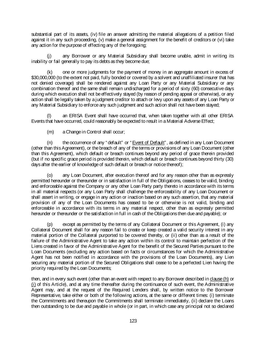 substantial part of its assets, (iv) file an answer admitting the material allegations of a petition filed against it in any such proceeding, (v) make a general assignment for the benefit of creditors or (vi) take any action for the purpose of effecting any of the foregoing; (j) any Borrower or any Material Subsidiary shall become unable, admit in writing its inability or fail generally to pay its debts as they become due; (k) one or more judgments for the payment of money in an aggregate amount in excess of $30,000,000 (to the extent not paid, fully bonded or covered by a solvent and unaffiliated insurer that has not denied coverage) shall be rendered against any Loan Party or any Material Subsidiary or any combination thereof and the same shall remain undischarged for a period of sixty (60) consecutive days during which execution shall not be effectively stayed (by reason of pending appeal or otherwise), or any action shall be legally taken by a judgment creditor to attach or levy upon any assets of any Loan Party or any Material Subsidiary to enforce any such judgment and such action shall not have been stayed; (l) an ERISA Event shall have occurred that, when taken together with all other ERISA Events that have occurred, could reasonably be expected to result in a Material Adverse Effect; (m) a Change in Control shall occur; (n) the occurrence of any “default” or “Event of Default”, as defined in any Loan Document (other than this Agreement), or the breach of any of the terms or provisions of any Loan Document (other than this Agreement), which default or breach continues beyond any period of grace therein provided (but if no specific grace period is provided therein, which default or breach continues beyond thirty (30) days after the earlier of knowledge of such default or breach or notice thereof); (o) any Loan Document, after execution thereof and for any reason other than as expressly permitted hereunder or thereunder or in satisfaction in full of the Obligations, ceases to be valid, binding and enforceable against the Company or any other Loan Party party thereto in accordance with its terms in all material respects (or any Loan Party shall challenge the enforceability of any Loan Document or shall assert in writing, or engage in any action or inaction based on any such assertion, that any material provision of any of the Loan Documents has ceased to be or otherwise is not valid, binding and enforceable in accordance with its terms in any material respect, other than as expressly permitted hereunder or thereunder or the satisfaction in full in cash of the Obligations then due and payable); or (p) except as permitted by the terms of any Collateral Document or this Agreement, (i) any Collateral Document shall for any reason fail to create or keep created a valid security interest in any material portion of the Collateral purported to be covered thereby, or (ii) other than as a result of the failure of the Administrative Agent to take any action within its control to maintain perfection of the Liens created in favor of the Administrative Agent for the benefit of the Secured Parties pursuant to the Loan Documents (excluding any action based on facts or circumstances for which the Administrative Agent has not been notified in accordance with the provisions of the Loan Documents), any Lien securing any material portion of the Secured Obligations shall cease to be a perfected Lien having the priority required by the Loan Documents; then, and in every such event (other than an event with respect to any Borrower described in clause (h) or (i) of this Article), and at any time thereafter during the continuance of such event, the Administrative Agent may, and at the request of the Required Lenders shall, by written notice to the Borrower Representative, take either or both of the following actions, at the same or different times: (i) terminate the Commitments and thereupon the Commitments shall terminate immediately, (ii) declare the Loans then outstanding to be due and payable in whole (or in part, in which case any principal not so declared 123