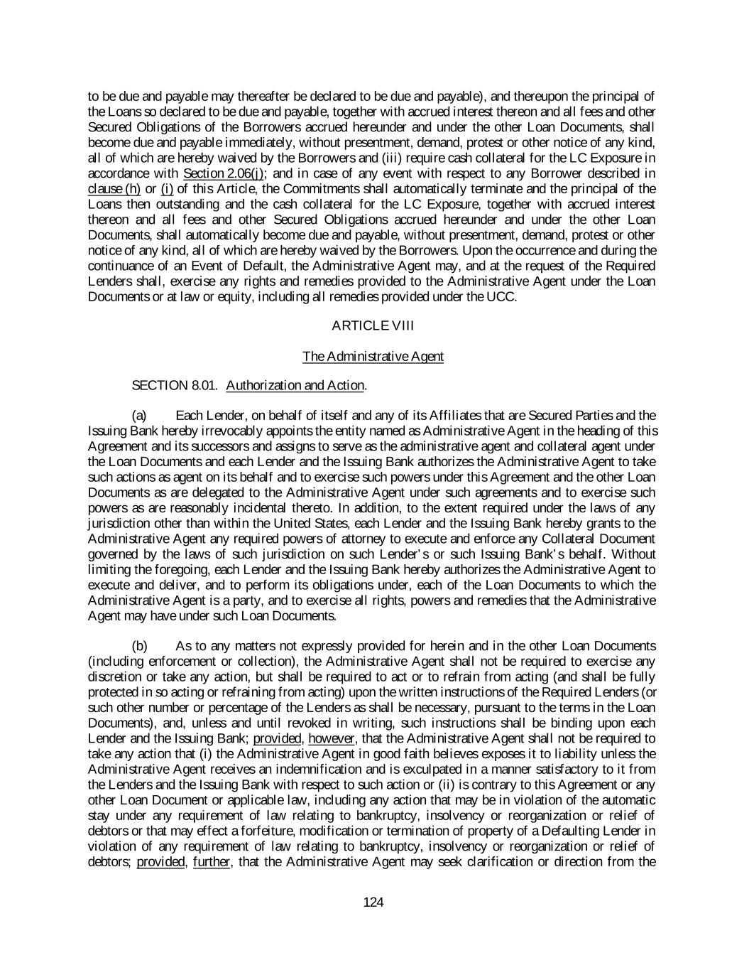 to be due and payable may thereafter be declared to be due and payable), and thereupon the principal of the Loans so declared to be due and payable, together with accrued interest thereon and all fees and other Secured Obligations of the Borrowers accrued hereunder and under the other Loan Documents, shall become due and payable immediately, without presentment, demand, protest or other notice of any kind, all of which are hereby waived by the Borrowers and (iii) require cash collateral for the LC Exposure in accordance with Section 2.06(j); and in case of any event with respect to any Borrower described in clause (h) or (i) of this Article, the Commitments shall automatically terminate and the principal of the Loans then outstanding and the cash collateral for the LC Exposure, together with accrued interest thereon and all fees and other Secured Obligations accrued hereunder and under the other Loan Documents, shall automatically become due and payable, without presentment, demand, protest or other notice of any kind, all of which are hereby waived by the Borrowers. Upon the occurrence and during the continuance of an Event of Default, the Administrative Agent may, and at the request of the Required Lenders shall, exercise any rights and remedies provided to the Administrative Agent under the Loan Documents or at law or equity, including all remedies provided under the UCC. ARTICLE VIII The Administrative Agent SECTION 8.01. Authorization and Action. (a) Each Lender, on behalf of itself and any of its Affiliates that are Secured Parties and the Issuing Bank hereby irrevocably appoints the entity named as Administrative Agent in the heading of this Agreement and its successors and assigns to serve as the administrative agent and collateral agent under the Loan Documents and each Lender and the Issuing Bank authorizes the Administrative Agent to take such actions as agent on its behalf and to exercise such powers under this Agreement and the other Loan Documents as are delegated to the Administrative Agent under such agreements and to exercise such powers as are reasonably incidental thereto. In addition, to the extent required under the laws of any jurisdiction other than within the United States, each Lender and the Issuing Bank hereby grants to the Administrative Agent any required powers of attorney to execute and enforce any Collateral Document governed by the laws of such jurisdiction on such Lender’s or such Issuing Bank’s behalf. Without limiting the foregoing, each Lender and the Issuing Bank hereby authorizes the Administrative Agent to execute and deliver, and to perform its obligations under, each of the Loan Documents to which the Administrative Agent is a party, and to exercise all rights, powers and remedies that the Administrative Agent may have under such Loan Documents. (b) As to any matters not expressly provided for herein and in the other Loan Documents (including enforcement or collection), the Administrative Agent shall not be required to exercise any discretion or take any action, but shall be required to act or to refrain from acting (and shall be fully protected in so acting or refraining from acting) upon the written instructions of the Required Lenders (or such other number or percentage of the Lenders as shall be necessary, pursuant to the terms in the Loan Documents), and, unless and until revoked in writing, such instructions shall be binding upon each Lender and the Issuing Bank; provided, however, that the Administrative Agent shall not be required to take any action that (i) the Administrative Agent in good faith believes exposes it to liability unless the Administrative Agent receives an indemnification and is exculpated in a manner satisfactory to it from the Lenders and the Issuing Bank with respect to such action or (ii) is contrary to this Agreement or any other Loan Document or applicable law, including any action that may be in violation of the automatic stay under any requirement of law relating to bankruptcy, insolvency or reorganization or relief of debtors or that may effect a forfeiture, modification or termination of property of a Defaulting Lender in violation of any requirement of law relating to bankruptcy, insolvency or reorganization or relief of debtors; provided, further, that the Administrative Agent may seek clarification or direction from the 124