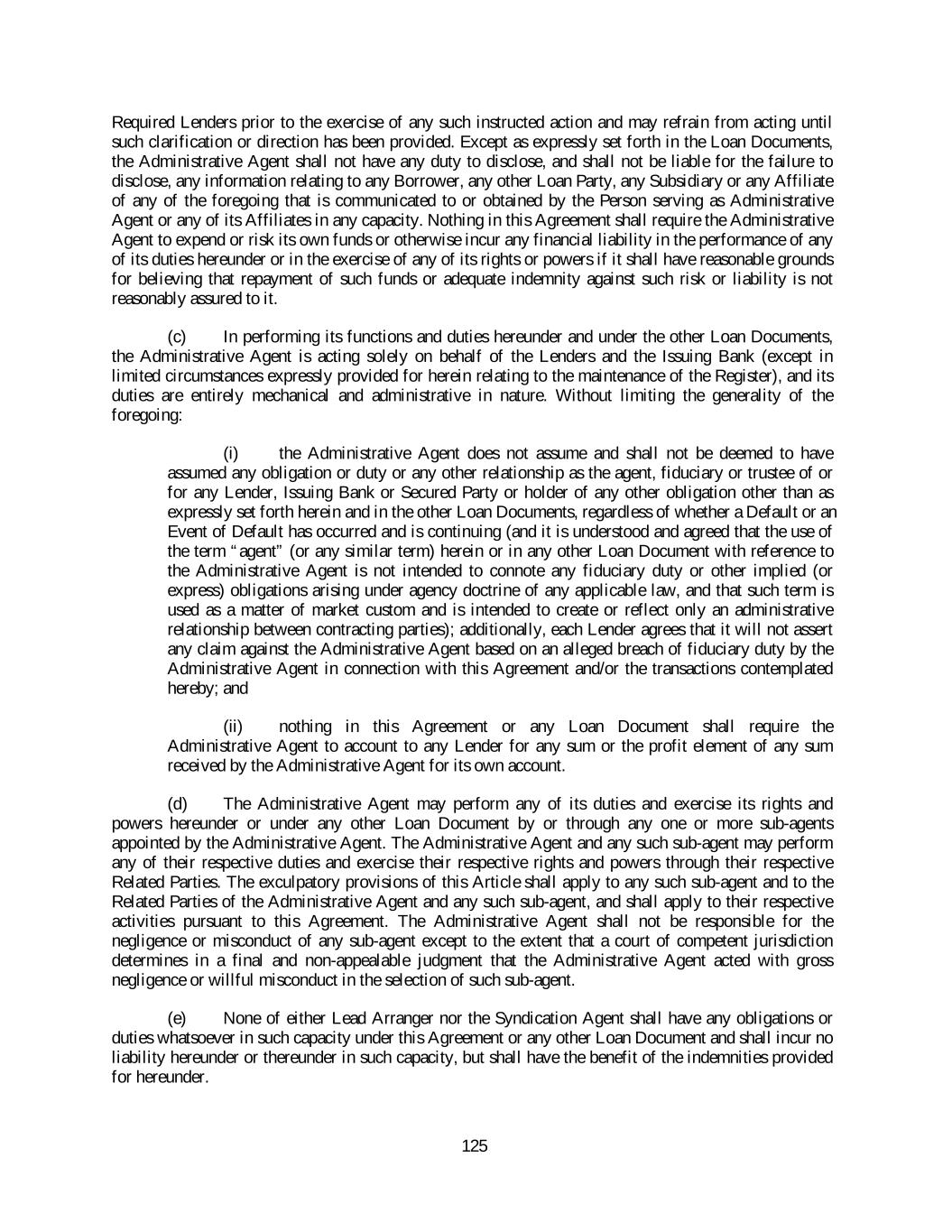 Required Lenders prior to the exercise of any such instructed action and may refrain from acting until such clarification or direction has been provided. Except as expressly set forth in the Loan Documents, the Administrative Agent shall not have any duty to disclose, and shall not be liable for the failure to disclose, any information relating to any Borrower, any other Loan Party, any Subsidiary or any Affiliate of any of the foregoing that is communicated to or obtained by the Person serving as Administrative Agent or any of its Affiliates in any capacity. Nothing in this Agreement shall require the Administrative Agent to expend or risk its own funds or otherwise incur any financial liability in the performance of any of its duties hereunder or in the exercise of any of its rights or powers if it shall have reasonable grounds for believing that repayment of such funds or adequate indemnity against such risk or liability is not reasonably assured to it. (c) In performing its functions and duties hereunder and under the other Loan Documents, the Administrative Agent is acting solely on behalf of the Lenders and the Issuing Bank (except in limited circumstances expressly provided for herein relating to the maintenance of the Register), and its duties are entirely mechanical and administrative in nature. Without limiting the generality of the foregoing: (i) the Administrative Agent does not assume and shall not be deemed to have assumed any obligation or duty or any other relationship as the agent, fiduciary or trustee of or for any Lender, Issuing Bank or Secured Party or holder of any other obligation other than as expressly set forth herein and in the other Loan Documents, regardless of whether a Default or an Event of Default has occurred and is continuing (and it is understood and agreed that the use of the term “agent” (or any similar term) herein or in any other Loan Document with reference to the Administrative Agent is not intended to connote any fiduciary duty or other implied (or express) obligations arising under agency doctrine of any applicable law, and that such term is used as a matter of market custom and is intended to create or reflect only an administrative relationship between contracting parties); additionally, each Lender agrees that it will not assert any claim against the Administrative Agent based on an alleged breach of fiduciary duty by the Administrative Agent in connection with this Agreement and/or the transactions contemplated hereby; and (ii) nothing in this Agreement or any Loan Document shall require the Administrative Agent to account to any Lender for any sum or the profit element of any sum received by the Administrative Agent for its own account. (d) The Administrative Agent may perform any of its duties and exercise its rights and powers hereunder or under any other Loan Document by or through any one or more sub-agents appointed by the Administrative Agent. The Administrative Agent and any such sub-agent may perform any of their respective duties and exercise their respective rights and powers through their respective Related Parties. The exculpatory provisions of this Article shall apply to any such sub-agent and to the Related Parties of the Administrative Agent and any such sub-agent, and shall apply to their respective activities pursuant to this Agreement. The Administrative Agent shall not be responsible for the negligence or misconduct of any sub-agent except to the extent that a court of competent jurisdiction determines in a final and non-appealable judgment that the Administrative Agent acted with gross negligence or willful misconduct in the selection of such sub-agent. (e) None of either Lead Arranger nor the Syndication Agent shall have any obligations or duties whatsoever in such capacity under this Agreement or any other Loan Document and shall incur no liability hereunder or thereunder in such capacity, but shall have the benefit of the indemnities provided for hereunder. 125