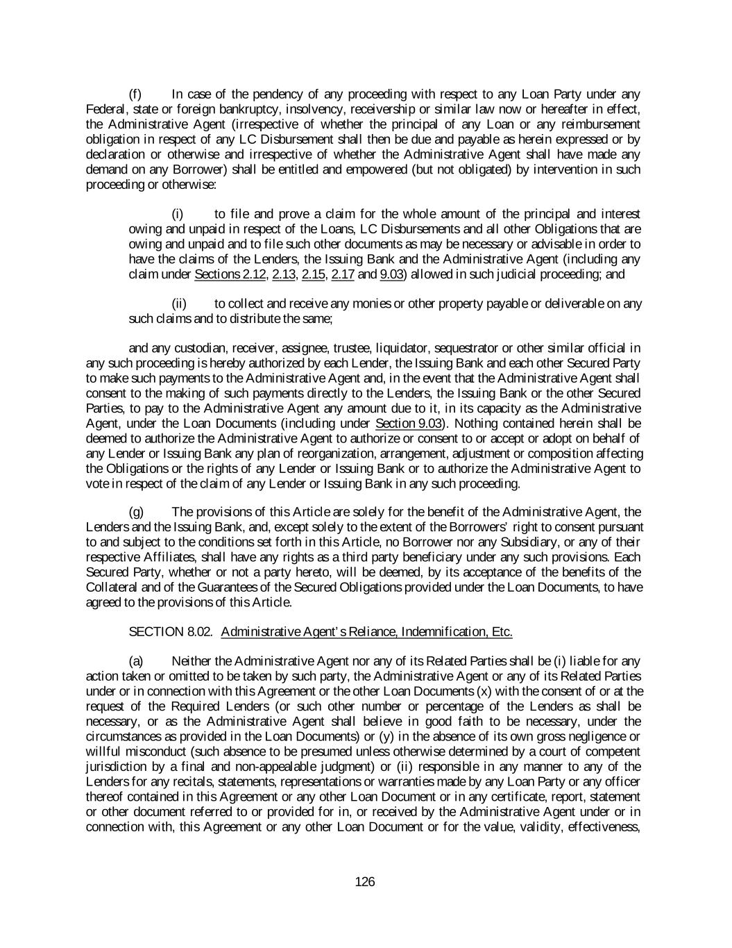 (f) In case of the pendency of any proceeding with respect to any Loan Party under any Federal, state or foreign bankruptcy, insolvency, receivership or similar law now or hereafter in effect, the Administrative Agent (irrespective of whether the principal of any Loan or any reimbursement obligation in respect of any LC Disbursement shall then be due and payable as herein expressed or by declaration or otherwise and irrespective of whether the Administrative Agent shall have made any demand on any Borrower) shall be entitled and empowered (but not obligated) by intervention in such proceeding or otherwise: (i) to file and prove a claim for the whole amount of the principal and interest owing and unpaid in respect of the Loans, LC Disbursements and all other Obligations that are owing and unpaid and to file such other documents as may be necessary or advisable in order to have the claims of the Lenders, the Issuing Bank and the Administrative Agent (including any claim under Sections 2.12, 2.13, 2.15, 2.17 and 9.03) allowed in such judicial proceeding; and (ii) to collect and receive any monies or other property payable or deliverable on any such claims and to distribute the same; and any custodian, receiver, assignee, trustee, liquidator, sequestrator or other similar official in any such proceeding is hereby authorized by each Lender, the Issuing Bank and each other Secured Party to make such payments to the Administrative Agent and, in the event that the Administrative Agent shall consent to the making of such payments directly to the Lenders, the Issuing Bank or the other Secured Parties, to pay to the Administrative Agent any amount due to it, in its capacity as the Administrative Agent, under the Loan Documents (including under Section 9.03). Nothing contained herein shall be deemed to authorize the Administrative Agent to authorize or consent to or accept or adopt on behalf of any Lender or Issuing Bank any plan of reorganization, arrangement, adjustment or composition affecting the Obligations or the rights of any Lender or Issuing Bank or to authorize the Administrative Agent to vote in respect of the claim of any Lender or Issuing Bank in any such proceeding. (g) The provisions of this Article are solely for the benefit of the Administrative Agent, the Lenders and the Issuing Bank, and, except solely to the extent of the Borrowers’ right to consent pursuant to and subject to the conditions set forth in this Article, no Borrower nor any Subsidiary, or any of their respective Affiliates, shall have any rights as a third party beneficiary under any such provisions. Each Secured Party, whether or not a party hereto, will be deemed, by its acceptance of the benefits of the Collateral and of the Guarantees of the Secured Obligations provided under the Loan Documents, to have agreed to the provisions of this Article. SECTION 8.02. Administrative Agent’s Reliance, Indemnification, Etc. (a) Neither the Administrative Agent nor any of its Related Parties shall be (i) liable for any action taken or omitted to be taken by such party, the Administrative Agent or any of its Related Parties under or in connection with this Agreement or the other Loan Documents (x) with the consent of or at the request of the Required Lenders (or such other number or percentage of the Lenders as shall be necessary, or as the Administrative Agent shall believe in good faith to be necessary, under the circumstances as provided in the Loan Documents) or (y) in the absence of its own gross negligence or willful misconduct (such absence to be presumed unless otherwise determined by a court of competent jurisdiction by a final and non-appealable judgment) or (ii) responsible in any manner to any of the Lenders for any recitals, statements, representations or warranties made by any Loan Party or any officer thereof contained in this Agreement or any other Loan Document or in any certificate, report, statement or other document referred to or provided for in, or received by the Administrative Agent under or in connection with, this Agreement or any other Loan Document or for the value, validity, effectiveness, 126