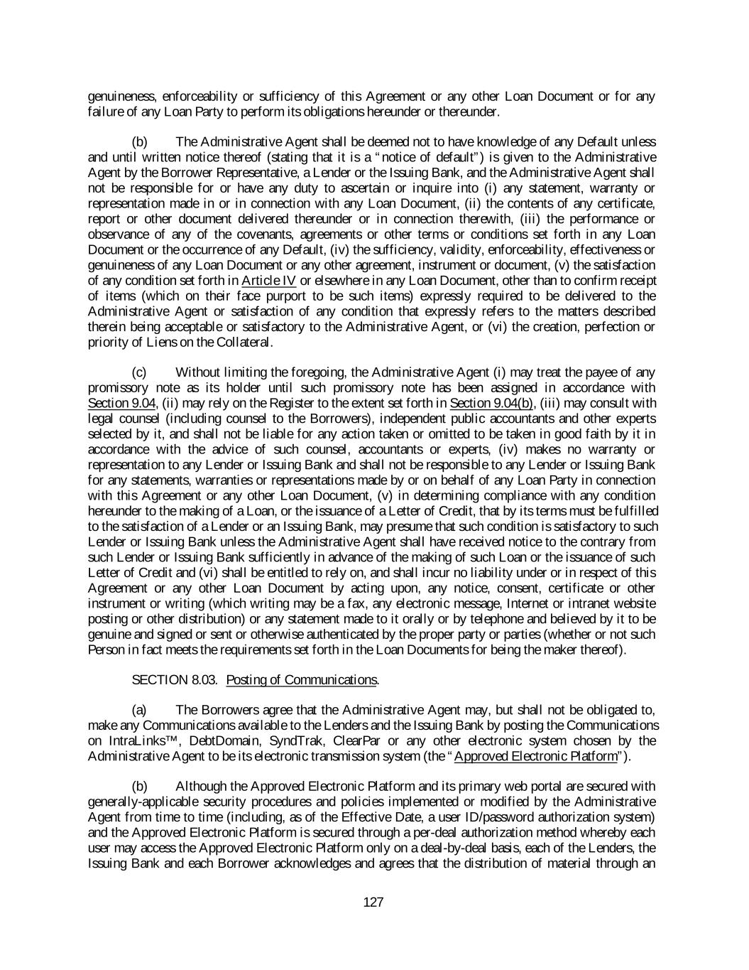 genuineness, enforceability or sufficiency of this Agreement or any other Loan Document or for any failure of any Loan Party to perform its obligations hereunder or thereunder. (b) The Administrative Agent shall be deemed not to have knowledge of any Default unless and until written notice thereof (stating that it is a “notice of default”) is given to the Administrative Agent by the Borrower Representative, a Lender or the Issuing Bank, and the Administrative Agent shall not be responsible for or have any duty to ascertain or inquire into (i) any statement, warranty or representation made in or in connection with any Loan Document, (ii) the contents of any certificate, report or other document delivered thereunder or in connection therewith, (iii) the performance or observance of any of the covenants, agreements or other terms or conditions set forth in any Loan Document or the occurrence of any Default, (iv) the sufficiency, validity, enforceability, effectiveness or genuineness of any Loan Document or any other agreement, instrument or document, (v) the satisfaction of any condition set forth in Article IV or elsewhere in any Loan Document, other than to confirm receipt of items (which on their face purport to be such items) expressly required to be delivered to the Administrative Agent or satisfaction of any condition that expressly refers to the matters described therein being acceptable or satisfactory to the Administrative Agent, or (vi) the creation, perfection or priority of Liens on the Collateral. (c) Without limiting the foregoing, the Administrative Agent (i) may treat the payee of any promissory note as its holder until such promissory note has been assigned in accordance with Section 9.04, (ii) may rely on the Register to the extent set forth in Section 9.04(b), (iii) may consult with legal counsel (including counsel to the Borrowers), independent public accountants and other experts selected by it, and shall not be liable for any action taken or omitted to be taken in good faith by it in accordance with the advice of such counsel, accountants or experts, (iv) makes no warranty or representation to any Lender or Issuing Bank and shall not be responsible to any Lender or Issuing Bank for any statements, warranties or representations made by or on behalf of any Loan Party in connection with this Agreement or any other Loan Document, (v) in determining compliance with any condition hereunder to the making of a Loan, or the issuance of a Letter of Credit, that by its terms must be fulfilled to the satisfaction of a Lender or an Issuing Bank, may presume that such condition is satisfactory to such Lender or Issuing Bank unless the Administrative Agent shall have received notice to the contrary from such Lender or Issuing Bank sufficiently in advance of the making of such Loan or the issuance of such Letter of Credit and (vi) shall be entitled to rely on, and shall incur no liability under or in respect of this Agreement or any other Loan Document by acting upon, any notice, consent, certificate or other instrument or writing (which writing may be a fax, any electronic message, Internet or intranet website posting or other distribution) or any statement made to it orally or by telephone and believed by it to be genuine and signed or sent or otherwise authenticated by the proper party or parties (whether or not such Person in fact meets the requirements set forth in the Loan Documents for being the maker thereof). SECTION 8.03. Posting of Communications. (a) The Borrowers agree that the Administrative Agent may, but shall not be obligated to, make any Communications available to the Lenders and the Issuing Bank by posting the Communications on IntraLinks™, DebtDomain, SyndTrak, ClearPar or any other electronic system chosen by the Administrative Agent to be its electronic transmission system (the “Approved Electronic Platform”). (b) Although the Approved Electronic Platform and its primary web portal are secured with generally-applicable security procedures and policies implemented or modified by the Administrative Agent from time to time (including, as of the Effective Date, a user ID/password authorization system) and the Approved Electronic Platform is secured through a per-deal authorization method whereby each user may access the Approved Electronic Platform only on a deal-by-deal basis, each of the Lenders, the Issuing Bank and each Borrower acknowledges and agrees that the distribution of material through an 127