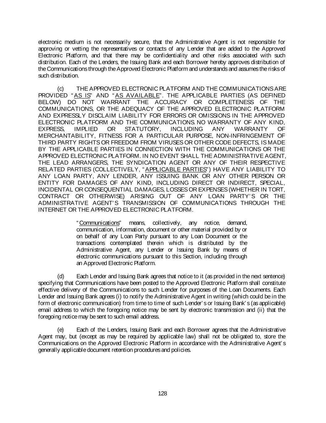 electronic medium is not necessarily secure, that the Administrative Agent is not responsible for approving or vetting the representatives or contacts of any Lender that are added to the Approved Electronic Platform, and that there may be confidentiality and other risks associated with such distribution. Each of the Lenders, the Issuing Bank and each Borrower hereby approves distribution of the Communications through the Approved Electronic Platform and understands and assumes the risks of such distribution. (c) THE APPROVED ELECTRONIC PLATFORM AND THE COMMUNICATIONS ARE PROVIDED “AS IS” AND “AS AVAILABLE”. THE APPLICABLE PARTIES (AS DEFINED BELOW) DO NOT WARRANT THE ACCURACY OR COMPLETENESS OF THE COMMUNICATIONS, OR THE ADEQUACY OF THE APPROVED ELECTRONIC PLATFORM AND EXPRESSLY DISCLAIM LIABILITY FOR ERRORS OR OMISSIONS IN THE APPROVED ELECTRONIC PLATFORM AND THE COMMUNICATIONS. NO WARRANTY OF ANY KIND, EXPRESS, IMPLIED OR STATUTORY, INCLUDING ANY WARRANTY OF MERCHANTABILITY, FITNESS FOR A PARTICULAR PURPOSE, NON-INFRINGEMENT OF THIRD PARTY RIGHTS OR FREEDOM FROM VIRUSES OR OTHER CODE DEFECTS, IS MADE BY THE APPLICABLE PARTIES IN CONNECTION WITH THE COMMUNICATIONS OR THE APPROVED ELECTRONIC PLATFORM. IN NO EVENT SHALL THE ADMINISTRATIVE AGENT, THE LEAD ARRANGERS, THE SYNDICATION AGENT OR ANY OF THEIR RESPECTIVE RELATED PARTIES (COLLECTIVELY, “APPLICABLE PARTIES”) HAVE ANY LIABILITY TO ANY LOAN PARTY, ANY LENDER, ANY ISSUING BANK OR ANY OTHER PERSON OR ENTITY FOR DAMAGES OF ANY KIND, INCLUDING DIRECT OR INDIRECT, SPECIAL, INCIDENTAL OR CONSEQUENTIAL DAMAGES, LOSSES OR EXPENSES (WHETHER IN TORT, CONTRACT OR OTHERWISE) ARISING OUT OF ANY LOAN PARTY’S OR THE ADMINISTRATIVE AGENT’S TRANSMISSION OF COMMUNICATIONS THROUGH THE INTERNET OR THE APPROVED ELECTRONIC PLATFORM. “Communications” means, collectively, any notice, demand, communication, information, document or other material provided by or on behalf of any Loan Party pursuant to any Loan Document or the transactions contemplated therein which is distributed by the Administrative Agent, any Lender or Issuing Bank by means of electronic communications pursuant to this Section, including through an Approved Electronic Platform. (d) Each Lender and Issuing Bank agrees that notice to it (as provided in the next sentence) specifying that Communications have been posted to the Approved Electronic Platform shall constitute effective delivery of the Communications to such Lender for purposes of the Loan Documents. Each Lender and Issuing Bank agrees (i) to notify the Administrative Agent in writing (which could be in the form of electronic communication) from time to time of such Lender’s or Issuing Bank’s (as applicable) email address to which the foregoing notice may be sent by electronic transmission and (ii) that the foregoing notice may be sent to such email address. (e) Each of the Lenders, Issuing Bank and each Borrower agrees that the Administrative Agent may, but (except as may be required by applicable law) shall not be obligated to, store the Communications on the Approved Electronic Platform in accordance with the Administrative Agent’s generally applicable document retention procedures and policies. 128