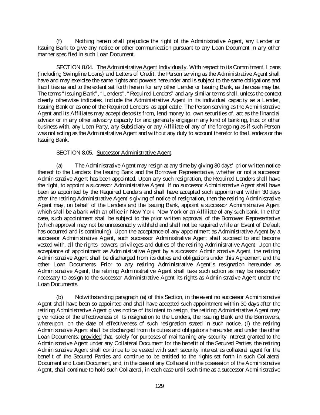 (f) Nothing herein shall prejudice the right of the Administrative Agent, any Lender or Issuing Bank to give any notice or other communication pursuant to any Loan Document in any other manner specified in such Loan Document. SECTION 8.04. The Administrative Agent Individually. With respect to its Commitment, Loans (including Swingline Loans) and Letters of Credit, the Person serving as the Administrative Agent shall have and may exercise the same rights and powers hereunder and is subject to the same obligations and liabilities as and to the extent set forth herein for any other Lender or Issuing Bank, as the case may be. The terms “Issuing Bank”, “Lenders”, “Required Lenders” and any similar terms shall, unless the context clearly otherwise indicates, include the Administrative Agent in its individual capacity as a Lender, Issuing Bank or as one of the Required Lenders, as applicable. The Person serving as the Administrative Agent and its Affiliates may accept deposits from, lend money to, own securities of, act as the financial advisor or in any other advisory capacity for and generally engage in any kind of banking, trust or other business with, any Loan Party, any Subsidiary or any Affiliate of any of the foregoing as if such Person was not acting as the Administrative Agent and without any duty to account therefor to the Lenders or the Issuing Bank. SECTION 8.05. Successor Administrative Agent. (a) The Administrative Agent may resign at any time by giving 30 days’ prior written notice thereof to the Lenders, the Issuing Bank and the Borrower Representative, whether or not a successor Administrative Agent has been appointed. Upon any such resignation, the Required Lenders shall have the right, to appoint a successor Administrative Agent. If no successor Administrative Agent shall have been so appointed by the Required Lenders and shall have accepted such appointment within 30 days after the retiring Administrative Agent’s giving of notice of resignation, then the retiring Administrative Agent may, on behalf of the Lenders and the Issuing Bank, appoint a successor Administrative Agent which shall be a bank with an office in New York, New York or an Affiliate of any such bank. In either case, such appointment shall be subject to the prior written approval of the Borrower Representative (which approval may not be unreasonably withheld and shall not be required while an Event of Default has occurred and is continuing). Upon the acceptance of any appointment as Administrative Agent by a successor Administrative Agent, such successor Administrative Agent shall succeed to and become vested with, all the rights, powers, privileges and duties of the retiring Administrative Agent. Upon the acceptance of appointment as Administrative Agent by a successor Administrative Agent, the retiring Administrative Agent shall be discharged from its duties and obligations under this Agreement and the other Loan Documents. Prior to any retiring Administrative Agent’s resignation hereunder as Administrative Agent, the retiring Administrative Agent shall take such action as may be reasonably necessary to assign to the successor Administrative Agent its rights as Administrative Agent under the Loan Documents. (b) Notwithstanding paragraph (a) of this Section, in the event no successor Administrative Agent shall have been so appointed and shall have accepted such appointment within 30 days after the retiring Administrative Agent gives notice of its intent to resign, the retiring Administrative Agent may give notice of the effectiveness of its resignation to the Lenders, the Issuing Bank and the Borrowers, whereupon, on the date of effectiveness of such resignation stated in such notice, (i) the retiring Administrative Agent shall be discharged from its duties and obligations hereunder and under the other Loan Documents; provided that, solely for purposes of maintaining any security interest granted to the Administrative Agent under any Collateral Document for the benefit of the Secured Parties, the retiring Administrative Agent shall continue to be vested with such security interest as collateral agent for the benefit of the Secured Parties and continue to be entitled to the rights set forth in such Collateral Document and Loan Document, and, in the case of any Collateral in the possession of the Administrative Agent, shall continue to hold such Collateral, in each case until such time as a successor Administrative 129