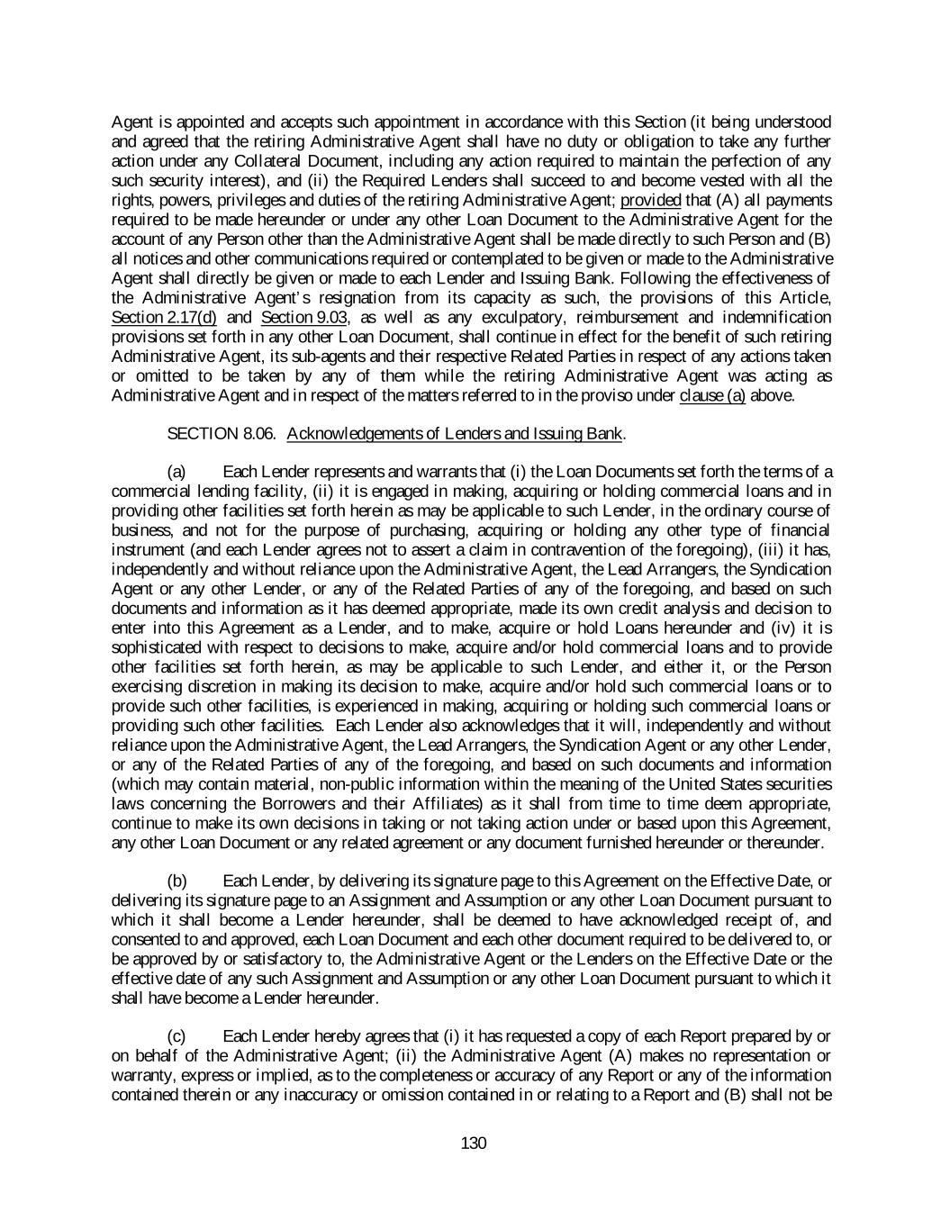Agent is appointed and accepts such appointment in accordance with this Section (it being understood and agreed that the retiring Administrative Agent shall have no duty or obligation to take any further action under any Collateral Document, including any action required to maintain the perfection of any such security interest), and (ii) the Required Lenders shall succeed to and become vested with all the rights, powers, privileges and duties of the retiring Administrative Agent; provided that (A) all payments required to be made hereunder or under any other Loan Document to the Administrative Agent for the account of any Person other than the Administrative Agent shall be made directly to such Person and (B) all notices and other communications required or contemplated to be given or made to the Administrative Agent shall directly be given or made to each Lender and Issuing Bank. Following the effectiveness of the Administrative Agent’s resignation from its capacity as such, the provisions of this Article, Section 2.17(d) and Section 9.03, as well as any exculpatory, reimbursement and indemnification provisions set forth in any other Loan Document, shall continue in effect for the benefit of such retiring Administrative Agent, its sub-agents and their respective Related Parties in respect of any actions taken or omitted to be taken by any of them while the retiring Administrative Agent was acting as Administrative Agent and in respect of the matters referred to in the proviso under clause (a) above. SECTION 8.06. Acknowledgements of Lenders and Issuing Bank. (a) Each Lender represents and warrants that (i) the Loan Documents set forth the terms of a commercial lending facility, (ii) it is engaged in making, acquiring or holding commercial loans and in providing other facilities set forth herein as may be applicable to such Lender, in the ordinary course of business, and not for the purpose of purchasing, acquiring or holding any other type of financial instrument (and each Lender agrees not to assert a claim in contravention of the foregoing), (iii) it has, independently and without reliance upon the Administrative Agent, the Lead Arrangers, the Syndication Agent or any other Lender, or any of the Related Parties of any of the foregoing, and based on such documents and information as it has deemed appropriate, made its own credit analysis and decision to enter into this Agreement as a Lender, and to make, acquire or hold Loans hereunder and (iv) it is sophisticated with respect to decisions to make, acquire and/or hold commercial loans and to provide other facilities set forth herein, as may be applicable to such Lender, and either it, or the Person exercising discretion in making its decision to make, acquire and/or hold such commercial loans or to provide such other facilities, is experienced in making, acquiring or holding such commercial loans or providing such other facilities. Each Lender also acknowledges that it will, independently and without reliance upon the Administrative Agent, the Lead Arrangers, the Syndication Agent or any other Lender, or any of the Related Parties of any of the foregoing, and based on such documents and information (which may contain material, non-public information within the meaning of the United States securities laws concerning the Borrowers and their Affiliates) as it shall from time to time deem appropriate, continue to make its own decisions in taking or not taking action under or based upon this Agreement, any other Loan Document or any related agreement or any document furnished hereunder or thereunder. (b) Each Lender, by delivering its signature page to this Agreement on the Effective Date, or delivering its signature page to an Assignment and Assumption or any other Loan Document pursuant to which it shall become a Lender hereunder, shall be deemed to have acknowledged receipt of, and consented to and approved, each Loan Document and each other document required to be delivered to, or be approved by or satisfactory to, the Administrative Agent or the Lenders on the Effective Date or the effective date of any such Assignment and Assumption or any other Loan Document pursuant to which it shall have become a Lender hereunder. (c) Each Lender hereby agrees that (i) it has requested a copy of each Report prepared by or on behalf of the Administrative Agent; (ii) the Administrative Agent (A) makes no representation or warranty, express or implied, as to the completeness or accuracy of any Report or any of the information contained therein or any inaccuracy or omission contained in or relating to a Report and (B) shall not be 130