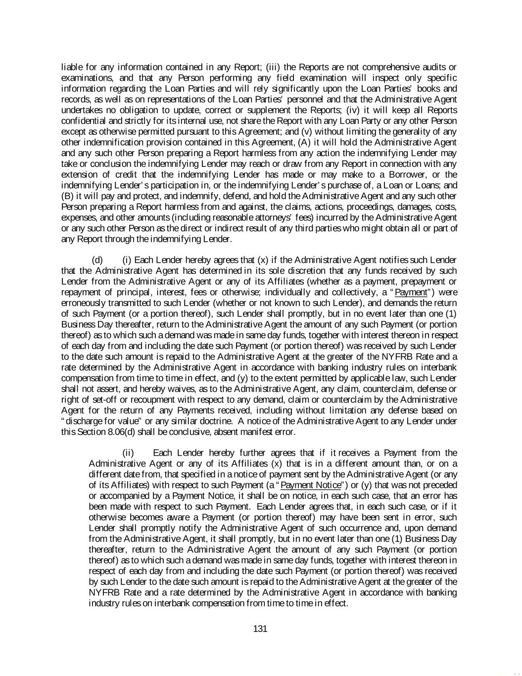 liable for any information contained in any Report; (iii) the Reports are not comprehensive audits or examinations, and that any Person performing any field examination will inspect only specific information regarding the Loan Parties and will rely significantly upon the Loan Parties’ books and records, as well as on representations of the Loan Parties’ personnel and that the Administrative Agent undertakes no obligation to update, correct or supplement the Reports; (iv) it will keep all Reports confidential and strictly for its internal use, not share the Report with any Loan Party or any other Person except as otherwise permitted pursuant to this Agreement; and (v) without limiting the generality of any other indemnification provision contained in this Agreement, (A) it will hold the Administrative Agent and any such other Person preparing a Report harmless from any action the indemnifying Lender may take or conclusion the indemnifying Lender may reach or draw from any Report in connection with any extension of credit that the indemnifying Lender has made or may make to a Borrower, or the indemnifying Lender’s participation in, or the indemnifying Lender’s purchase of, a Loan or Loans; and (B) it will pay and protect, and indemnify, defend, and hold the Administrative Agent and any such other Person preparing a Report harmless from and against, the claims, actions, proceedings, damages, costs, expenses, and other amounts (including reasonable attorneys’ fees) incurred by the Administrative Agent or any such other Person as the direct or indirect result of any third parties who might obtain all or part of any Report through the indemnifying Lender. (d) (i) Each Lender hereby agrees that (x) if the Administrative Agent notifies such Lender that the Administrative Agent has determined in its sole discretion that any funds received by such Lender from the Administrative Agent or any of its Affiliates (whether as a payment, prepayment or repayment of principal, interest, fees or otherwise; individually and collectively, a “Payment”) were erroneously transmitted to such Lender (whether or not known to such Lender), and demands the return of such Payment (or a portion thereof), such Lender shall promptly, but in no event later than one (1) Business Day thereafter, return to the Administrative Agent the amount of any such Payment (or portion thereof) as to which such a demand was made in same day funds, together with interest thereon in respect of each day from and including the date such Payment (or portion thereof) was received by such Lender to the date such amount is repaid to the Administrative Agent at the greater of the NYFRB Rate and a rate determined by the Administrative Agent in accordance with banking industry rules on interbank compensation from time to time in effect, and (y) to the extent permitted by applicable law, such Lender shall not assert, and hereby waives, as to the Administrative Agent, any claim, counterclaim, defense or right of set-off or recoupment with respect to any demand, claim or counterclaim by the Administrative Agent for the return of any Payments received, including without limitation any defense based on “discharge for value” or any similar doctrine. A notice of the Administrative Agent to any Lender under this Section 8.06(d) shall be conclusive, absent manifest error. (ii) Each Lender hereby further agrees that if it receives a Payment from the Administrative Agent or any of its Affiliates (x) that is in a different amount than, or on a different date from, that specified in a notice of payment sent by the Administrative Agent (or any of its Affiliates) with respect to such Payment (a “Payment Notice”) or (y) that was not preceded or accompanied by a Payment Notice, it shall be on notice, in each such case, that an error has been made with respect to such Payment. Each Lender agrees that, in each such case, or if it otherwise becomes aware a Payment (or portion thereof) may have been sent in error, such Lender shall promptly notify the Administrative Agent of such occurrence and, upon demand from the Administrative Agent, it shall promptly, but in no event later than one (1) Business Day thereafter, return to the Administrative Agent the amount of any such Payment (or portion thereof) as to which such a demand was made in same day funds, together with interest thereon in respect of each day from and including the date such Payment (or portion thereof) was received by such Lender to the date such amount is repaid to the Administrative Agent at the greater of the NYFRB Rate and a rate determined by the Administrative Agent in accordance with banking industry rules on interbank compensation from time to time in effect. 131