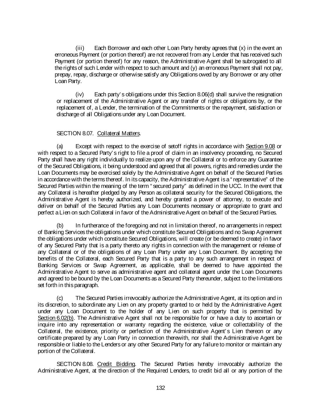 (iii) Each Borrower and each other Loan Party hereby agrees that (x) in the event an erroneous Payment (or portion thereof) are not recovered from any Lender that has received such Payment (or portion thereof) for any reason, the Administrative Agent shall be subrogated to all the rights of such Lender with respect to such amount and (y) an erroneous Payment shall not pay, prepay, repay, discharge or otherwise satisfy any Obligations owed by any Borrower or any other Loan Party. (iv) Each party’s obligations under this Section 8.06(d) shall survive the resignation or replacement of the Administrative Agent or any transfer of rights or obligations by, or the replacement of, a Lender, the termination of the Commitments or the repayment, satisfaction or discharge of all Obligations under any Loan Document. SECTION 8.07. Collateral Matters. (a) Except with respect to the exercise of setoff rights in accordance with Section 9.08 or with respect to a Secured Party’s right to file a proof of claim in an insolvency proceeding, no Secured Party shall have any right individually to realize upon any of the Collateral or to enforce any Guarantee of the Secured Obligations, it being understood and agreed that all powers, rights and remedies under the Loan Documents may be exercised solely by the Administrative Agent on behalf of the Secured Parties in accordance with the terms thereof. In its capacity, the Administrative Agent is a “representative” of the Secured Parties within the meaning of the term “secured party” as defined in the UCC. In the event that any Collateral is hereafter pledged by any Person as collateral security for the Secured Obligations, the Administrative Agent is hereby authorized, and hereby granted a power of attorney, to execute and deliver on behalf of the Secured Parties any Loan Documents necessary or appropriate to grant and perfect a Lien on such Collateral in favor of the Administrative Agent on behalf of the Secured Parties. (b) In furtherance of the foregoing and not in limitation thereof, no arrangements in respect of Banking Services the obligations under which constitute Secured Obligations and no Swap Agreement the obligations under which constitute Secured Obligations, will create (or be deemed to create) in favor of any Secured Party that is a party thereto any rights in connection with the management or release of any Collateral or of the obligations of any Loan Party under any Loan Document. By accepting the benefits of the Collateral, each Secured Party that is a party to any such arrangement in respect of Banking Services or Swap Agreement, as applicable, shall be deemed to have appointed the Administrative Agent to serve as administrative agent and collateral agent under the Loan Documents and agreed to be bound by the Loan Documents as a Secured Party thereunder, subject to the limitations set forth in this paragraph. (c) The Secured Parties irrevocably authorize the Administrative Agent, at its option and in its discretion, to subordinate any Lien on any property granted to or held by the Administrative Agent under any Loan Document to the holder of any Lien on such property that is permitted by Section 6.02(b). The Administrative Agent shall not be responsible for or have a duty to ascertain or inquire into any representation or warranty regarding the existence, value or collectability of the Collateral, the existence, priority or perfection of the Administrative Agent’s Lien thereon or any certificate prepared by any Loan Party in connection therewith, nor shall the Administrative Agent be responsible or liable to the Lenders or any other Secured Party for any failure to monitor or maintain any portion of the Collateral. SECTION 8.08. Credit Bidding. The Secured Parties hereby irrevocably authorize the Administrative Agent, at the direction of the Required Lenders, to credit bid all or any portion of the 132