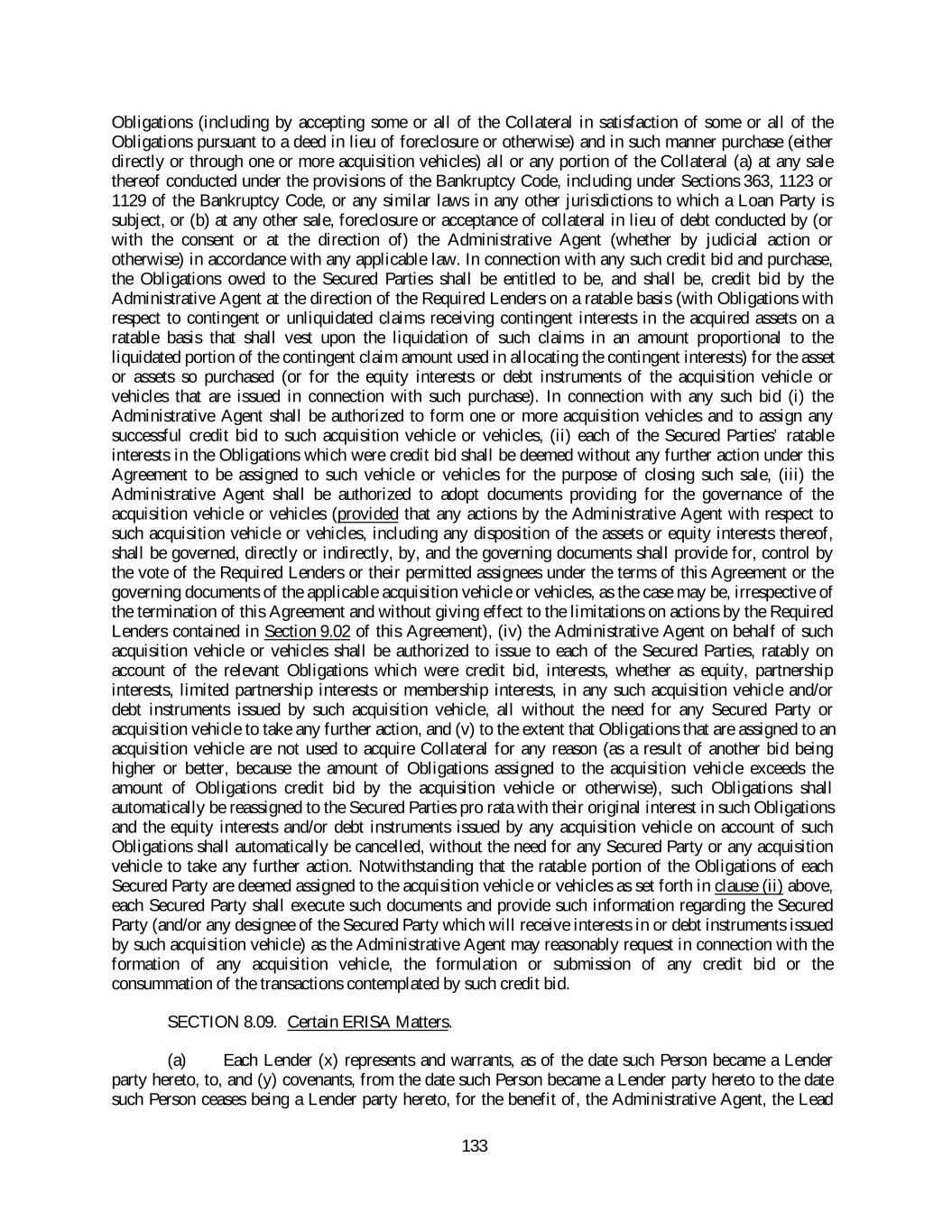 Obligations (including by accepting some or all of the Collateral in satisfaction of some or all of the Obligations pursuant to a deed in lieu of foreclosure or otherwise) and in such manner purchase (either directly or through one or more acquisition vehicles) all or any portion of the Collateral (a) at any sale thereof conducted under the provisions of the Bankruptcy Code, including under Sections 363, 1123 or 1129 of the Bankruptcy Code, or any similar laws in any other jurisdictions to which a Loan Party is subject, or (b) at any other sale, foreclosure or acceptance of collateral in lieu of debt conducted by (or with the consent or at the direction of) the Administrative Agent (whether by judicial action or otherwise) in accordance with any applicable law. In connection with any such credit bid and purchase, the Obligations owed to the Secured Parties shall be entitled to be, and shall be, credit bid by the Administrative Agent at the direction of the Required Lenders on a ratable basis (with Obligations with respect to contingent or unliquidated claims receiving contingent interests in the acquired assets on a ratable basis that shall vest upon the liquidation of such claims in an amount proportional to the liquidated portion of the contingent claim amount used in allocating the contingent interests) for the asset or assets so purchased (or for the equity interests or debt instruments of the acquisition vehicle or vehicles that are issued in connection with such purchase). In connection with any such bid (i) the Administrative Agent shall be authorized to form one or more acquisition vehicles and to assign any successful credit bid to such acquisition vehicle or vehicles, (ii) each of the Secured Parties’ ratable interests in the Obligations which were credit bid shall be deemed without any further action under this Agreement to be assigned to such vehicle or vehicles for the purpose of closing such sale, (iii) the Administrative Agent shall be authorized to adopt documents providing for the governance of the acquisition vehicle or vehicles (provided that any actions by the Administrative Agent with respect to such acquisition vehicle or vehicles, including any disposition of the assets or equity interests thereof, shall be governed, directly or indirectly, by, and the governing documents shall provide for, control by the vote of the Required Lenders or their permitted assignees under the terms of this Agreement or the governing documents of the applicable acquisition vehicle or vehicles, as the case may be, irrespective of the termination of this Agreement and without giving effect to the limitations on actions by the Required Lenders contained in Section 9.02 of this Agreement), (iv) the Administrative Agent on behalf of such acquisition vehicle or vehicles shall be authorized to issue to each of the Secured Parties, ratably on account of the relevant Obligations which were credit bid, interests, whether as equity, partnership interests, limited partnership interests or membership interests, in any such acquisition vehicle and/or debt instruments issued by such acquisition vehicle, all without the need for any Secured Party or acquisition vehicle to take any further action, and (v) to the extent that Obligations that are assigned to an acquisition vehicle are not used to acquire Collateral for any reason (as a result of another bid being higher or better, because the amount of Obligations assigned to the acquisition vehicle exceeds the amount of Obligations credit bid by the acquisition vehicle or otherwise), such Obligations shall automatically be reassigned to the Secured Parties pro rata with their original interest in such Obligations and the equity interests and/or debt instruments issued by any acquisition vehicle on account of such Obligations shall automatically be cancelled, without the need for any Secured Party or any acquisition vehicle to take any further action. Notwithstanding that the ratable portion of the Obligations of each Secured Party are deemed assigned to the acquisition vehicle or vehicles as set forth in clause (ii) above, each Secured Party shall execute such documents and provide such information regarding the Secured Party (and/or any designee of the Secured Party which will receive interests in or debt instruments issued by such acquisition vehicle) as the Administrative Agent may reasonably request in connection with the formation of any acquisition vehicle, the formulation or submission of any credit bid or the consummation of the transactions contemplated by such credit bid. SECTION 8.09. Certain ERISA Matters. (a) Each Lender (x) represents and warrants, as of the date such Person became a Lender party hereto, to, and (y) covenants, from the date such Person became a Lender party hereto to the date such Person ceases being a Lender party hereto, for the benefit of, the Administrative Agent, the Lead 133