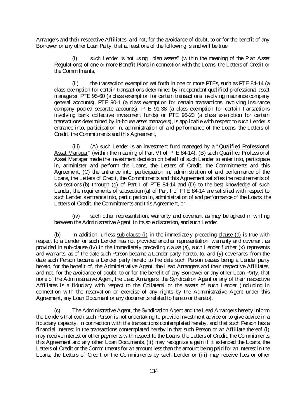 Arrangers and their respective Affiliates, and not, for the avoidance of doubt, to or for the benefit of any Borrower or any other Loan Party, that at least one of the following is and will be true: (i) such Lender is not using “plan assets” (within the meaning of the Plan Asset Regulations) of one or more Benefit Plans in connection with the Loans, the Letters of Credit or the Commitments, (ii) the transaction exemption set forth in one or more PTEs, such as PTE 84-14 (a class exemption for certain transactions determined by independent qualified professional asset managers), PTE 95-60 (a class exemption for certain transactions involving insurance company general accounts), PTE 90-1 (a class exemption for certain transactions involving insurance company pooled separate accounts), PTE 91-38 (a class exemption for certain transactions involving bank collective investment funds) or PTE 96-23 (a class exemption for certain transactions determined by in-house asset managers), is applicable with respect to such Lender’s entrance into, participation in, administration of and performance of the Loans, the Letters of Credit, the Commitments and this Agreement, (iii) (A) such Lender is an investment fund managed by a “Qualified Professional Asset Manager” (within the meaning of Part VI of PTE 84-14), (B) such Qualified Professional Asset Manager made the investment decision on behalf of such Lender to enter into, participate in, administer and perform the Loans, the Letters of Credit, the Commitments and this Agreement, (C) the entrance into, participation in, administration of and performance of the Loans, the Letters of Credit, the Commitments and this Agreement satisfies the requirements of sub-sections (b) through (g) of Part I of PTE 84-14 and (D) to the best knowledge of such Lender, the requirements of subsection (a) of Part I of PTE 84-14 are satisfied with respect to such Lender’s entrance into, participation in, administration of and performance of the Loans, the Letters of Credit, the Commitments and this Agreement, or (iv) such other representation, warranty and covenant as may be agreed in writing between the Administrative Agent, in its sole discretion, and such Lender. (b) In addition, unless sub-clause (i) in the immediately preceding clause (a) is true with respect to a Lender or such Lender has not provided another representation, warranty and covenant as provided in sub-clause (iv) in the immediately preceding clause (a), such Lender further (x) represents and warrants, as of the date such Person became a Lender party hereto, to, and (y) covenants, from the date such Person became a Lender party hereto to the date such Person ceases being a Lender party hereto, for the benefit of, the Administrative Agent, the Lead Arrangers and their respective Affiliates, and not, for the avoidance of doubt, to or for the benefit of any Borrower or any other Loan Party, that none of the Administrative Agent, the Lead Arrangers, the Syndication Agent or any of their respective Affiliates is a fiduciary with respect to the Collateral or the assets of such Lender (including in connection with the reservation or exercise of any rights by the Administrative Agent under this Agreement, any Loan Document or any documents related to hereto or thereto). (c) The Administrative Agent, the Syndication Agent and the Lead Arrangers hereby inform the Lenders that each such Person is not undertaking to provide investment advice or to give advice in a fiduciary capacity, in connection with the transactions contemplated hereby, and that such Person has a financial interest in the transactions contemplated hereby in that such Person or an Affiliate thereof (i) may receive interest or other payments with respect to the Loans, the Letters of Credit, the Commitments, this Agreement and any other Loan Documents, (ii) may recognize a gain if it extended the Loans, the Letters of Credit or the Commitments for an amount less than the amount being paid for an interest in the Loans, the Letters of Credit or the Commitments by such Lender or (iii) may receive fees or other 134