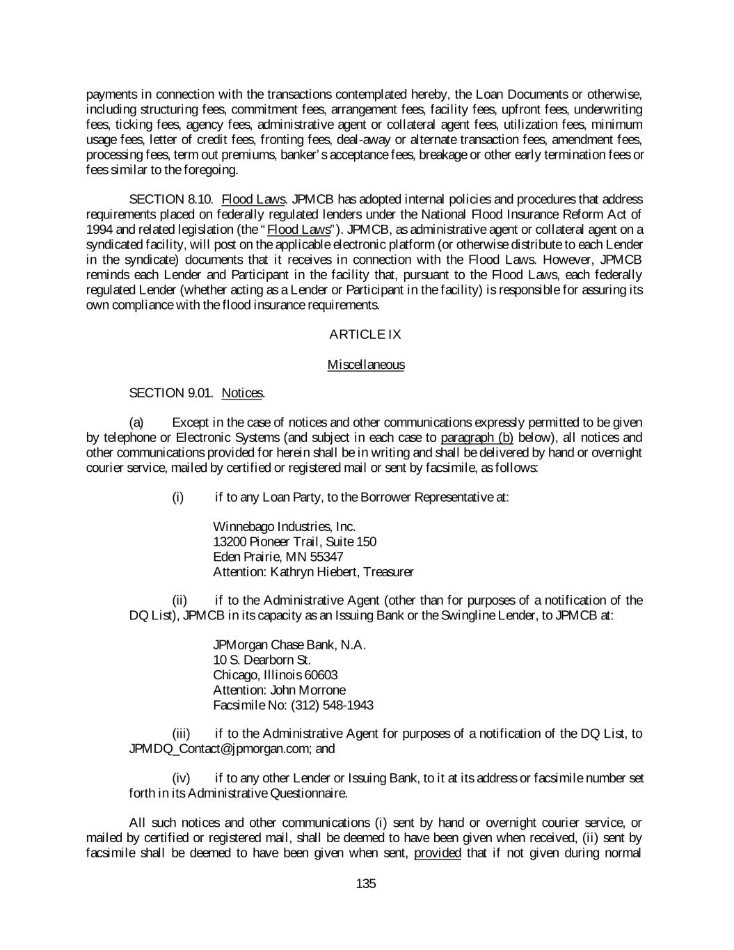 payments in connection with the transactions contemplated hereby, the Loan Documents or otherwise, including structuring fees, commitment fees, arrangement fees, facility fees, upfront fees, underwriting fees, ticking fees, agency fees, administrative agent or collateral agent fees, utilization fees, minimum usage fees, letter of credit fees, fronting fees, deal-away or alternate transaction fees, amendment fees, processing fees, term out premiums, banker’s acceptance fees, breakage or other early termination fees or fees similar to the foregoing. SECTION 8.10. Flood Laws. JPMCB has adopted internal policies and procedures that address requirements placed on federally regulated lenders under the National Flood Insurance Reform Act of 1994 and related legislation (the “Flood Laws”). JPMCB, as administrative agent or collateral agent on a syndicated facility, will post on the applicable electronic platform (or otherwise distribute to each Lender in the syndicate) documents that it receives in connection with the Flood Laws. However, JPMCB reminds each Lender and Participant in the facility that, pursuant to the Flood Laws, each federally regulated Lender (whether acting as a Lender or Participant in the facility) is responsible for assuring its own compliance with the flood insurance requirements. ARTICLE IX Miscellaneous SECTION 9.01. Notices. (a) Except in the case of notices and other communications expressly permitted to be given by telephone or Electronic Systems (and subject in each case to paragraph (b) below), all notices and other communications provided for herein shall be in writing and shall be delivered by hand or overnight courier service, mailed by certified or registered mail or sent by facsimile, as follows: (i) if to any Loan Party, to the Borrower Representative at: Winnebago Industries, Inc. 13200 Pioneer Trail, Suite 150 Eden Prairie, MN 55347 Attention: Kathryn Hiebert, Treasurer (ii) if to the Administrative Agent (other than for purposes of a notification of the DQ List), JPMCB in its capacity as an Issuing Bank or the Swingline Lender, to JPMCB at: JPMorgan Chase Bank, N.A. 10 S. Dearborn St. Chicago, Illinois 60603 Attention: John Morrone Facsimile No: (312) 548-1943 (iii) if to the Administrative Agent for purposes of a notification of the DQ List, to JPMDQ_Contact@jpmorgan.com; and (iv) if to any other Lender or Issuing Bank, to it at its address or facsimile number set forth in its Administrative Questionnaire. All such notices and other communications (i) sent by hand or overnight courier service, or mailed by certified or registered mail, shall be deemed to have been given when received, (ii) sent by facsimile shall be deemed to have been given when sent, provided that if not given during normal 135