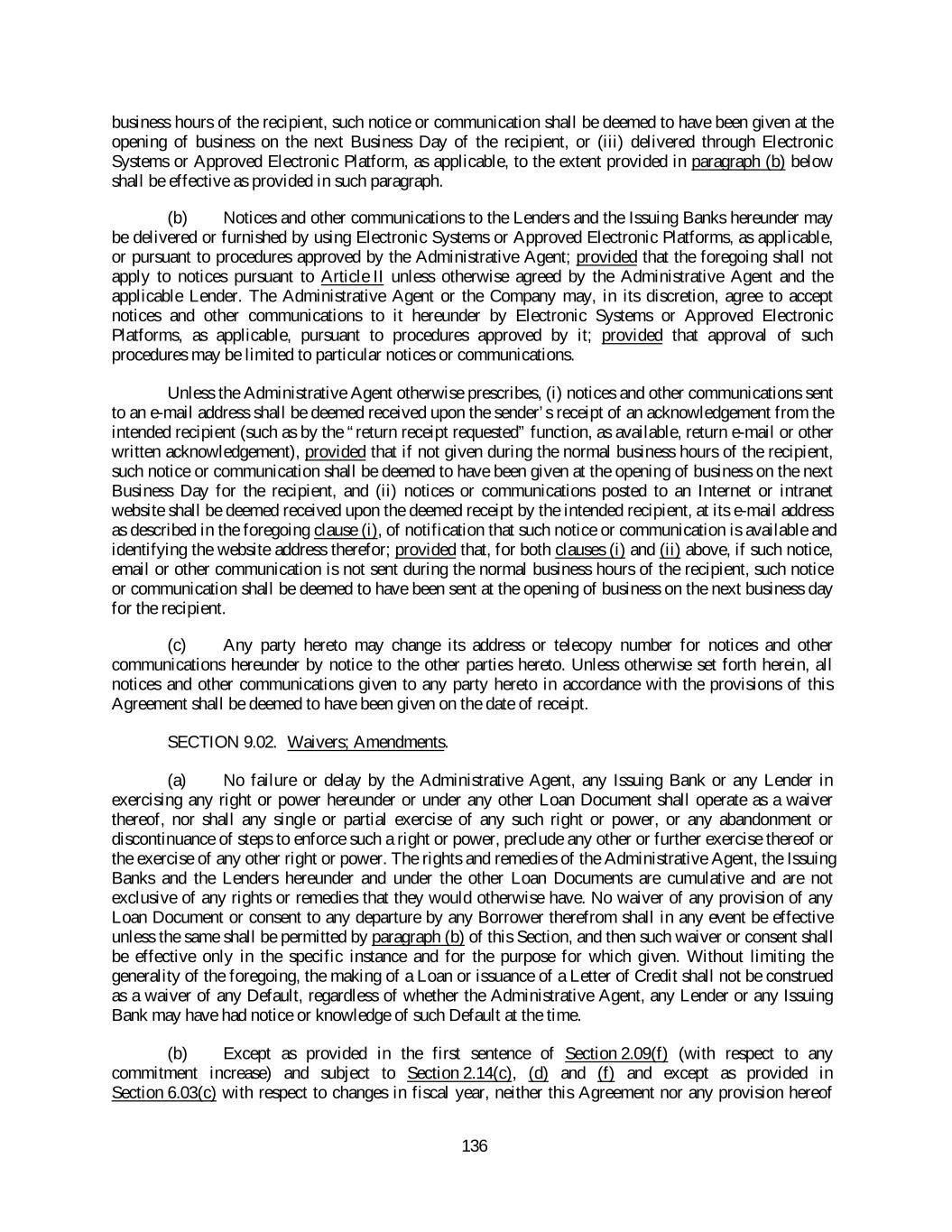 business hours of the recipient, such notice or communication shall be deemed to have been given at the opening of business on the next Business Day of the recipient, or (iii) delivered through Electronic Systems or Approved Electronic Platform, as applicable, to the extent provided in paragraph (b) below shall be effective as provided in such paragraph. (b) Notices and other communications to the Lenders and the Issuing Banks hereunder may be delivered or furnished by using Electronic Systems or Approved Electronic Platforms, as applicable, or pursuant to procedures approved by the Administrative Agent; provided that the foregoing shall not apply to notices pursuant to Article II unless otherwise agreed by the Administrative Agent and the applicable Lender. The Administrative Agent or the Company may, in its discretion, agree to accept notices and other communications to it hereunder by Electronic Systems or Approved Electronic Platforms, as applicable, pursuant to procedures approved by it; provided that approval of such procedures may be limited to particular notices or communications. Unless the Administrative Agent otherwise prescribes, (i) notices and other communications sent to an e-mail address shall be deemed received upon the sender’s receipt of an acknowledgement from the intended recipient (such as by the “return receipt requested” function, as available, return e-mail or other written acknowledgement), provided that if not given during the normal business hours of the recipient, such notice or communication shall be deemed to have been given at the opening of business on the next Business Day for the recipient, and (ii) notices or communications posted to an Internet or intranet website shall be deemed received upon the deemed receipt by the intended recipient, at its e-mail address as described in the foregoing clause (i), of notification that such notice or communication is available and identifying the website address therefor; provided that, for both clauses (i) and (ii) above, if such notice, email or other communication is not sent during the normal business hours of the recipient, such notice or communication shall be deemed to have been sent at the opening of business on the next business day for the recipient. (c) Any party hereto may change its address or telecopy number for notices and other communications hereunder by notice to the other parties hereto. Unless otherwise set forth herein, all notices and other communications given to any party hereto in accordance with the provisions of this Agreement shall be deemed to have been given on the date of receipt. SECTION 9.02. Waivers; Amendments. (a) No failure or delay by the Administrative Agent, any Issuing Bank or any Lender in exercising any right or power hereunder or under any other Loan Document shall operate as a waiver thereof, nor shall any single or partial exercise of any such right or power, or any abandonment or discontinuance of steps to enforce such a right or power, preclude any other or further exercise thereof or the exercise of any other right or power. The rights and remedies of the Administrative Agent, the Issuing Banks and the Lenders hereunder and under the other Loan Documents are cumulative and are not exclusive of any rights or remedies that they would otherwise have. No waiver of any provision of any Loan Document or consent to any departure by any Borrower therefrom shall in any event be effective unless the same shall be permitted by paragraph (b) of this Section, and then such waiver or consent shall be effective only in the specific instance and for the purpose for which given. Without limiting the generality of the foregoing, the making of a Loan or issuance of a Letter of Credit shall not be construed as a waiver of any Default, regardless of whether the Administrative Agent, any Lender or any Issuing Bank may have had notice or knowledge of such Default at the time. (b) Except as provided in the first sentence of Section 2.09(f) (with respect to any commitment increase) and subject to Section 2.14(c), (d) and (f) and except as provided in Section 6.03(c) with respect to changes in fiscal year, neither this Agreement nor any provision hereof 136