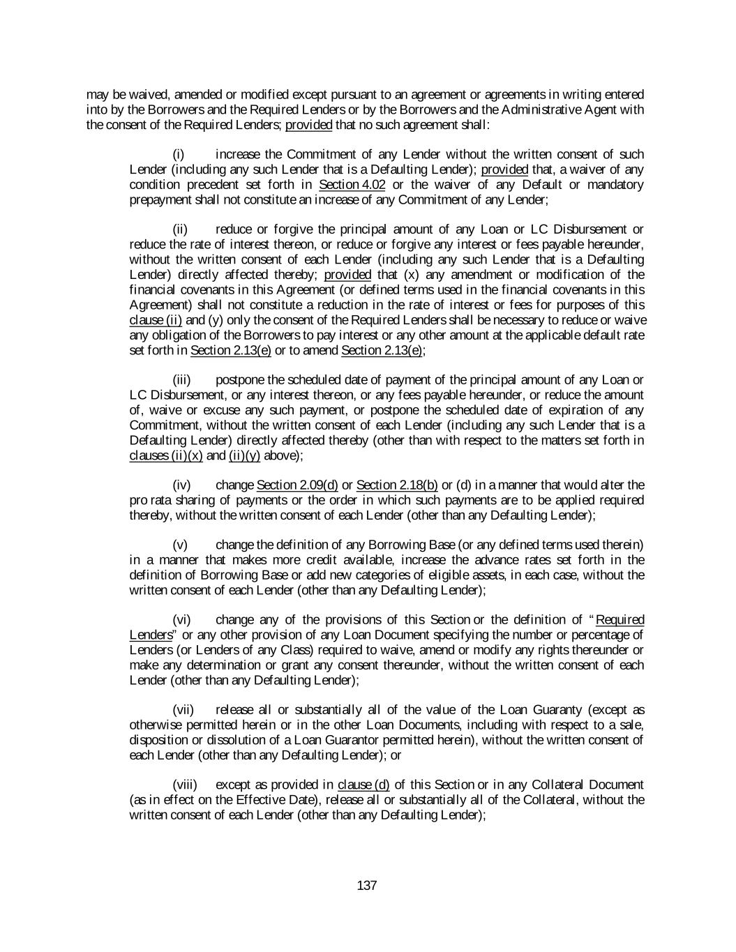 may be waived, amended or modified except pursuant to an agreement or agreements in writing entered into by the Borrowers and the Required Lenders or by the Borrowers and the Administrative Agent with the consent of the Required Lenders; provided that no such agreement shall: (i) increase the Commitment of any Lender without the written consent of such Lender (including any such Lender that is a Defaulting Lender); provided that, a waiver of any condition precedent set forth in Section 4.02 or the waiver of any Default or mandatory prepayment shall not constitute an increase of any Commitment of any Lender; (ii) reduce or forgive the principal amount of any Loan or LC Disbursement or reduce the rate of interest thereon, or reduce or forgive any interest or fees payable hereunder, without the written consent of each Lender (including any such Lender that is a Defaulting Lender) directly affected thereby; provided that (x) any amendment or modification of the financial covenants in this Agreement (or defined terms used in the financial covenants in this Agreement) shall not constitute a reduction in the rate of interest or fees for purposes of this clause (ii) and (y) only the consent of the Required Lenders shall be necessary to reduce or waive any obligation of the Borrowers to pay interest or any other amount at the applicable default rate set forth in Section 2.13(e) or to amend Section 2.13(e); (iii) postpone the scheduled date of payment of the principal amount of any Loan or LC Disbursement, or any interest thereon, or any fees payable hereunder, or reduce the amount of, waive or excuse any such payment, or postpone the scheduled date of expiration of any Commitment, without the written consent of each Lender (including any such Lender that is a Defaulting Lender) directly affected thereby (other than with respect to the matters set forth in clauses (ii)(x) and (ii)(y) above); (iv) change Section 2.09(d) or Section 2.18(b) or (d) in a manner that would alter the pro rata sharing of payments or the order in which such payments are to be applied required thereby, without the written consent of each Lender (other than any Defaulting Lender); (v) change the definition of any Borrowing Base (or any defined terms used therein) in a manner that makes more credit available, increase the advance rates set forth in the definition of Borrowing Base or add new categories of eligible assets, in each case, without the written consent of each Lender (other than any Defaulting Lender); (vi) change any of the provisions of this Section or the definition of “Required Lenders” or any other provision of any Loan Document specifying the number or percentage of Lenders (or Lenders of any Class) required to waive, amend or modify any rights thereunder or make any determination or grant any consent thereunder, without the written consent of each Lender (other than any Defaulting Lender); (vii) release all or substantially all of the value of the Loan Guaranty (except as otherwise permitted herein or in the other Loan Documents, including with respect to a sale, disposition or dissolution of a Loan Guarantor permitted herein), without the written consent of each Lender (other than any Defaulting Lender); or (viii) except as provided in clause (d) of this Section or in any Collateral Document (as in effect on the Effective Date), release all or substantially all of the Collateral, without the written consent of each Lender (other than any Defaulting Lender); 137