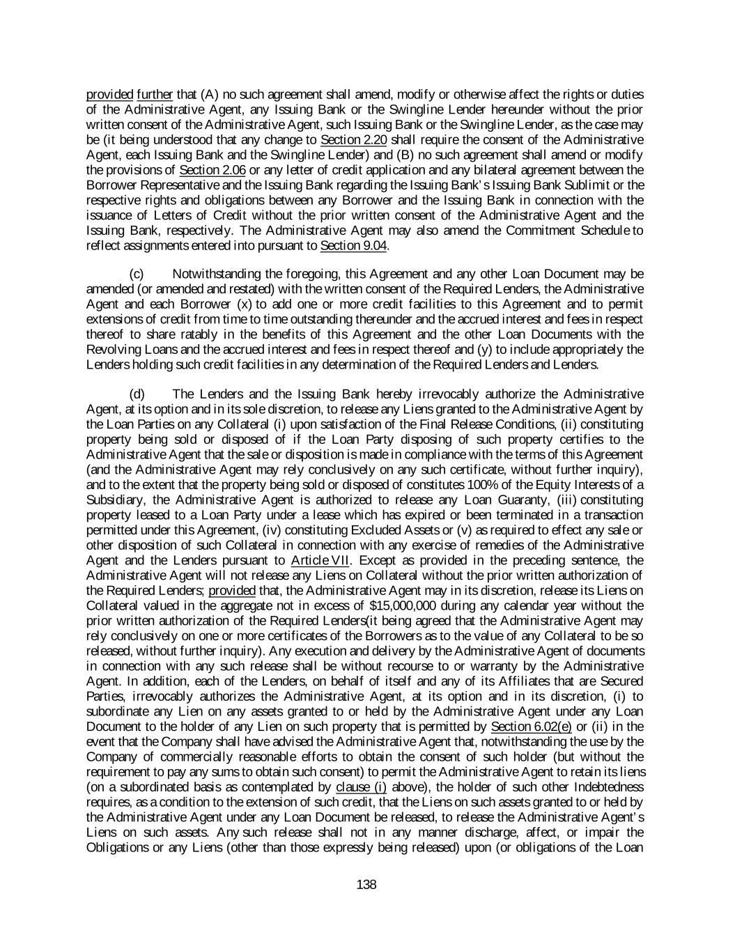 provided further that (A) no such agreement shall amend, modify or otherwise affect the rights or duties of the Administrative Agent, any Issuing Bank or the Swingline Lender hereunder without the prior written consent of the Administrative Agent, such Issuing Bank or the Swingline Lender, as the case may be (it being understood that any change to Section 2.20 shall require the consent of the Administrative Agent, each Issuing Bank and the Swingline Lender) and (B) no such agreement shall amend or modify the provisions of Section 2.06 or any letter of credit application and any bilateral agreement between the Borrower Representative and the Issuing Bank regarding the Issuing Bank’s Issuing Bank Sublimit or the respective rights and obligations between any Borrower and the Issuing Bank in connection with the issuance of Letters of Credit without the prior written consent of the Administrative Agent and the Issuing Bank, respectively. The Administrative Agent may also amend the Commitment Schedule to reflect assignments entered into pursuant to Section 9.04. (c) Notwithstanding the foregoing, this Agreement and any other Loan Document may be amended (or amended and restated) with the written consent of the Required Lenders, the Administrative Agent and each Borrower (x) to add one or more credit facilities to this Agreement and to permit extensions of credit from time to time outstanding thereunder and the accrued interest and fees in respect thereof to share ratably in the benefits of this Agreement and the other Loan Documents with the Revolving Loans and the accrued interest and fees in respect thereof and (y) to include appropriately the Lenders holding such credit facilities in any determination of the Required Lenders and Lenders. (d) The Lenders and the Issuing Bank hereby irrevocably authorize the Administrative Agent, at its option and in its sole discretion, to release any Liens granted to the Administrative Agent by the Loan Parties on any Collateral (i) upon satisfaction of the Final Release Conditions, (ii) constituting property being sold or disposed of if the Loan Party disposing of such property certifies to the Administrative Agent that the sale or disposition is made in compliance with the terms of this Agreement (and the Administrative Agent may rely conclusively on any such certificate, without further inquiry), and to the extent that the property being sold or disposed of constitutes 100% of the Equity Interests of a Subsidiary, the Administrative Agent is authorized to release any Loan Guaranty, (iii) constituting property leased to a Loan Party under a lease which has expired or been terminated in a transaction permitted under this Agreement, (iv) constituting Excluded Assets or (v) as required to effect any sale or other disposition of such Collateral in connection with any exercise of remedies of the Administrative Agent and the Lenders pursuant to Article VII. Except as provided in the preceding sentence, the Administrative Agent will not release any Liens on Collateral without the prior written authorization of the Required Lenders; provided that, the Administrative Agent may in its discretion, release its Liens on Collateral valued in the aggregate not in excess of $15,000,000 during any calendar year without the prior written authorization of the Required Lenders(it being agreed that the Administrative Agent may rely conclusively on one or more certificates of the Borrowers as to the value of any Collateral to be so released, without further inquiry). Any execution and delivery by the Administrative Agent of documents in connection with any such release shall be without recourse to or warranty by the Administrative Agent. In addition, each of the Lenders, on behalf of itself and any of its Affiliates that are Secured Parties, irrevocably authorizes the Administrative Agent, at its option and in its discretion, (i) to subordinate any Lien on any assets granted to or held by the Administrative Agent under any Loan Document to the holder of any Lien on such property that is permitted by Section 6.02(e) or (ii) in the event that the Company shall have advised the Administrative Agent that, notwithstanding the use by the Company of commercially reasonable efforts to obtain the consent of such holder (but without the requirement to pay any sums to obtain such consent) to permit the Administrative Agent to retain its liens (on a subordinated basis as contemplated by clause (i) above), the holder of such other Indebtedness requires, as a condition to the extension of such credit, that the Liens on such assets granted to or held by the Administrative Agent under any Loan Document be released, to release the Administrative Agent’s Liens on such assets. Any such release shall not in any manner discharge, affect, or impair the Obligations or any Liens (other than those expressly being released) upon (or obligations of the Loan 138