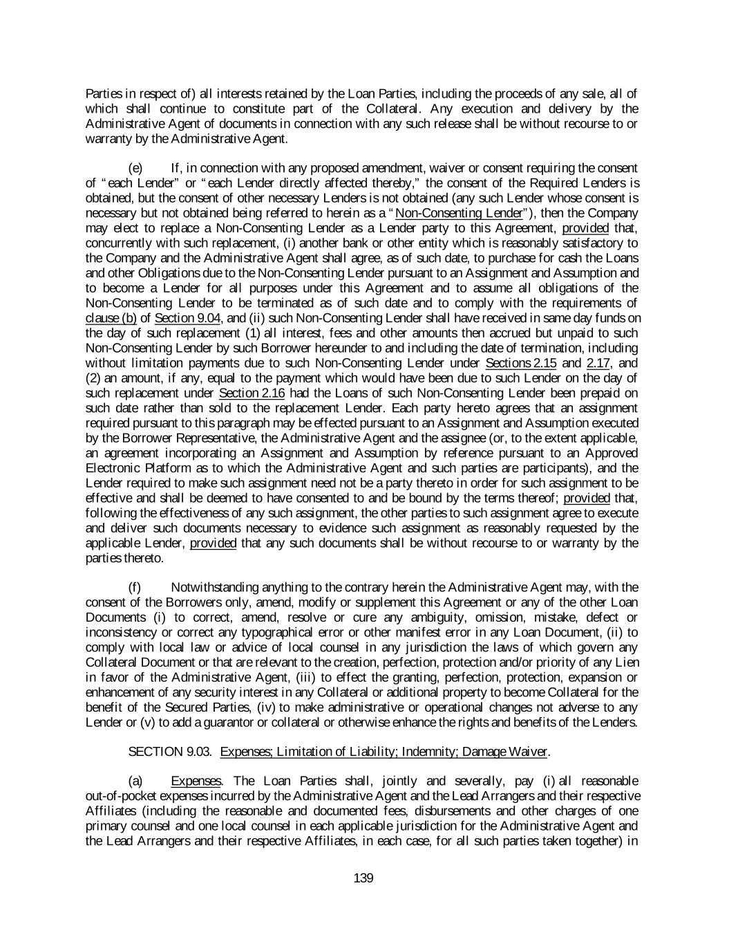 Parties in respect of) all interests retained by the Loan Parties, including the proceeds of any sale, all of which shall continue to constitute part of the Collateral. Any execution and delivery by the Administrative Agent of documents in connection with any such release shall be without recourse to or warranty by the Administrative Agent. (e) If, in connection with any proposed amendment, waiver or consent requiring the consent of “each Lender” or “each Lender directly affected thereby,” the consent of the Required Lenders is obtained, but the consent of other necessary Lenders is not obtained (any such Lender whose consent is necessary but not obtained being referred to herein as a “Non-Consenting Lender”), then the Company may elect to replace a Non-Consenting Lender as a Lender party to this Agreement, provided that, concurrently with such replacement, (i) another bank or other entity which is reasonably satisfactory to the Company and the Administrative Agent shall agree, as of such date, to purchase for cash the Loans and other Obligations due to the Non-Consenting Lender pursuant to an Assignment and Assumption and to become a Lender for all purposes under this Agreement and to assume all obligations of the Non-Consenting Lender to be terminated as of such date and to comply with the requirements of clause (b) of Section 9.04, and (ii) such Non-Consenting Lender shall have received in same day funds on the day of such replacement (1) all interest, fees and other amounts then accrued but unpaid to such Non-Consenting Lender by such Borrower hereunder to and including the date of termination, including without limitation payments due to such Non-Consenting Lender under Sections 2.15 and 2.17, and (2) an amount, if any, equal to the payment which would have been due to such Lender on the day of such replacement under Section 2.16 had the Loans of such Non-Consenting Lender been prepaid on such date rather than sold to the replacement Lender. Each party hereto agrees that an assignment required pursuant to this paragraph may be effected pursuant to an Assignment and Assumption executed by the Borrower Representative, the Administrative Agent and the assignee (or, to the extent applicable, an agreement incorporating an Assignment and Assumption by reference pursuant to an Approved Electronic Platform as to which the Administrative Agent and such parties are participants), and the Lender required to make such assignment need not be a party thereto in order for such assignment to be effective and shall be deemed to have consented to and be bound by the terms thereof; provided that, following the effectiveness of any such assignment, the other parties to such assignment agree to execute and deliver such documents necessary to evidence such assignment as reasonably requested by the applicable Lender, provided that any such documents shall be without recourse to or warranty by the parties thereto. (f) Notwithstanding anything to the contrary herein the Administrative Agent may, with the consent of the Borrowers only, amend, modify or supplement this Agreement or any of the other Loan Documents (i) to correct, amend, resolve or cure any ambiguity, omission, mistake, defect or inconsistency or correct any typographical error or other manifest error in any Loan Document, (ii) to comply with local law or advice of local counsel in any jurisdiction the laws of which govern any Collateral Document or that are relevant to the creation, perfection, protection and/or priority of any Lien in favor of the Administrative Agent, (iii) to effect the granting, perfection, protection, expansion or enhancement of any security interest in any Collateral or additional property to become Collateral for the benefit of the Secured Parties, (iv) to make administrative or operational changes not adverse to any Lender or (v) to add a guarantor or collateral or otherwise enhance the rights and benefits of the Lenders. SECTION 9.03. Expenses; Limitation of Liability; Indemnity; Damage Waiver. (a) Expenses. The Loan Parties shall, jointly and severally, pay (i) all reasonable out-of-pocket expenses incurred by the Administrative Agent and the Lead Arrangers and their respective Affiliates (including the reasonable and documented fees, disbursements and other charges of one primary counsel and one local counsel in each applicable jurisdiction for the Administrative Agent and the Lead Arrangers and their respective Affiliates, in each case, for all such parties taken together) in 139