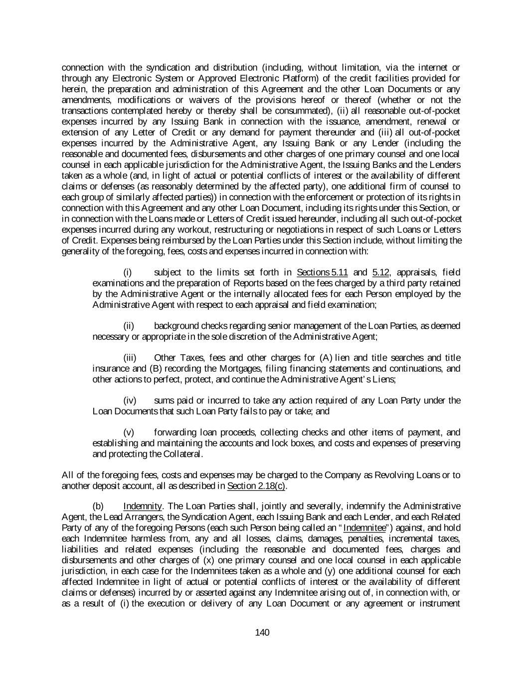 connection with the syndication and distribution (including, without limitation, via the internet or through any Electronic System or Approved Electronic Platform) of the credit facilities provided for herein, the preparation and administration of this Agreement and the other Loan Documents or any amendments, modifications or waivers of the provisions hereof or thereof (whether or not the transactions contemplated hereby or thereby shall be consummated), (ii) all reasonable out-of-pocket expenses incurred by any Issuing Bank in connection with the issuance, amendment, renewal or extension of any Letter of Credit or any demand for payment thereunder and (iii) all out-of-pocket expenses incurred by the Administrative Agent, any Issuing Bank or any Lender (including the reasonable and documented fees, disbursements and other charges of one primary counsel and one local counsel in each applicable jurisdiction for the Administrative Agent, the Issuing Banks and the Lenders taken as a whole (and, in light of actual or potential conflicts of interest or the availability of different claims or defenses (as reasonably determined by the affected party), one additional firm of counsel to each group of similarly affected parties)) in connection with the enforcement or protection of its rights in connection with this Agreement and any other Loan Document, including its rights under this Section, or in connection with the Loans made or Letters of Credit issued hereunder, including all such out-of-pocket expenses incurred during any workout, restructuring or negotiations in respect of such Loans or Letters of Credit. Expenses being reimbursed by the Loan Parties under this Section include, without limiting the generality of the foregoing, fees, costs and expenses incurred in connection with: (i) subject to the limits set forth in Sections 5.11 and 5.12, appraisals, field examinations and the preparation of Reports based on the fees charged by a third party retained by the Administrative Agent or the internally allocated fees for each Person employed by the Administrative Agent with respect to each appraisal and field examination; (ii) background checks regarding senior management of the Loan Parties, as deemed necessary or appropriate in the sole discretion of the Administrative Agent; (iii) Other Taxes, fees and other charges for (A) lien and title searches and title insurance and (B) recording the Mortgages, filing financing statements and continuations, and other actions to perfect, protect, and continue the Administrative Agent’s Liens; (iv) sums paid or incurred to take any action required of any Loan Party under the Loan Documents that such Loan Party fails to pay or take; and (v) forwarding loan proceeds, collecting checks and other items of payment, and establishing and maintaining the accounts and lock boxes, and costs and expenses of preserving and protecting the Collateral. All of the foregoing fees, costs and expenses may be charged to the Company as Revolving Loans or to another deposit account, all as described in Section 2.18(c). (b) Indemnity. The Loan Parties shall, jointly and severally, indemnify the Administrative Agent, the Lead Arrangers, the Syndication Agent, each Issuing Bank and each Lender, and each Related Party of any of the foregoing Persons (each such Person being called an “Indemnitee”) against, and hold each Indemnitee harmless from, any and all losses, claims, damages, penalties, incremental taxes, liabilities and related expenses (including the reasonable and documented fees, charges and disbursements and other charges of (x) one primary counsel and one local counsel in each applicable jurisdiction, in each case for the Indemnitees taken as a whole and (y) one additional counsel for each affected Indemnitee in light of actual or potential conflicts of interest or the availability of different claims or defenses) incurred by or asserted against any Indemnitee arising out of, in connection with, or as a result of (i) the execution or delivery of any Loan Document or any agreement or instrument 140