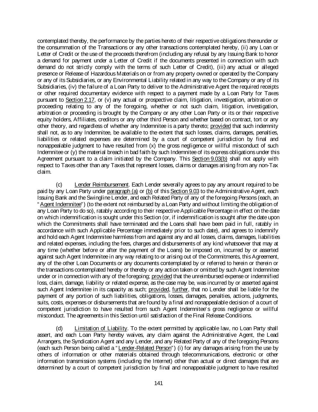 contemplated thereby, the performance by the parties hereto of their respective obligations thereunder or the consummation of the Transactions or any other transactions contemplated hereby, (ii) any Loan or Letter of Credit or the use of the proceeds therefrom (including any refusal by any Issuing Bank to honor a demand for payment under a Letter of Credit if the documents presented in connection with such demand do not strictly comply with the terms of such Letter of Credit), (iii) any actual or alleged presence or Release of Hazardous Materials on or from any property owned or operated by the Company or any of its Subsidiaries, or any Environmental Liability related in any way to the Company or any of its Subsidiaries, (iv) the failure of a Loan Party to deliver to the Administrative Agent the required receipts or other required documentary evidence with respect to a payment made by a Loan Party for Taxes pursuant to Section 2.17, or (v) any actual or prospective claim, litigation, investigation, arbitration or proceeding relating to any of the foregoing, whether or not such claim, litigation, investigation, arbitration or proceeding is brought by the Company or any other Loan Party or its or their respective equity holders, Affiliates, creditors or any other third Person and whether based on contract, tort or any other theory, and regardless of whether any Indemnitee is a party thereto; provided that such indemnity shall not, as to any Indemnitee, be available to the extent that such losses, claims, damages, penalties, liabilities or related expenses are determined by a court of competent jurisdiction by final and nonappealable judgment to have resulted from (x) the gross negligence or willful misconduct of such Indemnitee or (y) the material breach in bad faith by such Indemnitee of its express obligations under this Agreement pursuant to a claim initiated by the Company. This Section 9.03(b) shall not apply with respect to Taxes other than any Taxes that represent losses, claims or damages arising from any non-Tax claim. (c) Lender Reimbursement. Each Lender severally agrees to pay any amount required to be paid by any Loan Party under paragraph (a) or (b) of this Section 9.03 to the Administrative Agent, each Issuing Bank and the Swingline Lender, and each Related Party of any of the foregoing Persons (each, an “Agent Indemnitee”) (to the extent not reimbursed by a Loan Party and without limiting the obligation of any Loan Party to do so), ratably according to their respective Applicable Percentage in effect on the date on which indemnification is sought under this Section (or, if indemnification is sought after the date upon which the Commitments shall have terminated and the Loans shall have been paid in full, ratably in accordance with such Applicable Percentage immediately prior to such date), and agrees to indemnify and hold each Agent Indemnitee harmless from and against any and all losses, claims, damages, liabilities and related expenses, including the fees, charges and disbursements of any kind whatsoever that may at any time (whether before or after the payment of the Loans) be imposed on, incurred by or asserted against such Agent Indemnitee in any way relating to or arising out of the Commitments, this Agreement, any of the other Loan Documents or any documents contemplated by or referred to herein or therein or the transactions contemplated hereby or thereby or any action taken or omitted by such Agent Indemnitee under or in connection with any of the foregoing; provided that the unreimbursed expense or indemnified loss, claim, damage, liability or related expense, as the case may be, was incurred by or asserted against such Agent Indemnitee in its capacity as such; provided, further, that no Lender shall be liable for the payment of any portion of such liabilities, obligations, losses, damages, penalties, actions, judgments, suits, costs, expenses or disbursements that are found by a final and nonappealable decision of a court of competent jurisdiction to have resulted from such Agent Indemnitee’s gross negligence or willful misconduct. The agreements in this Section until satisfaction of the Final Release Conditions. (d) Limitation of Liability. To the extent permitted by applicable law, no Loan Party shall assert, and each Loan Party hereby waives, any claim against the Administrative Agent, the Lead Arrangers, the Syndication Agent and any Lender, and any Related Party of any of the foregoing Persons (each such Person being called a “Lender-Related Person”) (i) for any damages arising from the use by others of information or other materials obtained through telecommunications, electronic or other information transmission systems (including the Internet) other than actual or direct damages that are determined by a court of competent jurisdiction by final and nonappealable judgment to have resulted 141