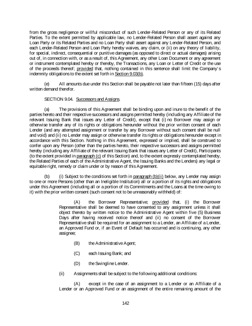 from the gross negligence or willful misconduct of such Lender-Related Person or any of its Related Parties. To the extent permitted by applicable law, no Lender-Related Person shall assert against any Loan Party or its Related Parties and no Loan Party shall assert against any Lender-Related Person, and each Lender-Related Person and Loan Party hereby waives, any claim, or (ii) on any theory of liability, for special, indirect, consequential or punitive damages (as opposed to direct or actual damages) arising out of, in connection with, or as a result of, this Agreement, any other Loan Document or any agreement or instrument contemplated hereby or thereby, the Transactions, any Loan or Letter of Credit or the use of the proceeds thereof; provided that, nothing contained in this sentence shall limit the Company’s indemnity obligations to the extent set forth in Section 9.03(b). (e) All amounts due under this Section shall be payable not later than fifteen (15) days after written demand therefor. SECTION 9.04. Successors and Assigns. (a) The provisions of this Agreement shall be binding upon and inure to the benefit of the parties hereto and their respective successors and assigns permitted hereby (including any Affiliate of the relevant Issuing Bank that issues any Letter of Credit), except that (i) no Borrower may assign or otherwise transfer any of its rights or obligations hereunder without the prior written consent of each Lender (and any attempted assignment or transfer by any Borrower without such consent shall be null and void) and (ii) no Lender may assign or otherwise transfer its rights or obligations hereunder except in accordance with this Section. Nothing in this Agreement, expressed or implied, shall be construed to confer upon any Person (other than the parties hereto, their respective successors and assigns permitted hereby (including any Affiliate of the relevant Issuing Bank that issues any Letter of Credit), Participants (to the extent provided in paragraph (c) of this Section) and, to the extent expressly contemplated hereby, the Related Parties of each of the Administrative Agent, the Issuing Banks and the Lenders) any legal or equitable right, remedy or claim under or by reason of this Agreement. (b) (i) Subject to the conditions set forth in paragraph (b)(ii) below, any Lender may assign to one or more Persons (other than an Ineligible Institution) all or a portion of its rights and obligations under this Agreement (including all or a portion of its Commitments and the Loans at the time owing to it) with the prior written consent (such consent not to be unreasonably withheld) of: (A) the Borrower Representative; provided that, (i) the Borrower Representative shall be deemed to have consented to any assignment unless it shall object thereto by written notice to the Administrative Agent within five (5) Business Days after having received notice thereof and (ii) no consent of the Borrower Representative shall be required for an assignment to a Lender, an Affiliate of a Lender, an Approved Fund or, if an Event of Default has occurred and is continuing, any other assignee; (B) the Administrative Agent; (C) each Issuing Bank; and (D) the Swingline Lender. (ii) Assignments shall be subject to the following additional conditions: (A) except in the case of an assignment to a Lender or an Affiliate of a Lender or an Approved Fund or an assignment of the entire remaining amount of the 142
