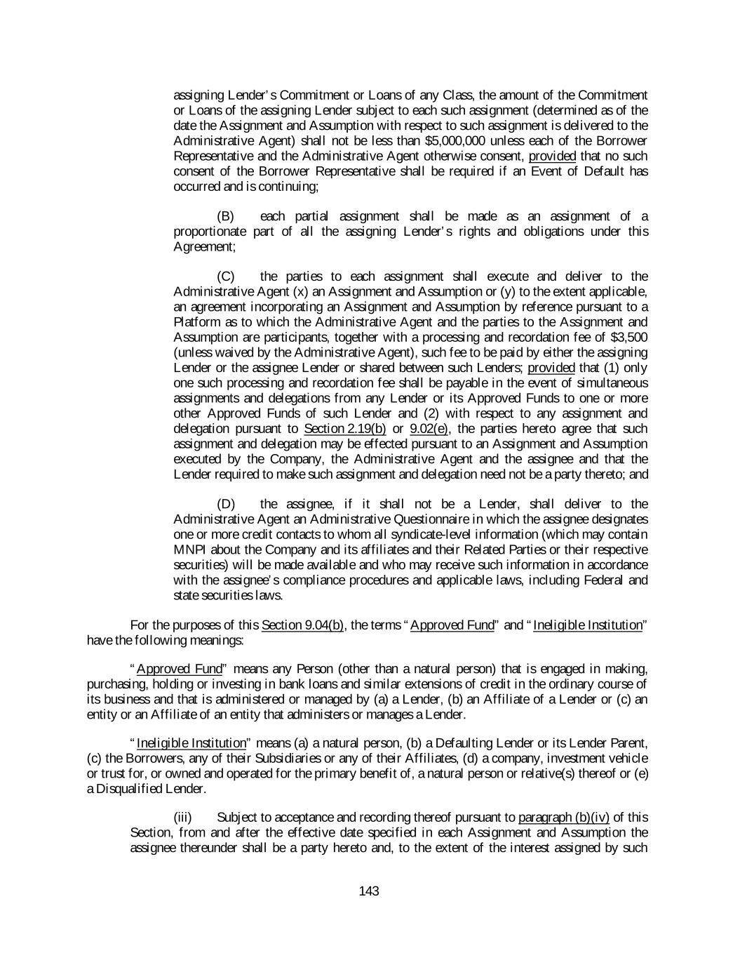 assigning Lender’s Commitment or Loans of any Class, the amount of the Commitment or Loans of the assigning Lender subject to each such assignment (determined as of the date the Assignment and Assumption with respect to such assignment is delivered to the Administrative Agent) shall not be less than $5,000,000 unless each of the Borrower Representative and the Administrative Agent otherwise consent, provided that no such consent of the Borrower Representative shall be required if an Event of Default has occurred and is continuing; (B) each partial assignment shall be made as an assignment of a proportionate part of all the assigning Lender’s rights and obligations under this Agreement; (C) the parties to each assignment shall execute and deliver to the Administrative Agent (x) an Assignment and Assumption or (y) to the extent applicable, an agreement incorporating an Assignment and Assumption by reference pursuant to a Platform as to which the Administrative Agent and the parties to the Assignment and Assumption are participants, together with a processing and recordation fee of $3,500 (unless waived by the Administrative Agent), such fee to be paid by either the assigning Lender or the assignee Lender or shared between such Lenders; provided that (1) only one such processing and recordation fee shall be payable in the event of simultaneous assignments and delegations from any Lender or its Approved Funds to one or more other Approved Funds of such Lender and (2) with respect to any assignment and delegation pursuant to Section 2.19(b) or 9.02(e), the parties hereto agree that such assignment and delegation may be effected pursuant to an Assignment and Assumption executed by the Company, the Administrative Agent and the assignee and that the Lender required to make such assignment and delegation need not be a party thereto; and (D) the assignee, if it shall not be a Lender, shall deliver to the Administrative Agent an Administrative Questionnaire in which the assignee designates one or more credit contacts to whom all syndicate-level information (which may contain MNPI about the Company and its affiliates and their Related Parties or their respective securities) will be made available and who may receive such information in accordance with the assignee’s compliance procedures and applicable laws, including Federal and state securities laws. For the purposes of this Section 9.04(b), the terms “Approved Fund” and “Ineligible Institution” have the following meanings: “Approved Fund” means any Person (other than a natural person) that is engaged in making, purchasing, holding or investing in bank loans and similar extensions of credit in the ordinary course of its business and that is administered or managed by (a) a Lender, (b) an Affiliate of a Lender or (c) an entity or an Affiliate of an entity that administers or manages a Lender. “Ineligible Institution” means (a) a natural person, (b) a Defaulting Lender or its Lender Parent, (c) the Borrowers, any of their Subsidiaries or any of their Affiliates, (d) a company, investment vehicle or trust for, or owned and operated for the primary benefit of, a natural person or relative(s) thereof or (e) a Disqualified Lender. (iii) Subject to acceptance and recording thereof pursuant to paragraph (b)(iv) of this Section, from and after the effective date specified in each Assignment and Assumption the assignee thereunder shall be a party hereto and, to the extent of the interest assigned by such 143