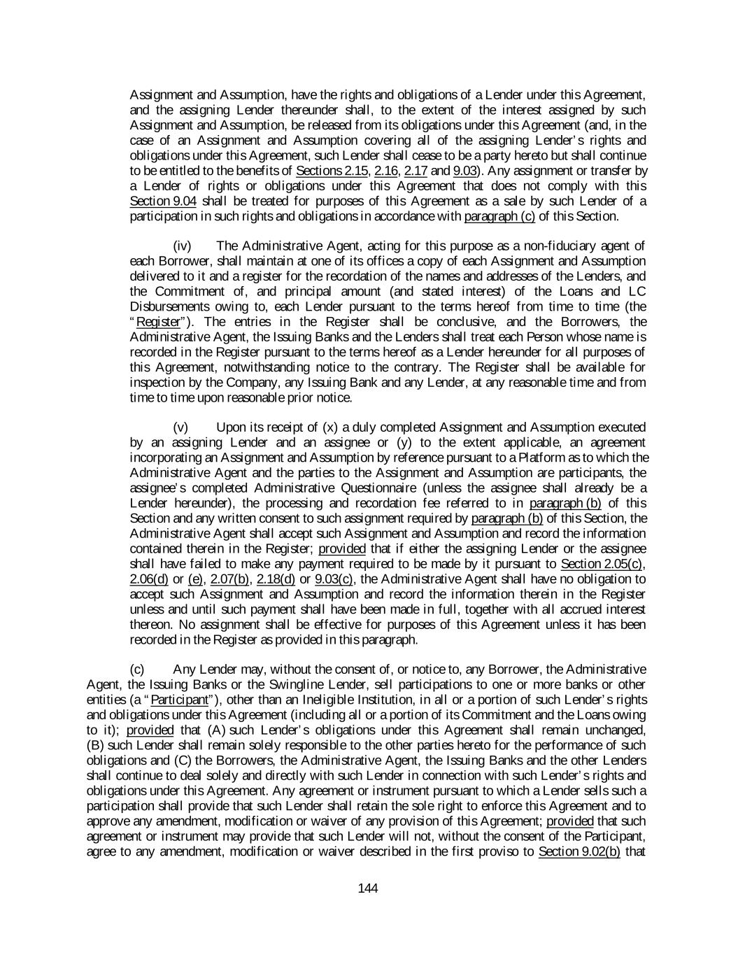 Assignment and Assumption, have the rights and obligations of a Lender under this Agreement, and the assigning Lender thereunder shall, to the extent of the interest assigned by such Assignment and Assumption, be released from its obligations under this Agreement (and, in the case of an Assignment and Assumption covering all of the assigning Lender’s rights and obligations under this Agreement, such Lender shall cease to be a party hereto but shall continue to be entitled to the benefits of Sections 2.15, 2.16, 2.17 and 9.03). Any assignment or transfer by a Lender of rights or obligations under this Agreement that does not comply with this Section 9.04 shall be treated for purposes of this Agreement as a sale by such Lender of a participation in such rights and obligations in accordance with paragraph (c) of this Section. (iv) The Administrative Agent, acting for this purpose as a non-fiduciary agent of each Borrower, shall maintain at one of its offices a copy of each Assignment and Assumption delivered to it and a register for the recordation of the names and addresses of the Lenders, and the Commitment of, and principal amount (and stated interest) of the Loans and LC Disbursements owing to, each Lender pursuant to the terms hereof from time to time (the “Register”). The entries in the Register shall be conclusive, and the Borrowers, the Administrative Agent, the Issuing Banks and the Lenders shall treat each Person whose name is recorded in the Register pursuant to the terms hereof as a Lender hereunder for all purposes of this Agreement, notwithstanding notice to the contrary. The Register shall be available for inspection by the Company, any Issuing Bank and any Lender, at any reasonable time and from time to time upon reasonable prior notice. (v) Upon its receipt of (x) a duly completed Assignment and Assumption executed by an assigning Lender and an assignee or (y) to the extent applicable, an agreement incorporating an Assignment and Assumption by reference pursuant to a Platform as to which the Administrative Agent and the parties to the Assignment and Assumption are participants, the assignee’s completed Administrative Questionnaire (unless the assignee shall already be a Lender hereunder), the processing and recordation fee referred to in paragraph (b) of this Section and any written consent to such assignment required by paragraph (b) of this Section, the Administrative Agent shall accept such Assignment and Assumption and record the information contained therein in the Register; provided that if either the assigning Lender or the assignee shall have failed to make any payment required to be made by it pursuant to Section 2.05(c), 2.06(d) or (e), 2.07(b), 2.18(d) or 9.03(c), the Administrative Agent shall have no obligation to accept such Assignment and Assumption and record the information therein in the Register unless and until such payment shall have been made in full, together with all accrued interest thereon. No assignment shall be effective for purposes of this Agreement unless it has been recorded in the Register as provided in this paragraph. (c) Any Lender may, without the consent of, or notice to, any Borrower, the Administrative Agent, the Issuing Banks or the Swingline Lender, sell participations to one or more banks or other entities (a “Participant”), other than an Ineligible Institution, in all or a portion of such Lender’s rights and obligations under this Agreement (including all or a portion of its Commitment and the Loans owing to it); provided that (A) such Lender’s obligations under this Agreement shall remain unchanged, (B) such Lender shall remain solely responsible to the other parties hereto for the performance of such obligations and (C) the Borrowers, the Administrative Agent, the Issuing Banks and the other Lenders shall continue to deal solely and directly with such Lender in connection with such Lender’s rights and obligations under this Agreement. Any agreement or instrument pursuant to which a Lender sells such a participation shall provide that such Lender shall retain the sole right to enforce this Agreement and to approve any amendment, modification or waiver of any provision of this Agreement; provided that such agreement or instrument may provide that such Lender will not, without the consent of the Participant, agree to any amendment, modification or waiver described in the first proviso to Section 9.02(b) that 144