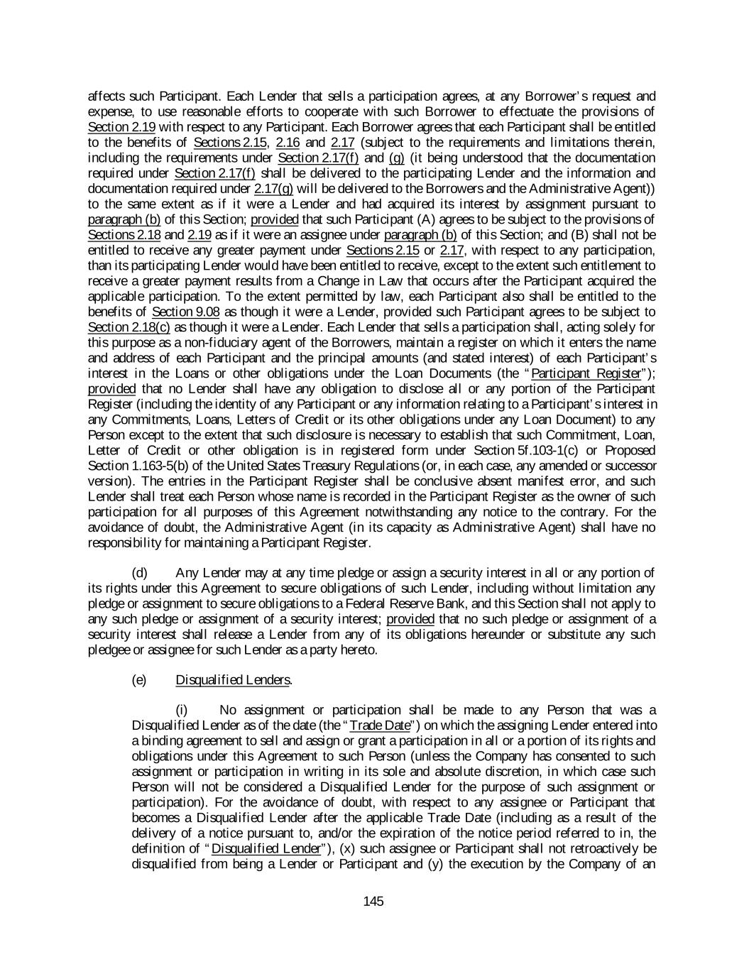 affects such Participant. Each Lender that sells a participation agrees, at any Borrower’s request and expense, to use reasonable efforts to cooperate with such Borrower to effectuate the provisions of Section 2.19 with respect to any Participant. Each Borrower agrees that each Participant shall be entitled to the benefits of Sections 2.15, 2.16 and 2.17 (subject to the requirements and limitations therein, including the requirements under Section 2.17(f) and (g) (it being understood that the documentation required under Section 2.17(f) shall be delivered to the participating Lender and the information and documentation required under 2.17(g) will be delivered to the Borrowers and the Administrative Agent)) to the same extent as if it were a Lender and had acquired its interest by assignment pursuant to paragraph (b) of this Section; provided that such Participant (A) agrees to be subject to the provisions of Sections 2.18 and 2.19 as if it were an assignee under paragraph (b) of this Section; and (B) shall not be entitled to receive any greater payment under Sections 2.15 or 2.17, with respect to any participation, than its participating Lender would have been entitled to receive, except to the extent such entitlement to receive a greater payment results from a Change in Law that occurs after the Participant acquired the applicable participation. To the extent permitted by law, each Participant also shall be entitled to the benefits of Section 9.08 as though it were a Lender, provided such Participant agrees to be subject to Section 2.18(c) as though it were a Lender. Each Lender that sells a participation shall, acting solely for this purpose as a non-fiduciary agent of the Borrowers, maintain a register on which it enters the name and address of each Participant and the principal amounts (and stated interest) of each Participant’s interest in the Loans or other obligations under the Loan Documents (the “Participant Register”); provided that no Lender shall have any obligation to disclose all or any portion of the Participant Register (including the identity of any Participant or any information relating to a Participant’s interest in any Commitments, Loans, Letters of Credit or its other obligations under any Loan Document) to any Person except to the extent that such disclosure is necessary to establish that such Commitment, Loan, Letter of Credit or other obligation is in registered form under Section 5f.103-1(c) or Proposed Section 1.163-5(b) of the United States Treasury Regulations (or, in each case, any amended or successor version). The entries in the Participant Register shall be conclusive absent manifest error, and such Lender shall treat each Person whose name is recorded in the Participant Register as the owner of such participation for all purposes of this Agreement notwithstanding any notice to the contrary. For the avoidance of doubt, the Administrative Agent (in its capacity as Administrative Agent) shall have no responsibility for maintaining a Participant Register. (d) Any Lender may at any time pledge or assign a security interest in all or any portion of its rights under this Agreement to secure obligations of such Lender, including without limitation any pledge or assignment to secure obligations to a Federal Reserve Bank, and this Section shall not apply to any such pledge or assignment of a security interest; provided that no such pledge or assignment of a security interest shall release a Lender from any of its obligations hereunder or substitute any such pledgee or assignee for such Lender as a party hereto. (e) Disqualified Lenders. (i) No assignment or participation shall be made to any Person that was a Disqualified Lender as of the date (the “Trade Date”) on which the assigning Lender entered into a binding agreement to sell and assign or grant a participation in all or a portion of its rights and obligations under this Agreement to such Person (unless the Company has consented to such assignment or participation in writing in its sole and absolute discretion, in which case such Person will not be considered a Disqualified Lender for the purpose of such assignment or participation). For the avoidance of doubt, with respect to any assignee or Participant that becomes a Disqualified Lender after the applicable Trade Date (including as a result of the delivery of a notice pursuant to, and/or the expiration of the notice period referred to in, the definition of “Disqualified Lender”), (x) such assignee or Participant shall not retroactively be disqualified from being a Lender or Participant and (y) the execution by the Company of an 145