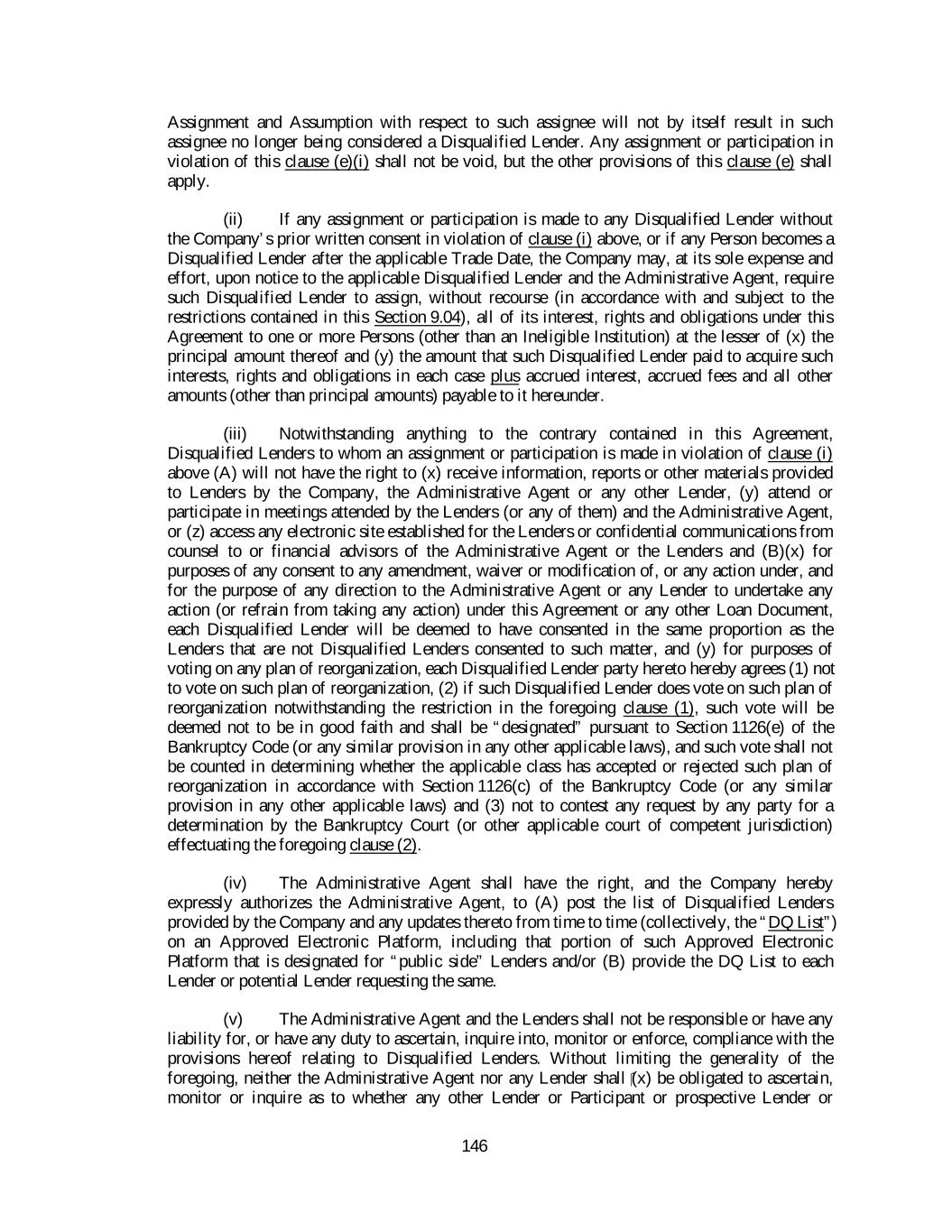 Assignment and Assumption with respect to such assignee will not by itself result in such assignee no longer being considered a Disqualified Lender. Any assignment or participation in violation of this clause (e)(i) shall not be void, but the other provisions of this clause (e) shall apply. (ii) If any assignment or participation is made to any Disqualified Lender without the Company’s prior written consent in violation of clause (i) above, or if any Person becomes a Disqualified Lender after the applicable Trade Date, the Company may, at its sole expense and effort, upon notice to the applicable Disqualified Lender and the Administrative Agent, require such Disqualified Lender to assign, without recourse (in accordance with and subject to the restrictions contained in this Section 9.04), all of its interest, rights and obligations under this Agreement to one or more Persons (other than an Ineligible Institution) at the lesser of (x) the principal amount thereof and (y) the amount that such Disqualified Lender paid to acquire such interests, rights and obligations in each case plus accrued interest, accrued fees and all other amounts (other than principal amounts) payable to it hereunder. (iii) Notwithstanding anything to the contrary contained in this Agreement, Disqualified Lenders to whom an assignment or participation is made in violation of clause (i) above (A) will not have the right to (x) receive information, reports or other materials provided to Lenders by the Company, the Administrative Agent or any other Lender, (y) attend or participate in meetings attended by the Lenders (or any of them) and the Administrative Agent, or (z) access any electronic site established for the Lenders or confidential communications from counsel to or financial advisors of the Administrative Agent or the Lenders and (B)(x) for purposes of any consent to any amendment, waiver or modification of, or any action under, and for the purpose of any direction to the Administrative Agent or any Lender to undertake any action (or refrain from taking any action) under this Agreement or any other Loan Document, each Disqualified Lender will be deemed to have consented in the same proportion as the Lenders that are not Disqualified Lenders consented to such matter, and (y) for purposes of voting on any plan of reorganization, each Disqualified Lender party hereto hereby agrees (1) not to vote on such plan of reorganization, (2) if such Disqualified Lender does vote on such plan of reorganization notwithstanding the restriction in the foregoing clause (1), such vote will be deemed not to be in good faith and shall be “designated” pursuant to Section 1126(e) of the Bankruptcy Code (or any similar provision in any other applicable laws), and such vote shall not be counted in determining whether the applicable class has accepted or rejected such plan of reorganization in accordance with Section 1126(c) of the Bankruptcy Code (or any similar provision in any other applicable laws) and (3) not to contest any request by any party for a determination by the Bankruptcy Court (or other applicable court of competent jurisdiction) effectuating the foregoing clause (2). (iv) The Administrative Agent shall have the right, and the Company hereby expressly authorizes the Administrative Agent, to (A) post the list of Disqualified Lenders provided by the Company and any updates thereto from time to time (collectively, the “DQ List”) on an Approved Electronic Platform, including that portion of such Approved Electronic Platform that is designated for “public side” Lenders and/or (B) provide the DQ List to each Lender or potential Lender requesting the same. (v) The Administrative Agent and the Lenders shall not be responsible or have any liability for, or have any duty to ascertain, inquire into, monitor or enforce, compliance with the provisions hereof relating to Disqualified Lenders. Without limiting the generality of the foregoing, neither the Administrative Agent nor any Lender shall (x) be obligated to ascertain, monitor or inquire as to whether any other Lender or Participant or prospective Lender or 146