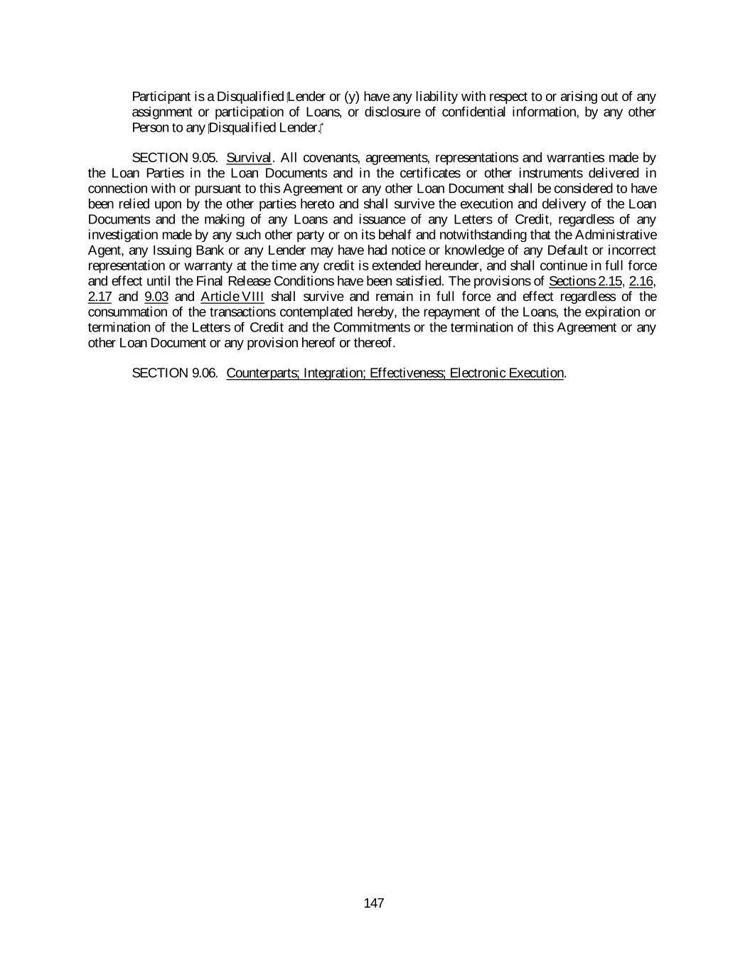 Participant is a Disqualified Lender or (y) have any liability with respect to or arising out of any assignment or participation of Loans, or disclosure of confidential information, by any other Person to any Disqualified Lender. SECTION 9.05. Survival. All covenants, agreements, representations and warranties made by the Loan Parties in the Loan Documents and in the certificates or other instruments delivered in connection with or pursuant to this Agreement or any other Loan Document shall be considered to have been relied upon by the other parties hereto and shall survive the execution and delivery of the Loan Documents and the making of any Loans and issuance of any Letters of Credit, regardless of any investigation made by any such other party or on its behalf and notwithstanding that the Administrative Agent, any Issuing Bank or any Lender may have had notice or knowledge of any Default or incorrect representation or warranty at the time any credit is extended hereunder, and shall continue in full force and effect until the Final Release Conditions have been satisfied. The provisions of Sections 2.15, 2.16, 2.17 and 9.03 and Article VIII shall survive and remain in full force and effect regardless of the consummation of the transactions contemplated hereby, the repayment of the Loans, the expiration or termination of the Letters of Credit and the Commitments or the termination of this Agreement or any other Loan Document or any provision hereof or thereof. SECTION 9.06. Counterparts; Integration; Effectiveness; Electronic Execution. 147