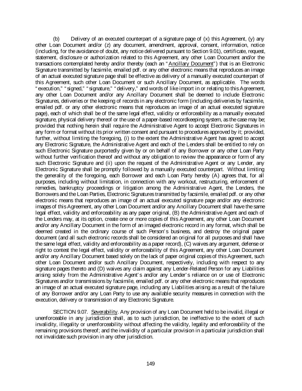 (b) Delivery of an executed counterpart of a signature page of (x) this Agreement, (y) any other Loan Document and/or (z) any document, amendment, approval, consent, information, notice (including, for the avoidance of doubt, any notice delivered pursuant to Section 9.01), certificate, request, statement, disclosure or authorization related to this Agreement, any other Loan Document and/or the transactions contemplated hereby and/or thereby (each an “Ancillary Document”) that is an Electronic Signature transmitted by facsimile, emailed pdf. or any other electronic means that reproduces an image of an actual executed signature page shall be effective as delivery of a manually executed counterpart of this Agreement, such other Loan Document or such Ancillary Document, as applicable. The words “execution,” “signed,” “signature,” “delivery,” and words of like import in or relating to this Agreement, any other Loan Document and/or any Ancillary Document shall be deemed to include Electronic Signatures, deliveries or the keeping of records in any electronic form (including deliveries by facsimile, emailed pdf. or any other electronic means that reproduces an image of an actual executed signature page), each of which shall be of the same legal effect, validity or enforceability as a manually executed signature, physical delivery thereof or the use of a paper-based recordkeeping system, as the case may be; provided that nothing herein shall require the Administrative Agent to accept Electronic Signatures in any form or format without its prior written consent and pursuant to procedures approved by it; provided, further, without limiting the foregoing, (i) to the extent the Administrative Agent has agreed to accept any Electronic Signature, the Administrative Agent and each of the Lenders shall be entitled to rely on such Electronic Signature purportedly given by or on behalf of any Borrower or any other Loan Party without further verification thereof and without any obligation to review the appearance or form of any such Electronic Signature and (ii) upon the request of the Administrative Agent or any Lender, any Electronic Signature shall be promptly followed by a manually executed counterpart. Without limiting the generality of the foregoing, each Borrower and each Loan Party hereby (A) agrees that, for all purposes, including without limitation, in connection with any workout, restructuring, enforcement of remedies, bankruptcy proceedings or litigation among the Administrative Agent, the Lenders, the Borrowers and the Loan Parties, Electronic Signatures transmitted by facsimile, emailed pdf. or any other electronic means that reproduces an image of an actual executed signature page and/or any electronic images of this Agreement, any other Loan Document and/or any Ancillary Document shall have the same legal effect, validity and enforceability as any paper original, (B) the Administrative Agent and each of the Lenders may, at its option, create one or more copies of this Agreement, any other Loan Document and/or any Ancillary Document in the form of an imaged electronic record in any format, which shall be deemed created in the ordinary course of such Person’s business, and destroy the original paper document (and all such electronic records shall be considered an original for all purposes and shall have the same legal effect, validity and enforceability as a paper record), (C) waives any argument, defense or right to contest the legal effect, validity or enforceability of this Agreement, any other Loan Document and/or any Ancillary Document based solely on the lack of paper original copies of this Agreement, such other Loan Document and/or such Ancillary Document, respectively, including with respect to any signature pages thereto and (D) waives any claim against any Lender-Related Person for any Liabilities arising solely from the Administrative Agent’s and/or any Lender’s reliance on or use of Electronic Signatures and/or transmissions by facsimile, emailed pdf. or any other electronic means that reproduces an image of an actual executed signature page, including any Liabilities arising as a result of the failure of any Borrower and/or any Loan Party to use any available security measures in connection with the execution, delivery or transmission of any Electronic Signature. SECTION 9.07. Severability. Any provision of any Loan Document held to be invalid, illegal or unenforceable in any jurisdiction shall, as to such jurisdiction, be ineffective to the extent of such invalidity, illegality or unenforceability without affecting the validity, legality and enforceability of the remaining provisions thereof; and the invalidity of a particular provision in a particular jurisdiction shall not invalidate such provision in any other jurisdiction. 149