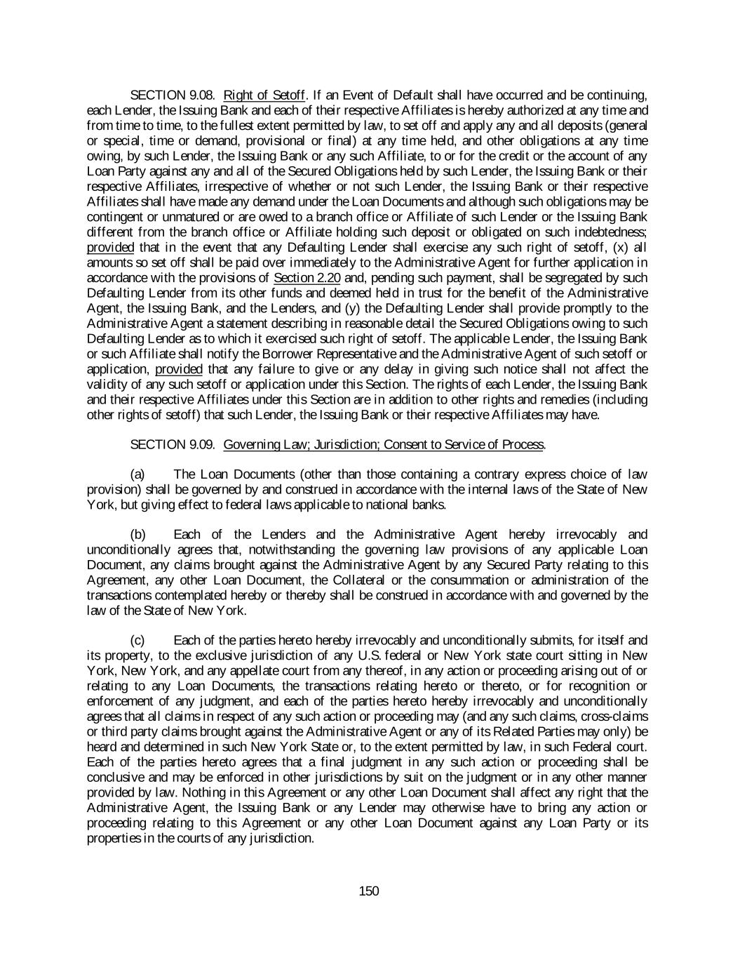 SECTION 9.08. Right of Setoff. If an Event of Default shall have occurred and be continuing, each Lender, the Issuing Bank and each of their respective Affiliates is hereby authorized at any time and from time to time, to the fullest extent permitted by law, to set off and apply any and all deposits (general or special, time or demand, provisional or final) at any time held, and other obligations at any time owing, by such Lender, the Issuing Bank or any such Affiliate, to or for the credit or the account of any Loan Party against any and all of the Secured Obligations held by such Lender, the Issuing Bank or their respective Affiliates, irrespective of whether or not such Lender, the Issuing Bank or their respective Affiliates shall have made any demand under the Loan Documents and although such obligations may be contingent or unmatured or are owed to a branch office or Affiliate of such Lender or the Issuing Bank different from the branch office or Affiliate holding such deposit or obligated on such indebtedness; provided that in the event that any Defaulting Lender shall exercise any such right of setoff, (x) all amounts so set off shall be paid over immediately to the Administrative Agent for further application in accordance with the provisions of Section 2.20 and, pending such payment, shall be segregated by such Defaulting Lender from its other funds and deemed held in trust for the benefit of the Administrative Agent, the Issuing Bank, and the Lenders, and (y) the Defaulting Lender shall provide promptly to the Administrative Agent a statement describing in reasonable detail the Secured Obligations owing to such Defaulting Lender as to which it exercised such right of setoff. The applicable Lender, the Issuing Bank or such Affiliate shall notify the Borrower Representative and the Administrative Agent of such setoff or application, provided that any failure to give or any delay in giving such notice shall not affect the validity of any such setoff or application under this Section. The rights of each Lender, the Issuing Bank and their respective Affiliates under this Section are in addition to other rights and remedies (including other rights of setoff) that such Lender, the Issuing Bank or their respective Affiliates may have. SECTION 9.09. Governing Law; Jurisdiction; Consent to Service of Process. (a) The Loan Documents (other than those containing a contrary express choice of law provision) shall be governed by and construed in accordance with the internal laws of the State of New York, but giving effect to federal laws applicable to national banks. (b) Each of the Lenders and the Administrative Agent hereby irrevocably and unconditionally agrees that, notwithstanding the governing law provisions of any applicable Loan Document, any claims brought against the Administrative Agent by any Secured Party relating to this Agreement, any other Loan Document, the Collateral or the consummation or administration of the transactions contemplated hereby or thereby shall be construed in accordance with and governed by the law of the State of New York. (c) Each of the parties hereto hereby irrevocably and unconditionally submits, for itself and its property, to the exclusive jurisdiction of any U.S. federal or New York state court sitting in New York, New York, and any appellate court from any thereof, in any action or proceeding arising out of or relating to any Loan Documents, the transactions relating hereto or thereto, or for recognition or enforcement of any judgment, and each of the parties hereto hereby irrevocably and unconditionally agrees that all claims in respect of any such action or proceeding may (and any such claims, cross-claims or third party claims brought against the Administrative Agent or any of its Related Parties may only) be heard and determined in such New York State or, to the extent permitted by law, in such Federal court. Each of the parties hereto agrees that a final judgment in any such action or proceeding shall be conclusive and may be enforced in other jurisdictions by suit on the judgment or in any other manner provided by law. Nothing in this Agreement or any other Loan Document shall affect any right that the Administrative Agent, the Issuing Bank or any Lender may otherwise have to bring any action or proceeding relating to this Agreement or any other Loan Document against any Loan Party or its properties in the courts of any jurisdiction. 150