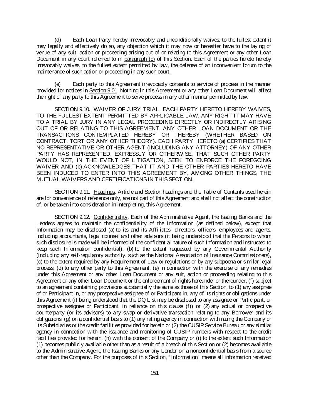 (d) Each Loan Party hereby irrevocably and unconditionally waives, to the fullest extent it may legally and effectively do so, any objection which it may now or hereafter have to the laying of venue of any suit, action or proceeding arising out of or relating to this Agreement or any other Loan Document in any court referred to in paragraph (c) of this Section. Each of the parties hereto hereby irrevocably waives, to the fullest extent permitted by law, the defense of an inconvenient forum to the maintenance of such action or proceeding in any such court. (e) Each party to this Agreement irrevocably consents to service of process in the manner provided for notices in Section 9.01. Nothing in this Agreement or any other Loan Document will affect the right of any party to this Agreement to serve process in any other manner permitted by law. SECTION 9.10. WAIVER OF JURY TRIAL. EACH PARTY HERETO HEREBY WAIVES, TO THE FULLEST EXTENT PERMITTED BY APPLICABLE LAW, ANY RIGHT IT MAY HAVE TO A TRIAL BY JURY IN ANY LEGAL PROCEEDING DIRECTLY OR INDIRECTLY ARISING OUT OF OR RELATING TO THIS AGREEMENT, ANY OTHER LOAN DOCUMENT OR THE TRANSACTIONS CONTEMPLATED HEREBY OR THEREBY (WHETHER BASED ON CONTRACT, TORT OR ANY OTHER THEORY). EACH PARTY HERETO (a) CERTIFIES THAT NO REPRESENTATIVE OR OTHER AGENT (INCLUDING ANY ATTORNEY) OF ANY OTHER PARTY HAS REPRESENTED, EXPRESSLY OR OTHERWISE, THAT SUCH OTHER PARTY WOULD NOT, IN THE EVENT OF LITIGATION, SEEK TO ENFORCE THE FOREGOING WAIVER AND (b) ACKNOWLEDGES THAT IT AND THE OTHER PARTIES HERETO HAVE BEEN INDUCED TO ENTER INTO THIS AGREEMENT BY, AMONG OTHER THINGS, THE MUTUAL WAIVERS AND CERTIFICATIONS IN THIS SECTION. SECTION 9.11. Headings. Article and Section headings and the Table of Contents used herein are for convenience of reference only, are not part of this Agreement and shall not affect the construction of, or be taken into consideration in interpreting, this Agreement. SECTION 9.12. Confidentiality. Each of the Administrative Agent, the Issuing Banks and the Lenders agrees to maintain the confidentiality of the Information (as defined below), except that Information may be disclosed (a) to its and its Affiliates’ directors, officers, employees and agents, including accountants, legal counsel and other advisors (it being understood that the Persons to whom such disclosure is made will be informed of the confidential nature of such Information and instructed to keep such Information confidential), (b) to the extent requested by any Governmental Authority (including any self-regulatory authority, such as the National Association of Insurance Commissioners), (c) to the extent required by any Requirement of Law or regulations or by any subpoena or similar legal process, (d) to any other party to this Agreement, (e) in connection with the exercise of any remedies under this Agreement or any other Loan Document or any suit, action or proceeding relating to this Agreement or any other Loan Document or the enforcement of rights hereunder or thereunder, (f) subject to an agreement containing provisions substantially the same as those of this Section, to (1) any assignee of or Participant in, or any prospective assignee of or Participant in, any of its rights or obligations under this Agreement (it being understood that the DQ List may be disclosed to any assignee or Participant, or prospective assignee or Participant, in reliance on this clause (f)) or (2) any actual or prospective counterparty (or its advisors) to any swap or derivative transaction relating to any Borrower and its obligations, (g) on a confidential basis to (1) any rating agency in connection with rating the Company or its Subsidiaries or the credit facilities provided for herein or (2) the CUSIP Service Bureau or any similar agency in connection with the issuance and monitoring of CUSIP numbers with respect to the credit facilities provided for herein, (h) with the consent of the Company or (i) to the extent such Information (1) becomes publicly available other than as a result of a breach of this Section or (2) becomes available to the Administrative Agent, the Issuing Banks or any Lender on a nonconfidential basis from a source other than the Company. For the purposes of this Section, “Information” means all information received 151