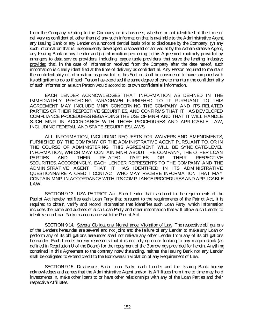 from the Company relating to the Company or its business, whether or not identified at the time of delivery as confidential, other than (x) any such information that is available to the Administrative Agent, any Issuing Bank or any Lender on a nonconfidential basis prior to disclosure by the Company, (y) any such information that is independently developed, discovered or arrived at by the Administrative Agent, any Issuing Bank or any Lender and (z) information pertaining to this Agreement routinely provided by arrangers to data service providers, including league table providers, that serve the lending industry; provided that, in the case of information received from the Company after the date hereof, such information is clearly identified at the time of delivery as confidential. Any Person required to maintain the confidentiality of Information as provided in this Section shall be considered to have complied with its obligation to do so if such Person has exercised the same degree of care to maintain the confidentiality of such Information as such Person would accord to its own confidential information. EACH LENDER ACKNOWLEDGES THAT INFORMATION AS DEFINED IN THE IMMEDIATELY PRECEDING PARAGRAPH FURNISHED TO IT PURSUANT TO THIS AGREEMENT MAY INCLUDE MNPI CONCERNING THE COMPANY AND ITS RELATED PARTIES OR THEIR RESPECTIVE SECURITIES, AND CONFIRMS THAT IT HAS DEVELOPED COMPLIANCE PROCEDURES REGARDING THE USE OF MNPI AND THAT IT WILL HANDLE SUCH MNPI IN ACCORDANCE WITH THOSE PROCEDURES AND APPLICABLE LAW, INCLUDING FEDERAL AND STATE SECURITIES LAWS. ALL INFORMATION, INCLUDING REQUESTS FOR WAIVERS AND AMENDMENTS, FURNISHED BY THE COMPANY OR THE ADMINISTRATIVE AGENT PURSUANT TO, OR IN THE COURSE OF ADMINISTERING, THIS AGREEMENT WILL BE SYNDICATE-LEVEL INFORMATION, WHICH MAY CONTAIN MNPI ABOUT THE COMPANY, THE OTHER LOAN PARTIES AND THEIR RELATED PARTIES OR THEIR RESPECTIVE SECURITIES. ACCORDINGLY, EACH LENDER REPRESENTS TO THE COMPANY AND THE ADMINISTRATIVE AGENT THAT IT HAS IDENTIFIED IN ITS ADMINISTRATIVE QUESTIONNAIRE A CREDIT CONTACT WHO MAY RECEIVE INFORMATION THAT MAY CONTAIN MNPI IN ACCORDANCE WITH ITS COMPLIANCE PROCEDURES AND APPLICABLE LAW. SECTION 9.13. USA PATRIOT Act. Each Lender that is subject to the requirements of the Patriot Act hereby notifies each Loan Party that pursuant to the requirements of the Patriot Act, it is required to obtain, verify and record information that identifies such Loan Party, which information includes the name and address of such Loan Party and other information that will allow such Lender to identify such Loan Party in accordance with the Patriot Act. SECTION 9.14. Several Obligations; Nonreliance; Violation of Law. The respective obligations of the Lenders hereunder are several and not joint and the failure of any Lender to make any Loan or perform any of its obligations hereunder shall not relieve any other Lender from any of its obligations hereunder. Each Lender hereby represents that it is not relying on or looking to any margin stock (as defined in Regulation U of the Board) for the repayment of the Borrowings provided for herein. Anything contained in this Agreement to the contrary notwithstanding, neither the Issuing Bank nor any Lender shall be obligated to extend credit to the Borrowers in violation of any Requirement of Law. SECTION 9.15. Disclosure. Each Loan Party, each Lender and the Issuing Bank hereby acknowledges and agrees that the Administrative Agent and/or its Affiliates from time to time may hold investments in, make other loans to or have other relationships with any of the Loan Parties and their respective Affiliates. 152