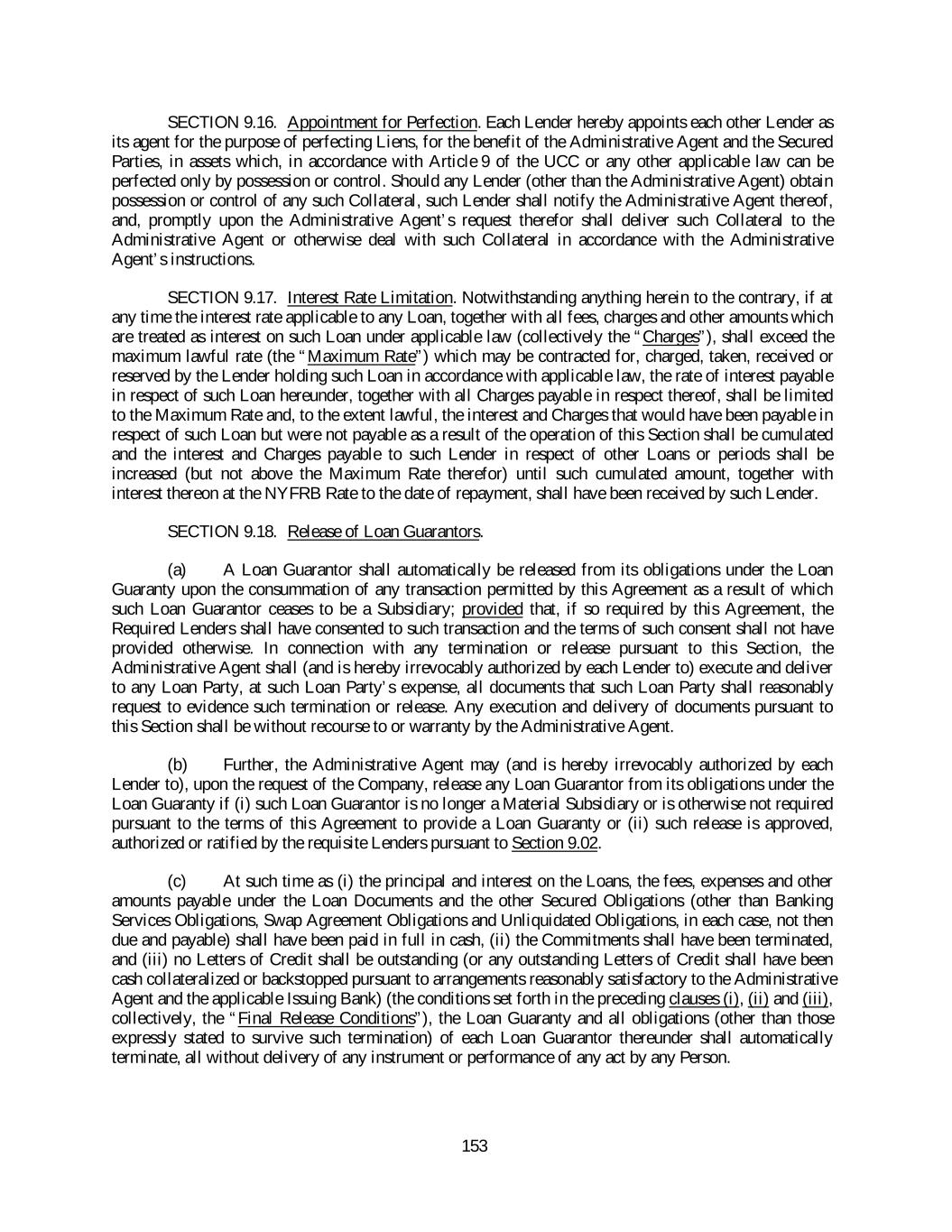 SECTION 9.16. Appointment for Perfection. Each Lender hereby appoints each other Lender as its agent for the purpose of perfecting Liens, for the benefit of the Administrative Agent and the Secured Parties, in assets which, in accordance with Article 9 of the UCC or any other applicable law can be perfected only by possession or control. Should any Lender (other than the Administrative Agent) obtain possession or control of any such Collateral, such Lender shall notify the Administrative Agent thereof, and, promptly upon the Administrative Agent’s request therefor shall deliver such Collateral to the Administrative Agent or otherwise deal with such Collateral in accordance with the Administrative Agent’s instructions. SECTION 9.17. Interest Rate Limitation. Notwithstanding anything herein to the contrary, if at any time the interest rate applicable to any Loan, together with all fees, charges and other amounts which are treated as interest on such Loan under applicable law (collectively the “Charges”), shall exceed the maximum lawful rate (the “Maximum Rate”) which may be contracted for, charged, taken, received or reserved by the Lender holding such Loan in accordance with applicable law, the rate of interest payable in respect of such Loan hereunder, together with all Charges payable in respect thereof, shall be limited to the Maximum Rate and, to the extent lawful, the interest and Charges that would have been payable in respect of such Loan but were not payable as a result of the operation of this Section shall be cumulated and the interest and Charges payable to such Lender in respect of other Loans or periods shall be increased (but not above the Maximum Rate therefor) until such cumulated amount, together with interest thereon at the NYFRB Rate to the date of repayment, shall have been received by such Lender. SECTION 9.18. Release of Loan Guarantors. (a) A Loan Guarantor shall automatically be released from its obligations under the Loan Guaranty upon the consummation of any transaction permitted by this Agreement as a result of which such Loan Guarantor ceases to be a Subsidiary; provided that, if so required by this Agreement, the Required Lenders shall have consented to such transaction and the terms of such consent shall not have provided otherwise. In connection with any termination or release pursuant to this Section, the Administrative Agent shall (and is hereby irrevocably authorized by each Lender to) execute and deliver to any Loan Party, at such Loan Party’s expense, all documents that such Loan Party shall reasonably request to evidence such termination or release. Any execution and delivery of documents pursuant to this Section shall be without recourse to or warranty by the Administrative Agent. (b) Further, the Administrative Agent may (and is hereby irrevocably authorized by each Lender to), upon the request of the Company, release any Loan Guarantor from its obligations under the Loan Guaranty if (i) such Loan Guarantor is no longer a Material Subsidiary or is otherwise not required pursuant to the terms of this Agreement to provide a Loan Guaranty or (ii) such release is approved, authorized or ratified by the requisite Lenders pursuant to Section 9.02. (c) At such time as (i) the principal and interest on the Loans, the fees, expenses and other amounts payable under the Loan Documents and the other Secured Obligations (other than Banking Services Obligations, Swap Agreement Obligations and Unliquidated Obligations, in each case, not then due and payable) shall have been paid in full in cash, (ii) the Commitments shall have been terminated, and (iii) no Letters of Credit shall be outstanding (or any outstanding Letters of Credit shall have been cash collateralized or backstopped pursuant to arrangements reasonably satisfactory to the Administrative Agent and the applicable Issuing Bank) (the conditions set forth in the preceding clauses (i), (ii) and (iii), collectively, the “Final Release Conditions”), the Loan Guaranty and all obligations (other than those expressly stated to survive such termination) of each Loan Guarantor thereunder shall automatically terminate, all without delivery of any instrument or performance of any act by any Person. 153