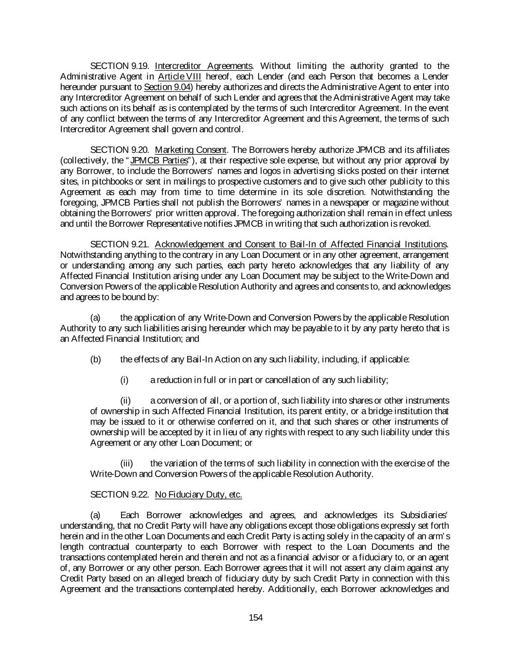 SECTION 9.19. Intercreditor Agreements. Without limiting the authority granted to the Administrative Agent in Article VIII hereof, each Lender (and each Person that becomes a Lender hereunder pursuant to Section 9.04) hereby authorizes and directs the Administrative Agent to enter into any Intercreditor Agreement on behalf of such Lender and agrees that the Administrative Agent may take such actions on its behalf as is contemplated by the terms of such Intercreditor Agreement. In the event of any conflict between the terms of any Intercreditor Agreement and this Agreement, the terms of such Intercreditor Agreement shall govern and control. SECTION 9.20. Marketing Consent. The Borrowers hereby authorize JPMCB and its affiliates (collectively, the “JPMCB Parties”), at their respective sole expense, but without any prior approval by any Borrower, to include the Borrowers’ names and logos in advertising slicks posted on their internet sites, in pitchbooks or sent in mailings to prospective customers and to give such other publicity to this Agreement as each may from time to time determine in its sole discretion. Notwithstanding the foregoing, JPMCB Parties shall not publish the Borrowers’ names in a newspaper or magazine without obtaining the Borrowers’ prior written approval. The foregoing authorization shall remain in effect unless and until the Borrower Representative notifies JPMCB in writing that such authorization is revoked. SECTION 9.21. Acknowledgement and Consent to Bail-In of Affected Financial Institutions. Notwithstanding anything to the contrary in any Loan Document or in any other agreement, arrangement or understanding among any such parties, each party hereto acknowledges that any liability of any Affected Financial Institution arising under any Loan Document may be subject to the Write-Down and Conversion Powers of the applicable Resolution Authority and agrees and consents to, and acknowledges and agrees to be bound by: (a) the application of any Write-Down and Conversion Powers by the applicable Resolution Authority to any such liabilities arising hereunder which may be payable to it by any party hereto that is an Affected Financial Institution; and (b) the effects of any Bail-In Action on any such liability, including, if applicable: (i) a reduction in full or in part or cancellation of any such liability; (ii) a conversion of all, or a portion of, such liability into shares or other instruments of ownership in such Affected Financial Institution, its parent entity, or a bridge institution that may be issued to it or otherwise conferred on it, and that such shares or other instruments of ownership will be accepted by it in lieu of any rights with respect to any such liability under this Agreement or any other Loan Document; or (iii) the variation of the terms of such liability in connection with the exercise of the Write-Down and Conversion Powers of the applicable Resolution Authority. SECTION 9.22. No Fiduciary Duty, etc. (a) Each Borrower acknowledges and agrees, and acknowledges its Subsidiaries’ understanding, that no Credit Party will have any obligations except those obligations expressly set forth herein and in the other Loan Documents and each Credit Party is acting solely in the capacity of an arm’s length contractual counterparty to each Borrower with respect to the Loan Documents and the transactions contemplated herein and therein and not as a financial advisor or a fiduciary to, or an agent of, any Borrower or any other person. Each Borrower agrees that it will not assert any claim against any Credit Party based on an alleged breach of fiduciary duty by such Credit Party in connection with this Agreement and the transactions contemplated hereby. Additionally, each Borrower acknowledges and 154