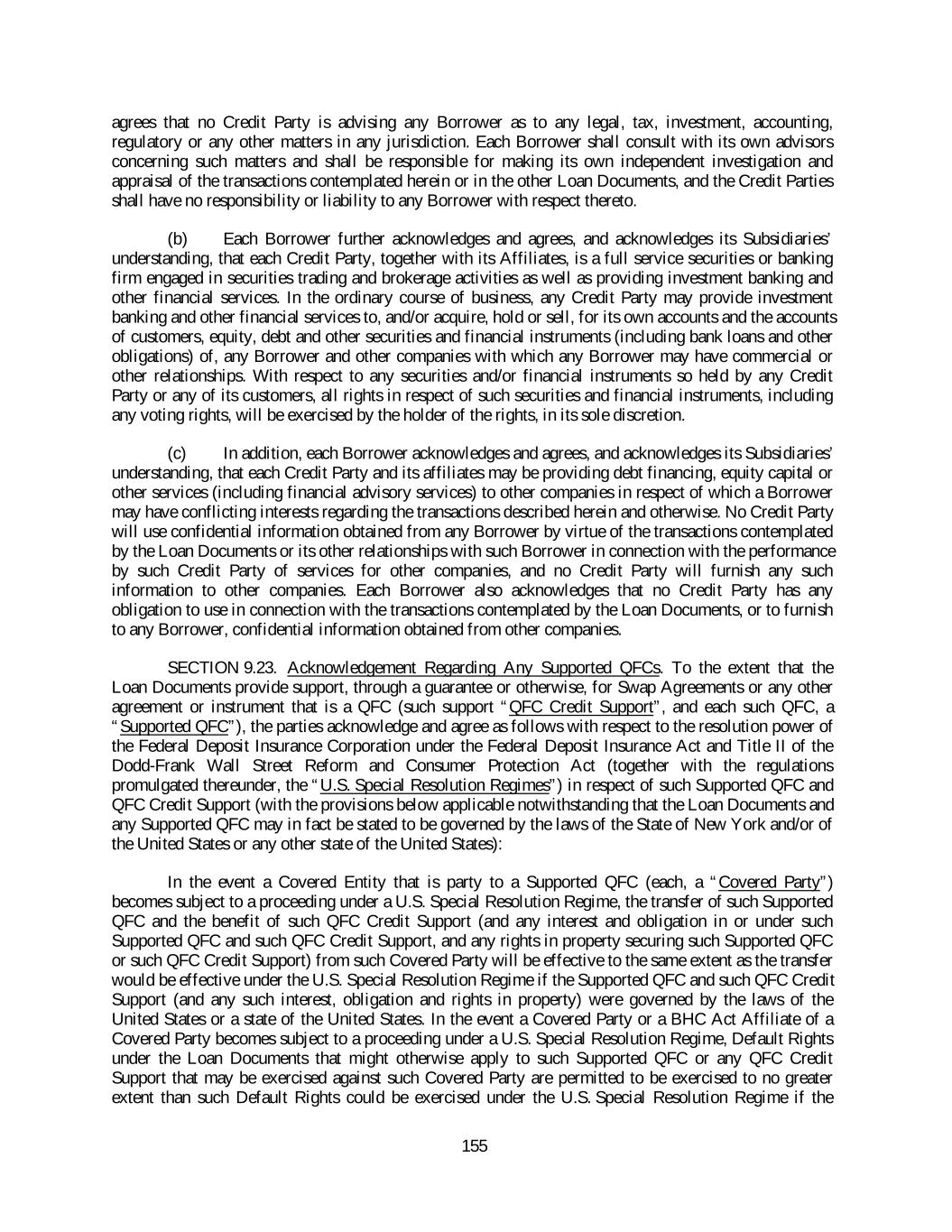 agrees that no Credit Party is advising any Borrower as to any legal, tax, investment, accounting, regulatory or any other matters in any jurisdiction. Each Borrower shall consult with its own advisors concerning such matters and shall be responsible for making its own independent investigation and appraisal of the transactions contemplated herein or in the other Loan Documents, and the Credit Parties shall have no responsibility or liability to any Borrower with respect thereto. (b) Each Borrower further acknowledges and agrees, and acknowledges its Subsidiaries’ understanding, that each Credit Party, together with its Affiliates, is a full service securities or banking firm engaged in securities trading and brokerage activities as well as providing investment banking and other financial services. In the ordinary course of business, any Credit Party may provide investment banking and other financial services to, and/or acquire, hold or sell, for its own accounts and the accounts of customers, equity, debt and other securities and financial instruments (including bank loans and other obligations) of, any Borrower and other companies with which any Borrower may have commercial or other relationships. With respect to any securities and/or financial instruments so held by any Credit Party or any of its customers, all rights in respect of such securities and financial instruments, including any voting rights, will be exercised by the holder of the rights, in its sole discretion. (c) In addition, each Borrower acknowledges and agrees, and acknowledges its Subsidiaries’ understanding, that each Credit Party and its affiliates may be providing debt financing, equity capital or other services (including financial advisory services) to other companies in respect of which a Borrower may have conflicting interests regarding the transactions described herein and otherwise. No Credit Party will use confidential information obtained from any Borrower by virtue of the transactions contemplated by the Loan Documents or its other relationships with such Borrower in connection with the performance by such Credit Party of services for other companies, and no Credit Party will furnish any such information to other companies. Each Borrower also acknowledges that no Credit Party has any obligation to use in connection with the transactions contemplated by the Loan Documents, or to furnish to any Borrower, confidential information obtained from other companies. SECTION 9.23. Acknowledgement Regarding Any Supported QFCs. To the extent that the Loan Documents provide support, through a guarantee or otherwise, for Swap Agreements or any other agreement or instrument that is a QFC (such support “QFC Credit Support”, and each such QFC, a “Supported QFC”), the parties acknowledge and agree as follows with respect to the resolution power of the Federal Deposit Insurance Corporation under the Federal Deposit Insurance Act and Title II of the Dodd-Frank Wall Street Reform and Consumer Protection Act (together with the regulations promulgated thereunder, the “U.S. Special Resolution Regimes”) in respect of such Supported QFC and QFC Credit Support (with the provisions below applicable notwithstanding that the Loan Documents and any Supported QFC may in fact be stated to be governed by the laws of the State of New York and/or of the United States or any other state of the United States): In the event a Covered Entity that is party to a Supported QFC (each, a “Covered Party”) becomes subject to a proceeding under a U.S. Special Resolution Regime, the transfer of such Supported QFC and the benefit of such QFC Credit Support (and any interest and obligation in or under such Supported QFC and such QFC Credit Support, and any rights in property securing such Supported QFC or such QFC Credit Support) from such Covered Party will be effective to the same extent as the transfer would be effective under the U.S. Special Resolution Regime if the Supported QFC and such QFC Credit Support (and any such interest, obligation and rights in property) were governed by the laws of the United States or a state of the United States. In the event a Covered Party or a BHC Act Affiliate of a Covered Party becomes subject to a proceeding under a U.S. Special Resolution Regime, Default Rights under the Loan Documents that might otherwise apply to such Supported QFC or any QFC Credit Support that may be exercised against such Covered Party are permitted to be exercised to no greater extent than such Default Rights could be exercised under the U.S. Special Resolution Regime if the 155