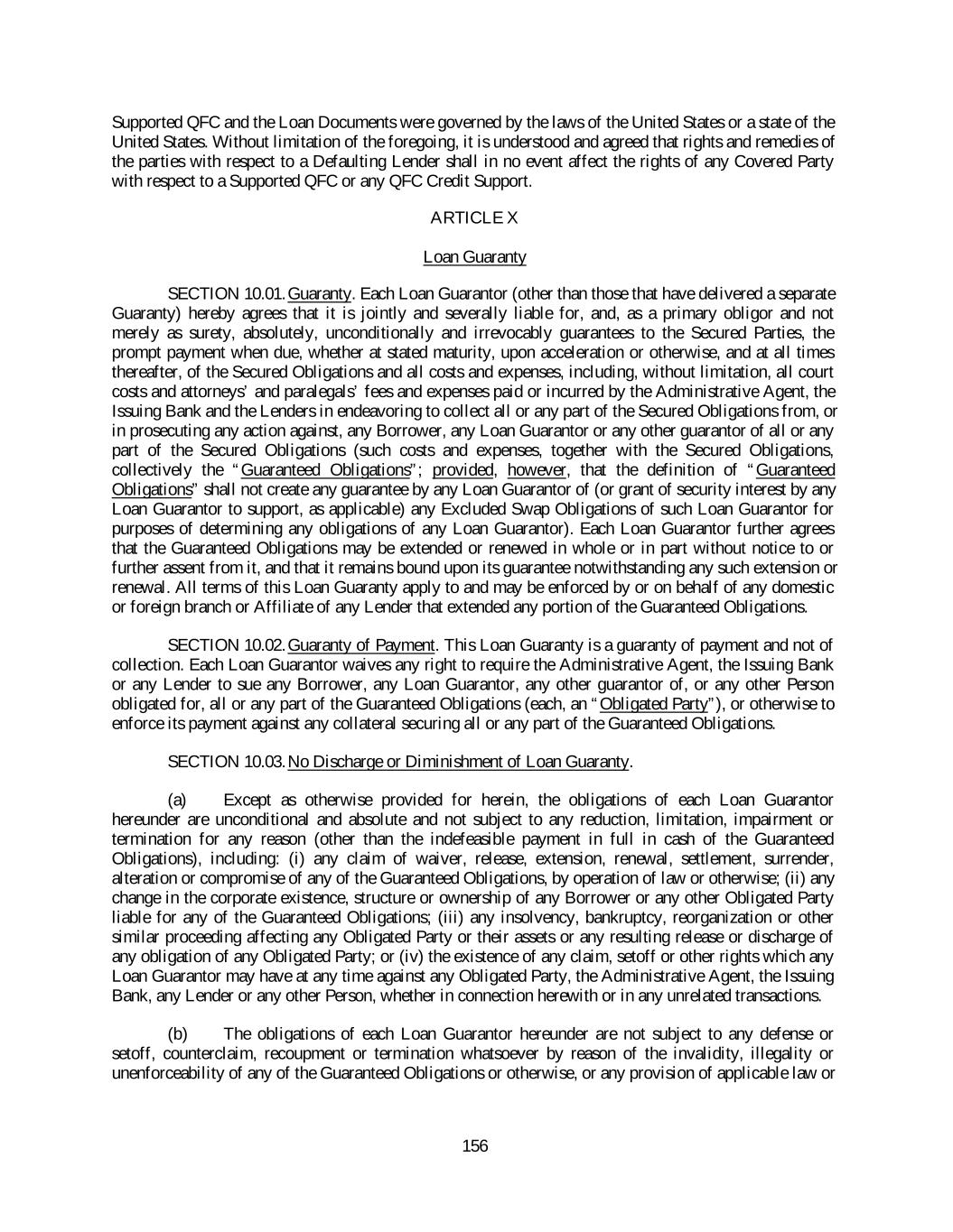 Supported QFC and the Loan Documents were governed by the laws of the United States or a state of the United States. Without limitation of the foregoing, it is understood and agreed that rights and remedies of the parties with respect to a Defaulting Lender shall in no event affect the rights of any Covered Party with respect to a Supported QFC or any QFC Credit Support. ARTICLE X Loan Guaranty SECTION 10.01.Guaranty. Each Loan Guarantor (other than those that have delivered a separate Guaranty) hereby agrees that it is jointly and severally liable for, and, as a primary obligor and not merely as surety, absolutely, unconditionally and irrevocably guarantees to the Secured Parties, the prompt payment when due, whether at stated maturity, upon acceleration or otherwise, and at all times thereafter, of the Secured Obligations and all costs and expenses, including, without limitation, all court costs and attorneys’ and paralegals’ fees and expenses paid or incurred by the Administrative Agent, the Issuing Bank and the Lenders in endeavoring to collect all or any part of the Secured Obligations from, or in prosecuting any action against, any Borrower, any Loan Guarantor or any other guarantor of all or any part of the Secured Obligations (such costs and expenses, together with the Secured Obligations, collectively the “Guaranteed Obligations”; provided, however, that the definition of “Guaranteed Obligations” shall not create any guarantee by any Loan Guarantor of (or grant of security interest by any Loan Guarantor to support, as applicable) any Excluded Swap Obligations of such Loan Guarantor for purposes of determining any obligations of any Loan Guarantor). Each Loan Guarantor further agrees that the Guaranteed Obligations may be extended or renewed in whole or in part without notice to or further assent from it, and that it remains bound upon its guarantee notwithstanding any such extension or renewal. All terms of this Loan Guaranty apply to and may be enforced by or on behalf of any domestic or foreign branch or Affiliate of any Lender that extended any portion of the Guaranteed Obligations. SECTION 10.02.Guaranty of Payment. This Loan Guaranty is a guaranty of payment and not of collection. Each Loan Guarantor waives any right to require the Administrative Agent, the Issuing Bank or any Lender to sue any Borrower, any Loan Guarantor, any other guarantor of, or any other Person obligated for, all or any part of the Guaranteed Obligations (each, an “Obligated Party”), or otherwise to enforce its payment against any collateral securing all or any part of the Guaranteed Obligations. SECTION 10.03.No Discharge or Diminishment of Loan Guaranty. (a) Except as otherwise provided for herein, the obligations of each Loan Guarantor hereunder are unconditional and absolute and not subject to any reduction, limitation, impairment or termination for any reason (other than the indefeasible payment in full in cash of the Guaranteed Obligations), including: (i) any claim of waiver, release, extension, renewal, settlement, surrender, alteration or compromise of any of the Guaranteed Obligations, by operation of law or otherwise; (ii) any change in the corporate existence, structure or ownership of any Borrower or any other Obligated Party liable for any of the Guaranteed Obligations; (iii) any insolvency, bankruptcy, reorganization or other similar proceeding affecting any Obligated Party or their assets or any resulting release or discharge of any obligation of any Obligated Party; or (iv) the existence of any claim, setoff or other rights which any Loan Guarantor may have at any time against any Obligated Party, the Administrative Agent, the Issuing Bank, any Lender or any other Person, whether in connection herewith or in any unrelated transactions. (b) The obligations of each Loan Guarantor hereunder are not subject to any defense or setoff, counterclaim, recoupment or termination whatsoever by reason of the invalidity, illegality or unenforceability of any of the Guaranteed Obligations or otherwise, or any provision of applicable law or 156