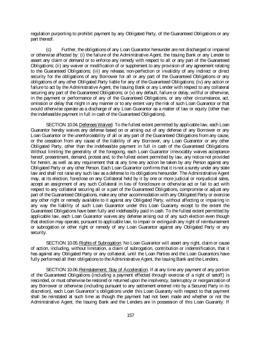 regulation purporting to prohibit payment by any Obligated Party, of the Guaranteed Obligations or any part thereof. (c) Further, the obligations of any Loan Guarantor hereunder are not discharged or impaired or otherwise affected by: (i) the failure of the Administrative Agent, the Issuing Bank or any Lender to assert any claim or demand or to enforce any remedy with respect to all or any part of the Guaranteed Obligations; (ii) any waiver or modification of or supplement to any provision of any agreement relating to the Guaranteed Obligations; (iii) any release, non-perfection or invalidity of any indirect or direct security for the obligations of any Borrower for all or any part of the Guaranteed Obligations or any obligations of any other Obligated Party liable for any of the Guaranteed Obligations; (iv) any action or failure to act by the Administrative Agent, the Issuing Bank or any Lender with respect to any collateral securing any part of the Guaranteed Obligations; or (v) any default, failure or delay, willful or otherwise, in the payment or performance of any of the Guaranteed Obligations, or any other circumstance, act, omission or delay that might in any manner or to any extent vary the risk of such Loan Guarantor or that would otherwise operate as a discharge of any Loan Guarantor as a matter of law or equity (other than the indefeasible payment in full in cash of the Guaranteed Obligations). SECTION 10.04.Defenses Waived. To the fullest extent permitted by applicable law, each Loan Guarantor hereby waives any defense based on or arising out of any defense of any Borrower or any Loan Guarantor or the unenforceability of all or any part of the Guaranteed Obligations from any cause, or the cessation from any cause of the liability of any Borrower, any Loan Guarantor or any other Obligated Party, other than the indefeasible payment in full in cash of the Guaranteed Obligations. Without limiting the generality of the foregoing, each Loan Guarantor irrevocably waives acceptance hereof, presentment, demand, protest and, to the fullest extent permitted by law, any notice not provided for herein, as well as any requirement that at any time any action be taken by any Person against any Obligated Party or any other Person. Each Loan Guarantor confirms that it is not a surety under any state law and shall not raise any such law as a defense to its obligations hereunder. The Administrative Agent may, at its election, foreclose on any Collateral held by it by one or more judicial or nonjudicial sales, accept an assignment of any such Collateral in lieu of foreclosure or otherwise act or fail to act with respect to any collateral securing all or a part of the Guaranteed Obligations, compromise or adjust any part of the Guaranteed Obligations, make any other accommodation with any Obligated Party or exercise any other right or remedy available to it against any Obligated Party, without affecting or impairing in any way the liability of such Loan Guarantor under this Loan Guaranty except to the extent the Guaranteed Obligations have been fully and indefeasibly paid in cash. To the fullest extent permitted by applicable law, each Loan Guarantor waives any defense arising out of any such election even though that election may operate, pursuant to applicable law, to impair or extinguish any right of reimbursement or subrogation or other right or remedy of any Loan Guarantor against any Obligated Party or any security. SECTION 10.05.Rights of Subrogation. No Loan Guarantor will assert any right, claim or cause of action, including, without limitation, a claim of subrogation, contribution or indemnification, that it has against any Obligated Party or any collateral, until the Loan Parties and the Loan Guarantors have fully performed all their obligations to the Administrative Agent, the Issuing Bank and the Lenders. SECTION 10.06.Reinstatement; Stay of Acceleration. If at any time any payment of any portion of the Guaranteed Obligations (including a payment effected through exercise of a right of setoff) is rescinded, or must otherwise be restored or returned upon the insolvency, bankruptcy or reorganization of any Borrower or otherwise (including pursuant to any settlement entered into by a Secured Party in its discretion), each Loan Guarantor’s obligations under this Loan Guaranty with respect to that payment shall be reinstated at such time as though the payment had not been made and whether or not the Administrative Agent, the Issuing Bank and the Lenders are in possession of this Loan Guaranty. If 157