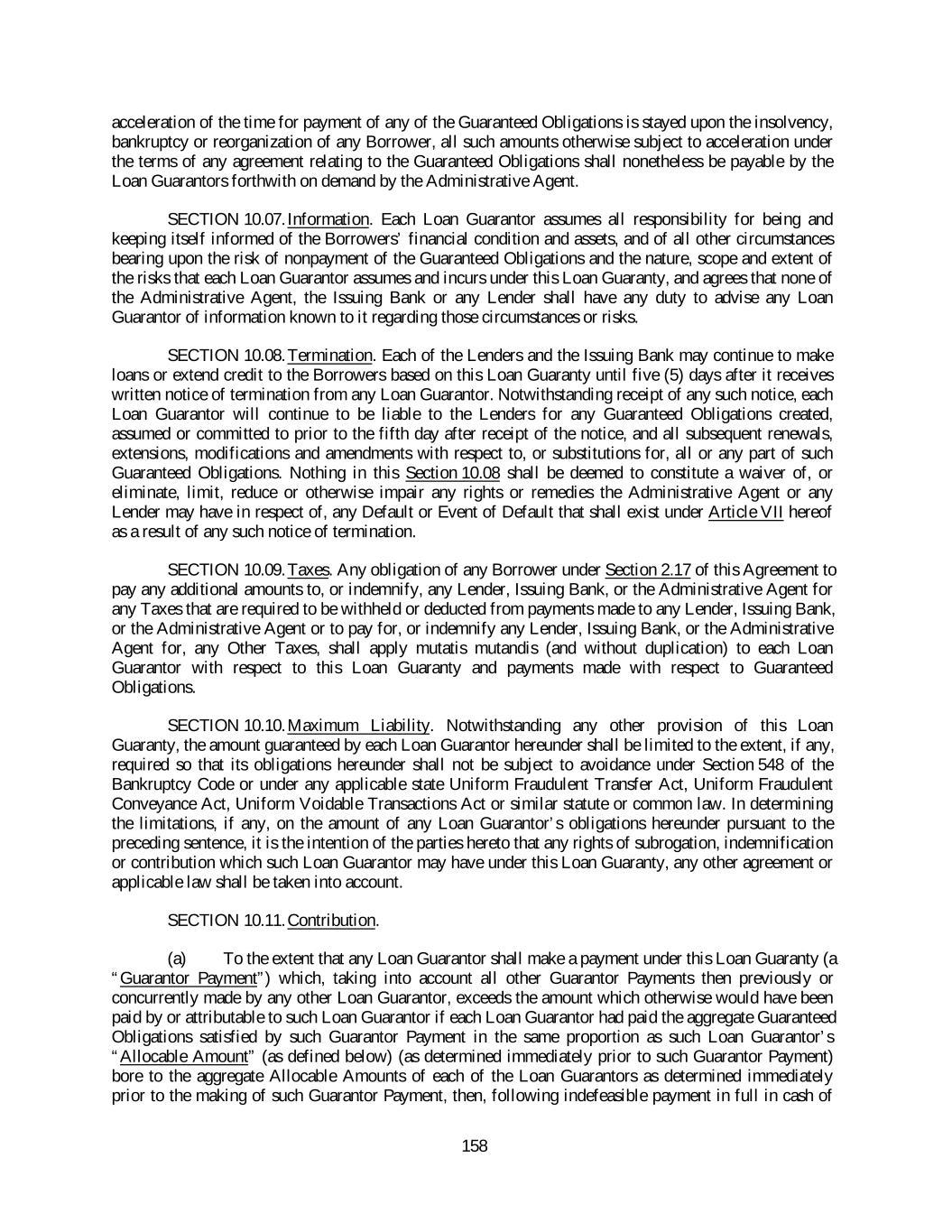 acceleration of the time for payment of any of the Guaranteed Obligations is stayed upon the insolvency, bankruptcy or reorganization of any Borrower, all such amounts otherwise subject to acceleration under the terms of any agreement relating to the Guaranteed Obligations shall nonetheless be payable by the Loan Guarantors forthwith on demand by the Administrative Agent. SECTION 10.07. Information. Each Loan Guarantor assumes all responsibility for being and keeping itself informed of the Borrowers’ financial condition and assets, and of all other circumstances bearing upon the risk of nonpayment of the Guaranteed Obligations and the nature, scope and extent of the risks that each Loan Guarantor assumes and incurs under this Loan Guaranty, and agrees that none of the Administrative Agent, the Issuing Bank or any Lender shall have any duty to advise any Loan Guarantor of information known to it regarding those circumstances or risks. SECTION 10.08.Termination. Each of the Lenders and the Issuing Bank may continue to make loans or extend credit to the Borrowers based on this Loan Guaranty until five (5) days after it receives written notice of termination from any Loan Guarantor. Notwithstanding receipt of any such notice, each Loan Guarantor will continue to be liable to the Lenders for any Guaranteed Obligations created, assumed or committed to prior to the fifth day after receipt of the notice, and all subsequent renewals, extensions, modifications and amendments with respect to, or substitutions for, all or any part of such Guaranteed Obligations. Nothing in this Section 10.08 shall be deemed to constitute a waiver of, or eliminate, limit, reduce or otherwise impair any rights or remedies the Administrative Agent or any Lender may have in respect of, any Default or Event of Default that shall exist under Article VII hereof as a result of any such notice of termination. SECTION 10.09.Taxes. Any obligation of any Borrower under Section 2.17 of this Agreement to pay any additional amounts to, or indemnify, any Lender, Issuing Bank, or the Administrative Agent for any Taxes that are required to be withheld or deducted from payments made to any Lender, Issuing Bank, or the Administrative Agent or to pay for, or indemnify any Lender, Issuing Bank, or the Administrative Agent for, any Other Taxes, shall apply mutatis mutandis (and without duplication) to each Loan Guarantor with respect to this Loan Guaranty and payments made with respect to Guaranteed Obligations. SECTION 10.10.Maximum Liability. Notwithstanding any other provision of this Loan Guaranty, the amount guaranteed by each Loan Guarantor hereunder shall be limited to the extent, if any, required so that its obligations hereunder shall not be subject to avoidance under Section 548 of the Bankruptcy Code or under any applicable state Uniform Fraudulent Transfer Act, Uniform Fraudulent Conveyance Act, Uniform Voidable Transactions Act or similar statute or common law. In determining the limitations, if any, on the amount of any Loan Guarantor’s obligations hereunder pursuant to the preceding sentence, it is the intention of the parties hereto that any rights of subrogation, indemnification or contribution which such Loan Guarantor may have under this Loan Guaranty, any other agreement or applicable law shall be taken into account. SECTION 10.11.Contribution. (a) To the extent that any Loan Guarantor shall make a payment under this Loan Guaranty (a “Guarantor Payment”) which, taking into account all other Guarantor Payments then previously or concurrently made by any other Loan Guarantor, exceeds the amount which otherwise would have been paid by or attributable to such Loan Guarantor if each Loan Guarantor had paid the aggregate Guaranteed Obligations satisfied by such Guarantor Payment in the same proportion as such Loan Guarantor’s “Allocable Amount” (as defined below) (as determined immediately prior to such Guarantor Payment) bore to the aggregate Allocable Amounts of each of the Loan Guarantors as determined immediately prior to the making of such Guarantor Payment, then, following indefeasible payment in full in cash of 158