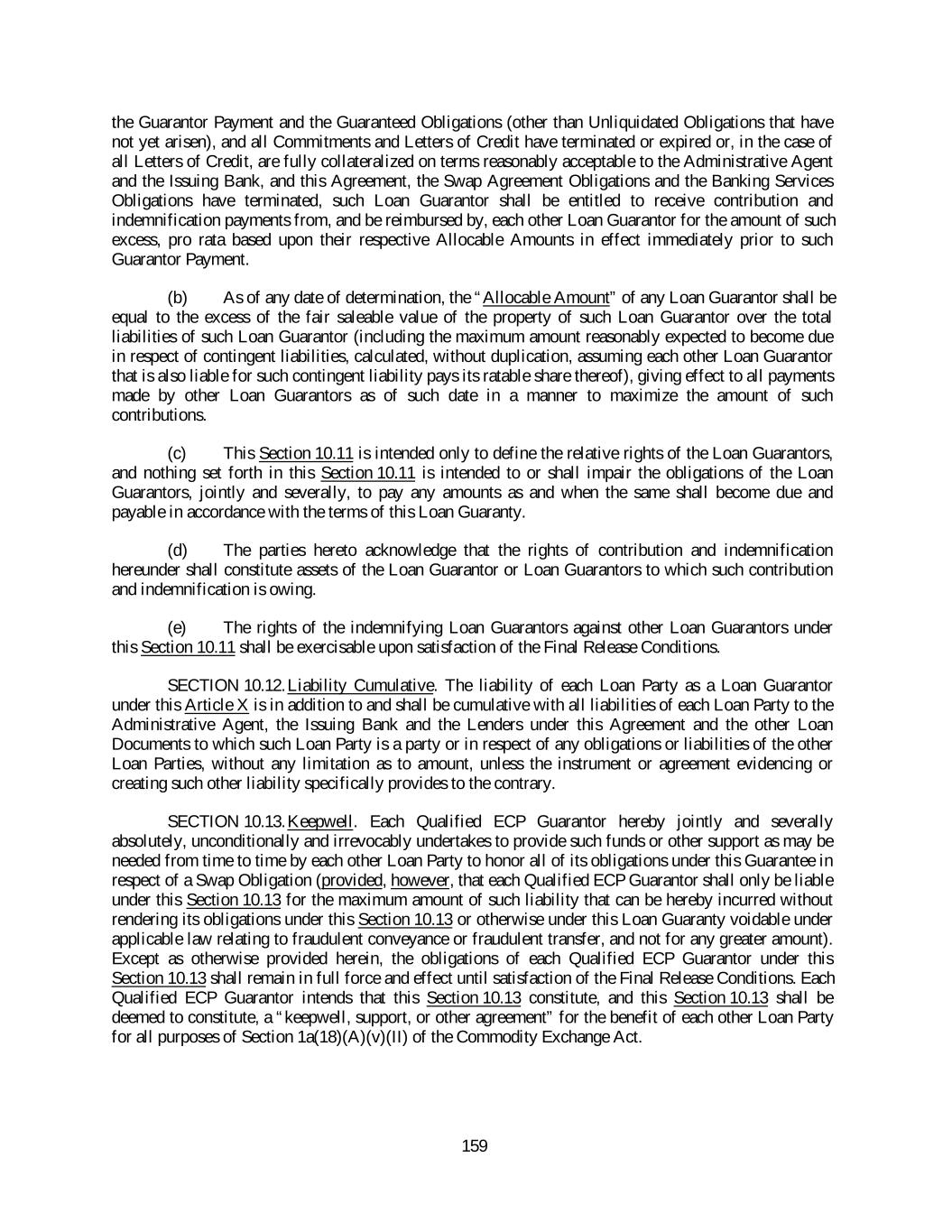 the Guarantor Payment and the Guaranteed Obligations (other than Unliquidated Obligations that have not yet arisen), and all Commitments and Letters of Credit have terminated or expired or, in the case of all Letters of Credit, are fully collateralized on terms reasonably acceptable to the Administrative Agent and the Issuing Bank, and this Agreement, the Swap Agreement Obligations and the Banking Services Obligations have terminated, such Loan Guarantor shall be entitled to receive contribution and indemnification payments from, and be reimbursed by, each other Loan Guarantor for the amount of such excess, pro rata based upon their respective Allocable Amounts in effect immediately prior to such Guarantor Payment. (b) As of any date of determination, the “Allocable Amount” of any Loan Guarantor shall be equal to the excess of the fair saleable value of the property of such Loan Guarantor over the total liabilities of such Loan Guarantor (including the maximum amount reasonably expected to become due in respect of contingent liabilities, calculated, without duplication, assuming each other Loan Guarantor that is also liable for such contingent liability pays its ratable share thereof), giving effect to all payments made by other Loan Guarantors as of such date in a manner to maximize the amount of such contributions. (c) This Section 10.11 is intended only to define the relative rights of the Loan Guarantors, and nothing set forth in this Section 10.11 is intended to or shall impair the obligations of the Loan Guarantors, jointly and severally, to pay any amounts as and when the same shall become due and payable in accordance with the terms of this Loan Guaranty. (d) The parties hereto acknowledge that the rights of contribution and indemnification hereunder shall constitute assets of the Loan Guarantor or Loan Guarantors to which such contribution and indemnification is owing. (e) The rights of the indemnifying Loan Guarantors against other Loan Guarantors under this Section 10.11 shall be exercisable upon satisfaction of the Final Release Conditions. SECTION 10.12.Liability Cumulative. The liability of each Loan Party as a Loan Guarantor under this Article X is in addition to and shall be cumulative with all liabilities of each Loan Party to the Administrative Agent, the Issuing Bank and the Lenders under this Agreement and the other Loan Documents to which such Loan Party is a party or in respect of any obligations or liabilities of the other Loan Parties, without any limitation as to amount, unless the instrument or agreement evidencing or creating such other liability specifically provides to the contrary. SECTION 10.13.Keepwell. Each Qualified ECP Guarantor hereby jointly and severally absolutely, unconditionally and irrevocably undertakes to provide such funds or other support as may be needed from time to time by each other Loan Party to honor all of its obligations under this Guarantee in respect of a Swap Obligation (provided, however, that each Qualified ECP Guarantor shall only be liable under this Section 10.13 for the maximum amount of such liability that can be hereby incurred without rendering its obligations under this Section 10.13 or otherwise under this Loan Guaranty voidable under applicable law relating to fraudulent conveyance or fraudulent transfer, and not for any greater amount). Except as otherwise provided herein, the obligations of each Qualified ECP Guarantor under this Section 10.13 shall remain in full force and effect until satisfaction of the Final Release Conditions. Each Qualified ECP Guarantor intends that this Section 10.13 constitute, and this Section 10.13 shall be deemed to constitute, a “keepwell, support, or other agreement” for the benefit of each other Loan Party for all purposes of Section 1a(18)(A)(v)(II) of the Commodity Exchange Act. 159
