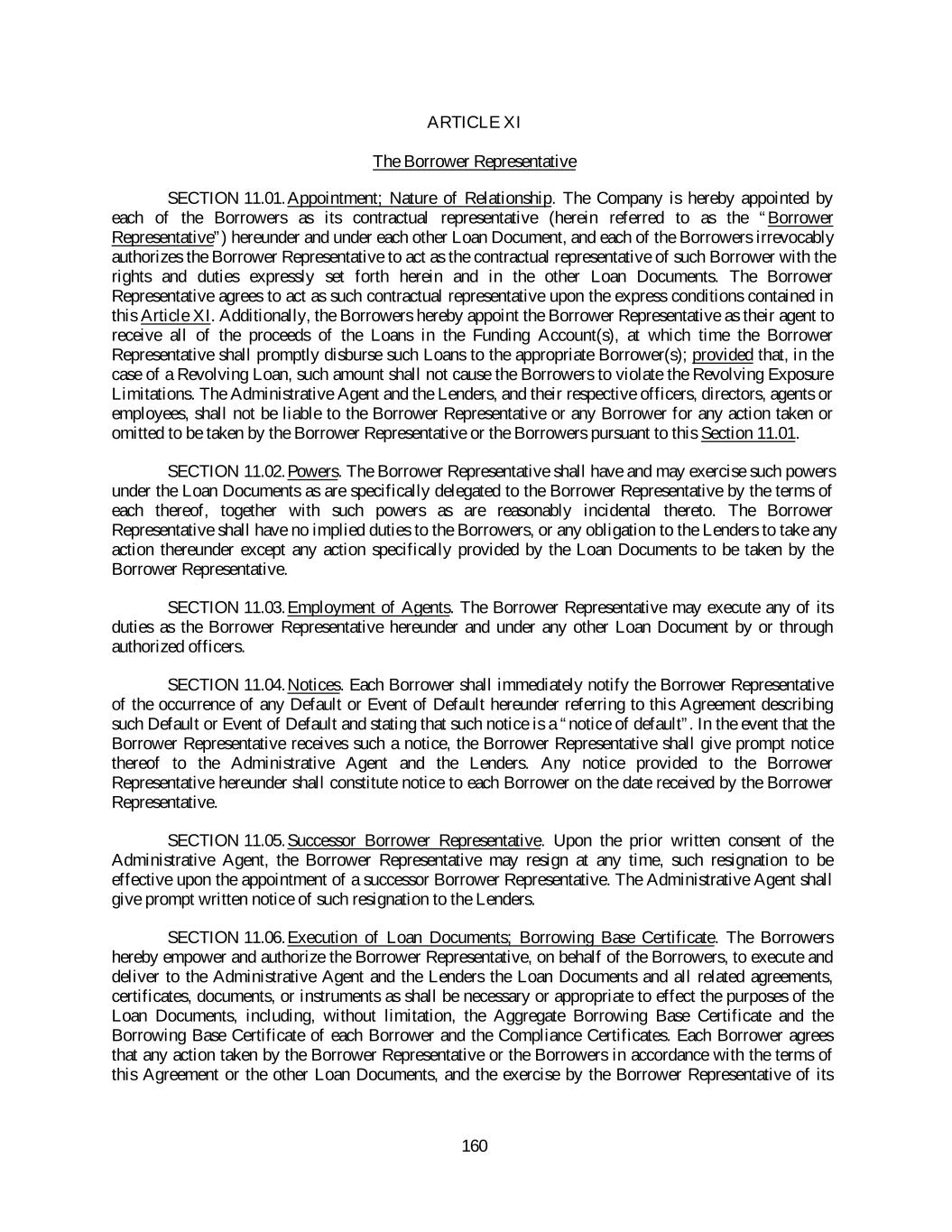 ARTICLE XI The Borrower Representative SECTION 11.01.Appointment; Nature of Relationship. The Company is hereby appointed by each of the Borrowers as its contractual representative (herein referred to as the “Borrower Representative”) hereunder and under each other Loan Document, and each of the Borrowers irrevocably authorizes the Borrower Representative to act as the contractual representative of such Borrower with the rights and duties expressly set forth herein and in the other Loan Documents. The Borrower Representative agrees to act as such contractual representative upon the express conditions contained in this Article XI. Additionally, the Borrowers hereby appoint the Borrower Representative as their agent to receive all of the proceeds of the Loans in the Funding Account(s), at which time the Borrower Representative shall promptly disburse such Loans to the appropriate Borrower(s); provided that, in the case of a Revolving Loan, such amount shall not cause the Borrowers to violate the Revolving Exposure Limitations. The Administrative Agent and the Lenders, and their respective officers, directors, agents or employees, shall not be liable to the Borrower Representative or any Borrower for any action taken or omitted to be taken by the Borrower Representative or the Borrowers pursuant to this Section 11.01. SECTION 11.02.Powers. The Borrower Representative shall have and may exercise such powers under the Loan Documents as are specifically delegated to the Borrower Representative by the terms of each thereof, together with such powers as are reasonably incidental thereto. The Borrower Representative shall have no implied duties to the Borrowers, or any obligation to the Lenders to take any action thereunder except any action specifically provided by the Loan Documents to be taken by the Borrower Representative. SECTION 11.03.Employment of Agents. The Borrower Representative may execute any of its duties as the Borrower Representative hereunder and under any other Loan Document by or through authorized officers. SECTION 11.04.Notices. Each Borrower shall immediately notify the Borrower Representative of the occurrence of any Default or Event of Default hereunder referring to this Agreement describing such Default or Event of Default and stating that such notice is a “notice of default”. In the event that the Borrower Representative receives such a notice, the Borrower Representative shall give prompt notice thereof to the Administrative Agent and the Lenders. Any notice provided to the Borrower Representative hereunder shall constitute notice to each Borrower on the date received by the Borrower Representative. SECTION 11.05.Successor Borrower Representative. Upon the prior written consent of the Administrative Agent, the Borrower Representative may resign at any time, such resignation to be effective upon the appointment of a successor Borrower Representative. The Administrative Agent shall give prompt written notice of such resignation to the Lenders. SECTION 11.06.Execution of Loan Documents; Borrowing Base Certificate. The Borrowers hereby empower and authorize the Borrower Representative, on behalf of the Borrowers, to execute and deliver to the Administrative Agent and the Lenders the Loan Documents and all related agreements, certificates, documents, or instruments as shall be necessary or appropriate to effect the purposes of the Loan Documents, including, without limitation, the Aggregate Borrowing Base Certificate and the Borrowing Base Certificate of each Borrower and the Compliance Certificates. Each Borrower agrees that any action taken by the Borrower Representative or the Borrowers in accordance with the terms of this Agreement or the other Loan Documents, and the exercise by the Borrower Representative of its 160